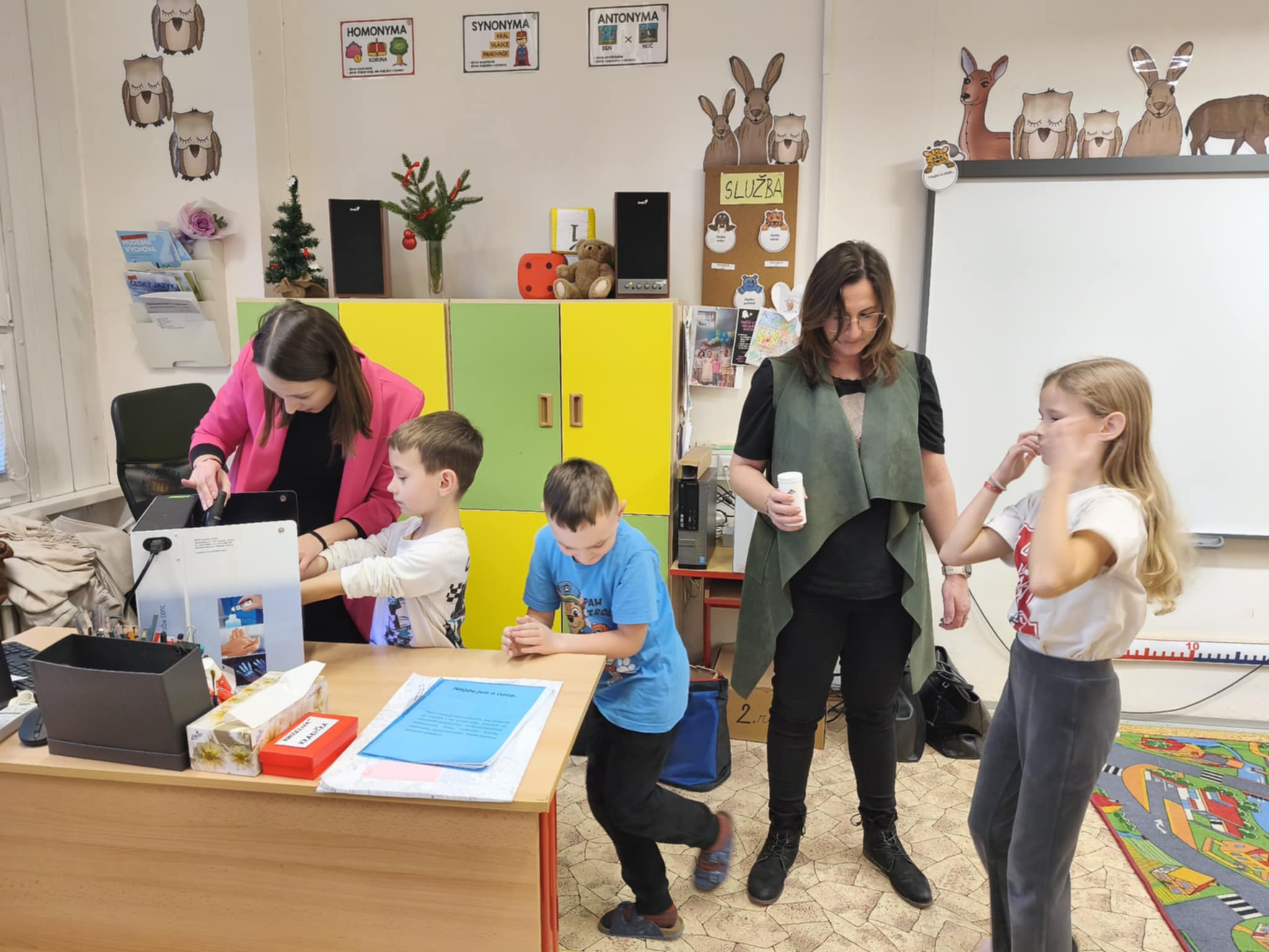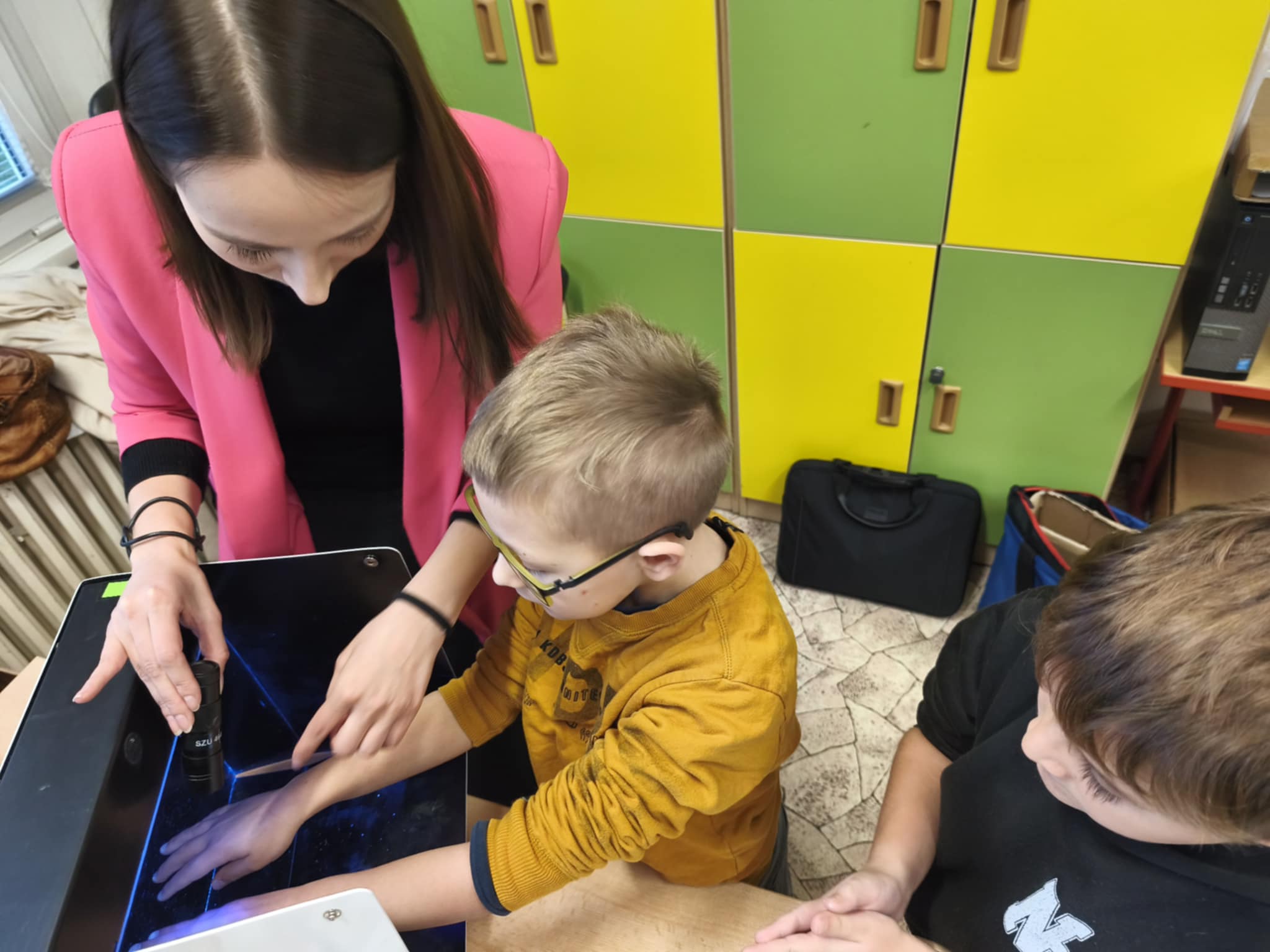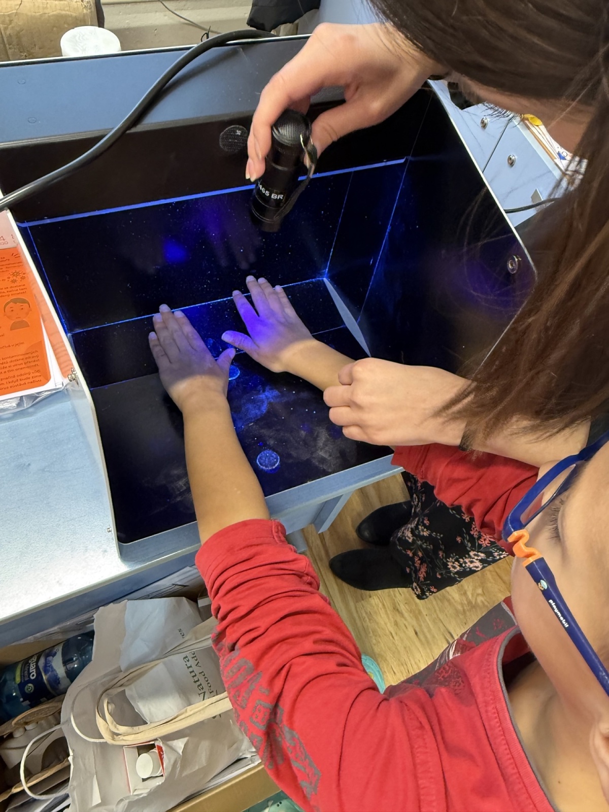 Velkým zážitkem byl pro děti speciální přístroj, který pomocí UV světla ukáže, zda jsou ruce opravdu dobře umyté. Žáci si nejprve ruce umyli a poté pod přístrojem zjistili, zda někde nezůstala „nečistá místa“. Tato praktická ukázka děti velmi bavila a zároveň jim pomohla uvědomit si, jak důkladné mytí je důležité.