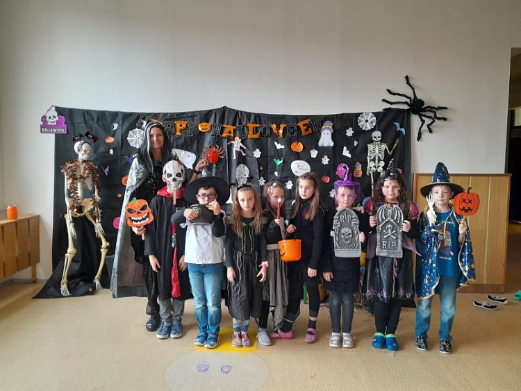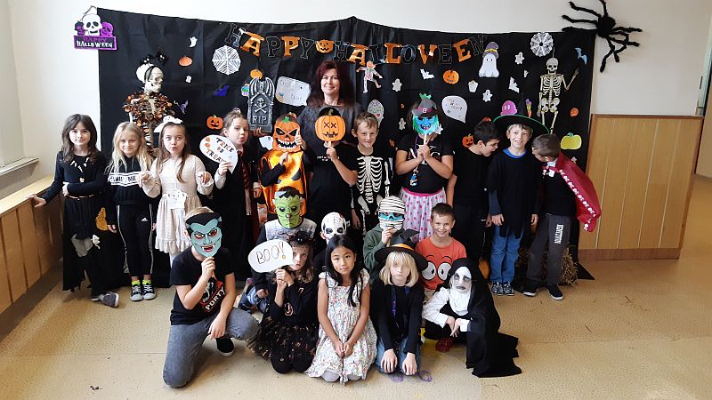 Takže i letos naši učitelé vyzdobili fotokoutek s tímto tématem, kde se postupně scházely různé masky dýní, duchů, pavoučích mužů a žen, upírů a upírek, jeptišek, jokerů, čarodějů, smrtek a jiných temných stvoření.
