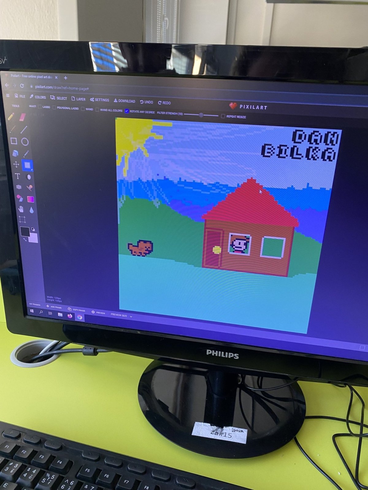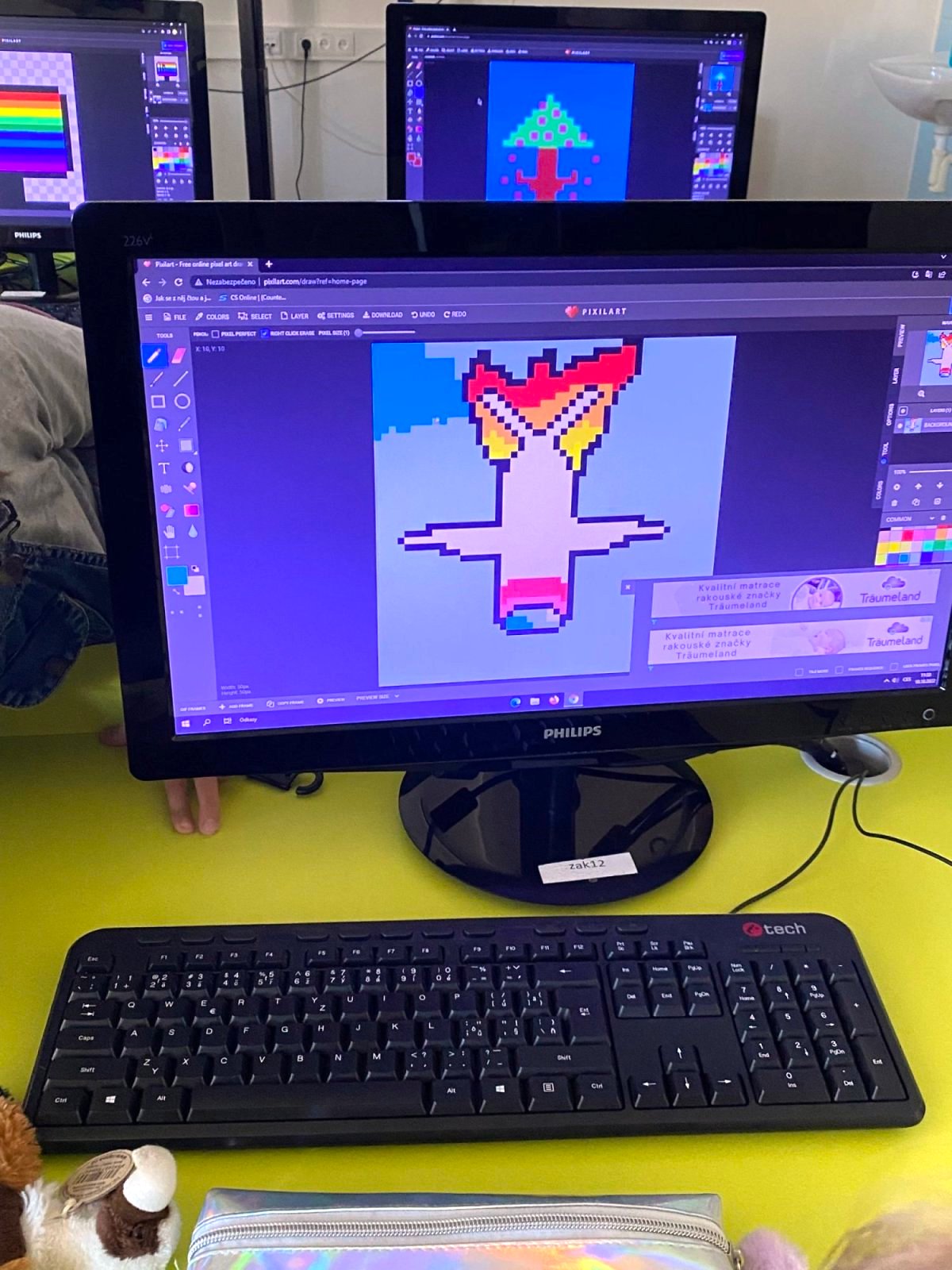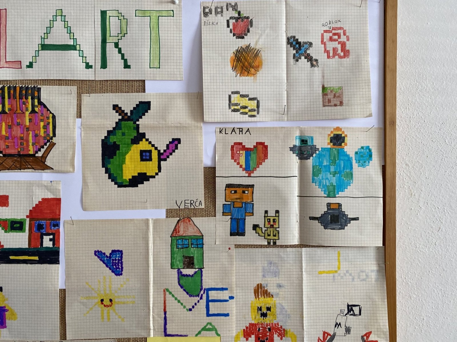 Taky už víme, že existuje druh počítačové grafiky s názvem Pixel art, kde se obrázky tvoří vyplňováním právě jednotlivých pixelů. A že nám tento druh umění nedělá vůbec žádné problémy, se můžete přesvědčit na obrázcích. Zkusili jsme si ho jak na papíře tak i v počítačovém prostředí.