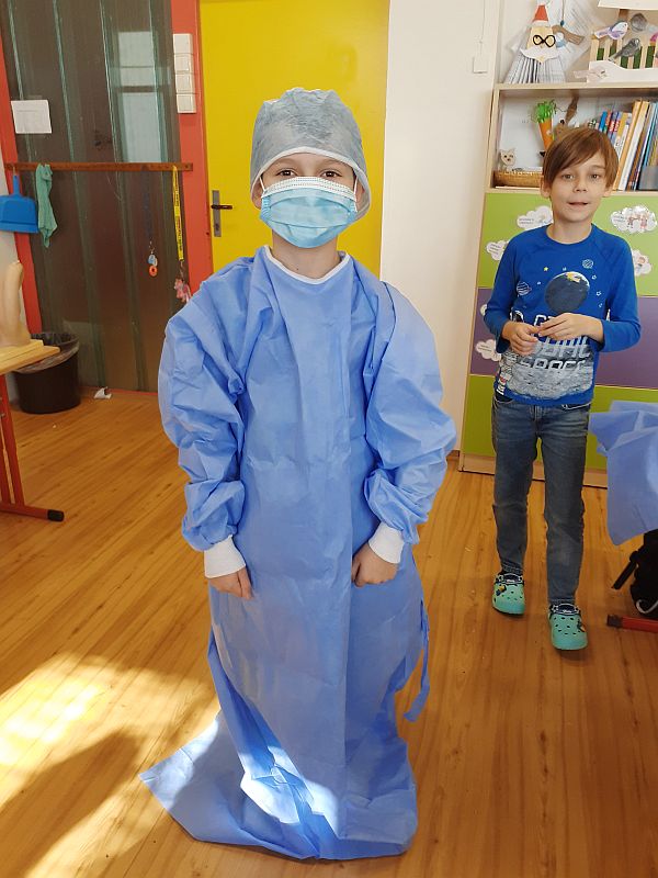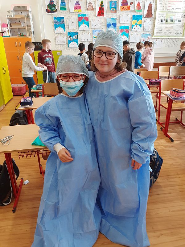 Žáci si mohli vyzkoušet operační plášť, zkusit obvázat "zraněného" kamaráda a poslechnout si tlukot jeho srdce.