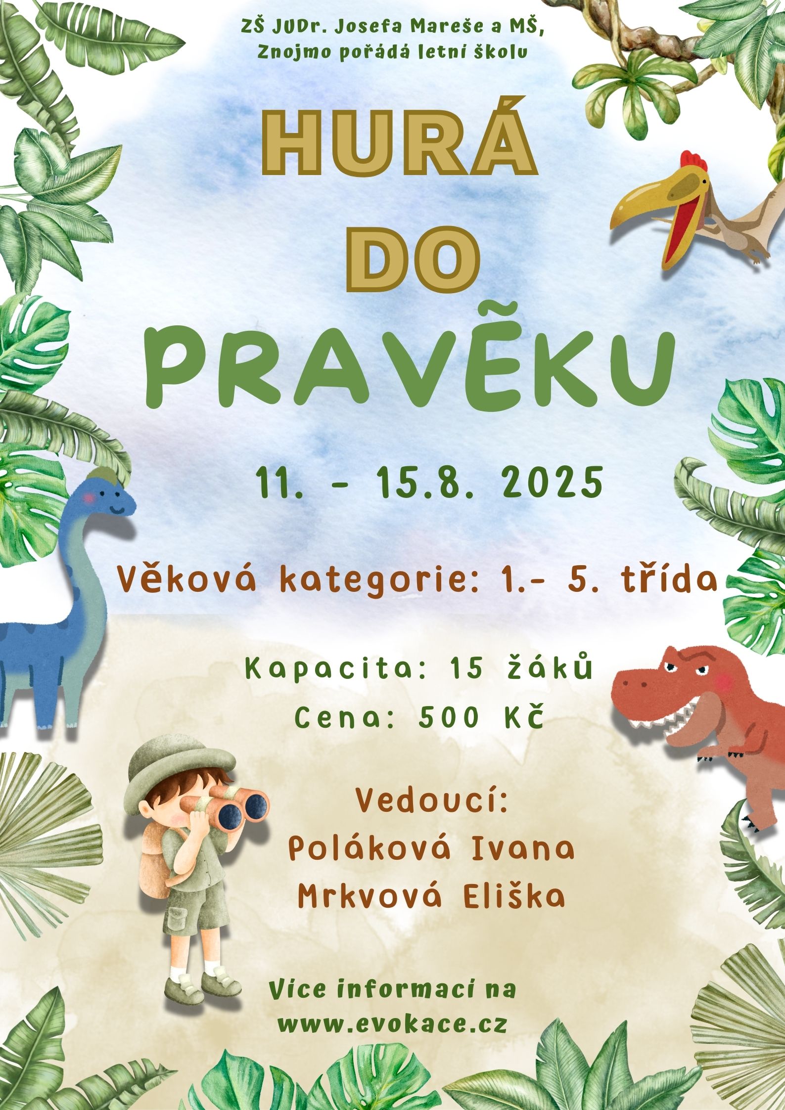 Zajímá vás, jak se žilo v pravěku? Pojďte s námi prozkoumat svět pravěkých lidí a dinosaurů! Vypravíme se na expedici do Dinoparku Vyškov, zahrajeme si na paleontology a vydáme se na honbu za pokladem. A samozřejmě si užijeme promítání filmu Jurský svět.