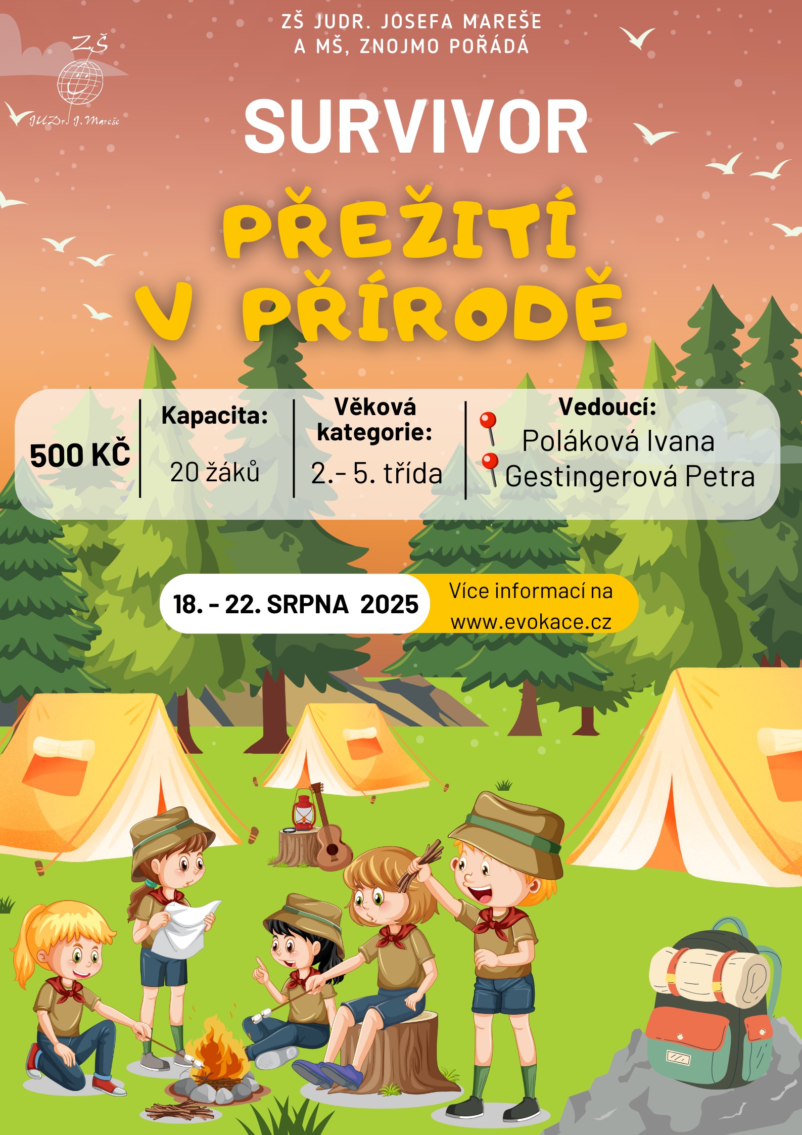 Zahrajeme si na dobrodruhy a přežívající! Budeme poznávat les a jeho obyvatele, vypravíme se na lukostřelbu, vyrobíme si ozdoby z přírodnin a opečeme si buřty. Naučíme se spoustu nových dovedností a posílíme kladný vztah k přírodě.