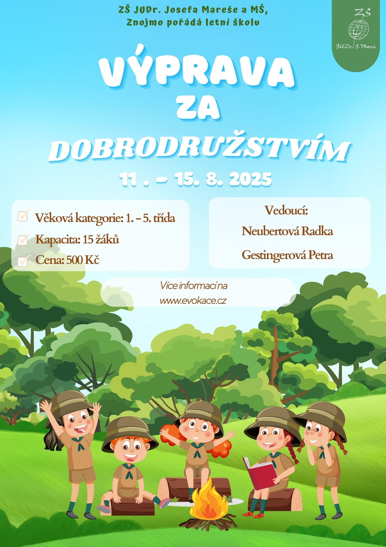Čeká nás týden plný dobrodružství! Prozkoumáme okolí Znojma i vzdálenější místa, navštívíme ZOO a Dinopark Vyškov, vyzkoušíme si jízdu na koních a projdeme zábavnou poznávací stezku v Gránickém údolí. Na závěr se odměníme kinem a zmrzlinou!