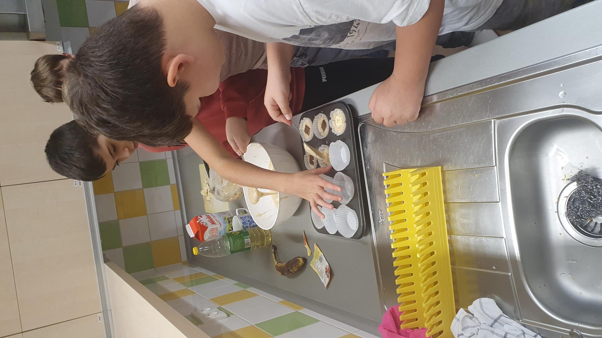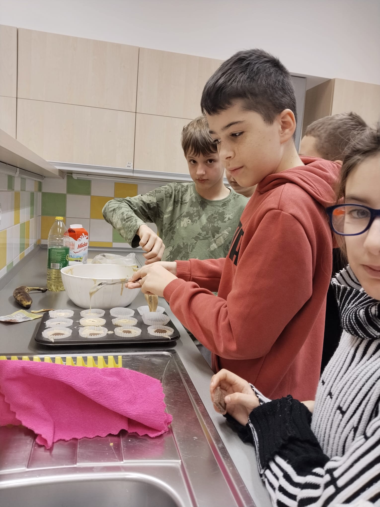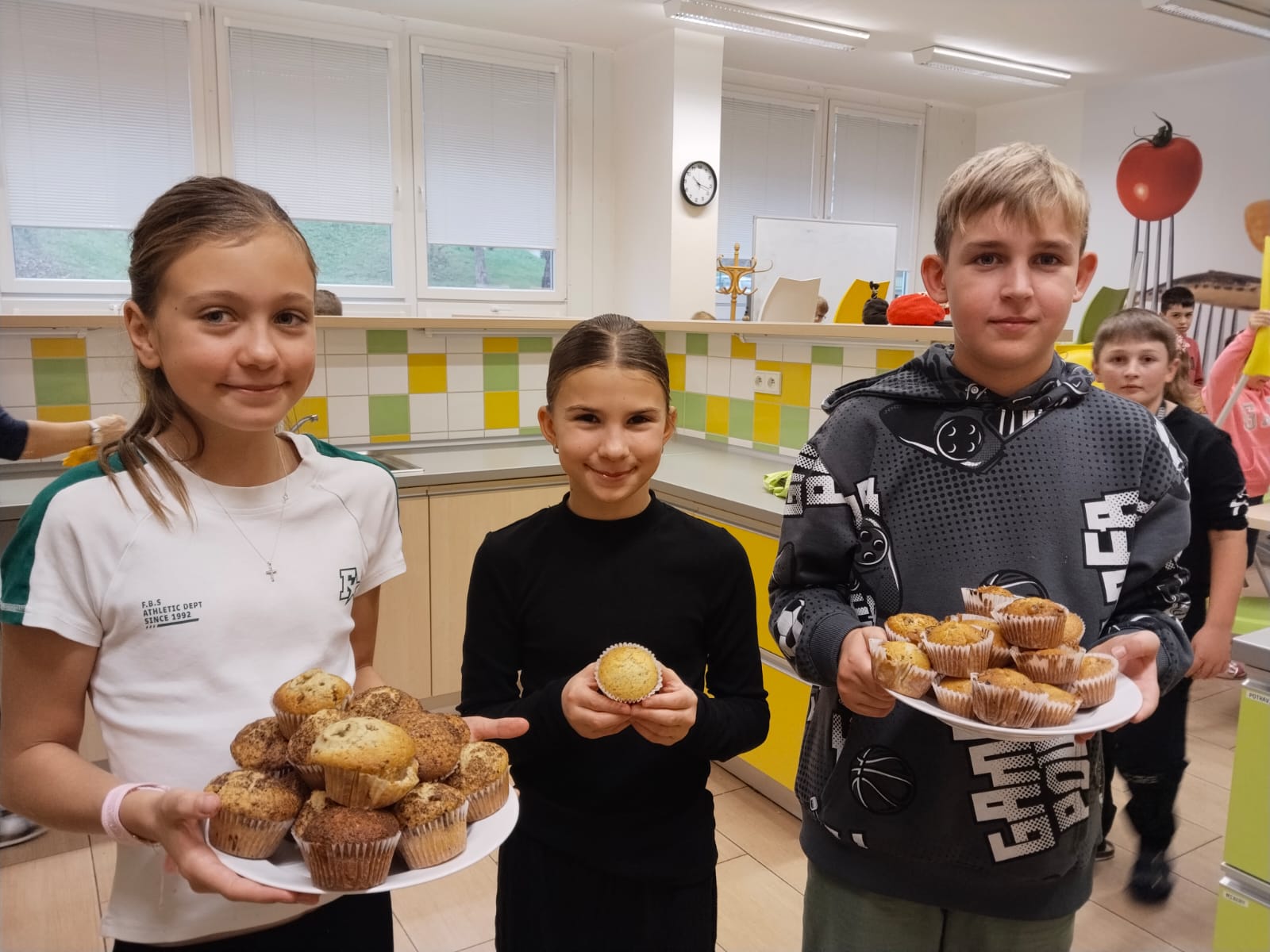 Ve středu se třída 5.D vydala do cvičné kuchyně, aby si vyzkoušela, jaké to je stát se na chvíli cukrářem. Dostali seznam surovin a dál už si museli poradit sami. A protože jsou šikovní, hned se pustili do práce. Všechno dali do mísy, míchali, přidávali a ochutnávali. Někteří si do těsta přidali banán, jiní čokoládu – fantazii se meze nekladly! No a muffiny byly na světě – opravdu se povedly! Pak už jen umýt nádobí, uklidit a hotovo. Těšíme se na další akci!
