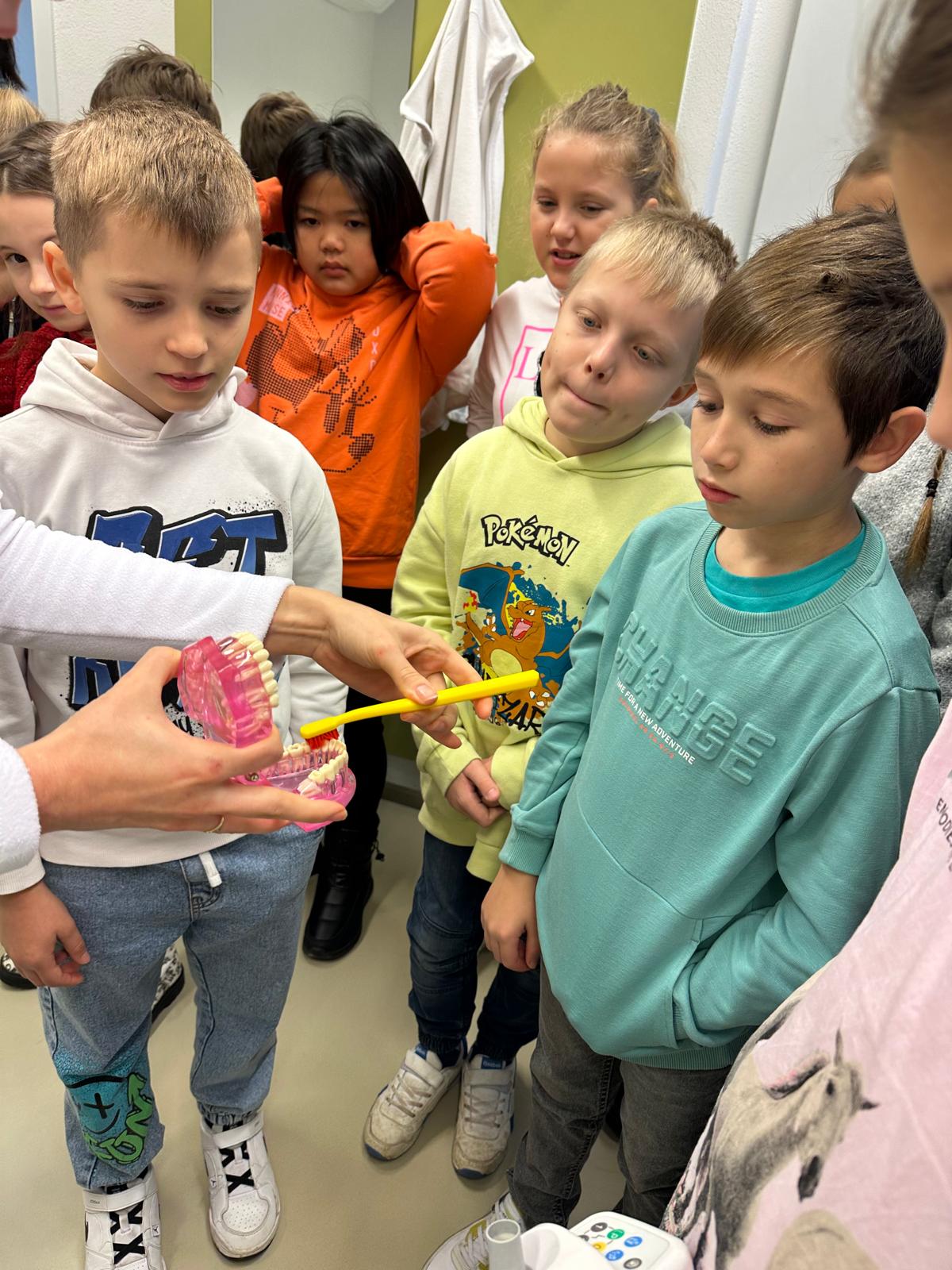 Paní hygienistka dětem vysvětlila, jak si správně čistit zuby, a ukázala jim správné techniky používání klasického zubního kartáčku. Zároveň se žáci seznámili i s dalšími pomůckami – jednosvazkovým kartáčkem, mezizubními kartáčky a zubní nití. Děti si tak mohly udělat obrázek o tom, jak důležité je starat se i o místa, na která běžný kartáček nedosáhne.