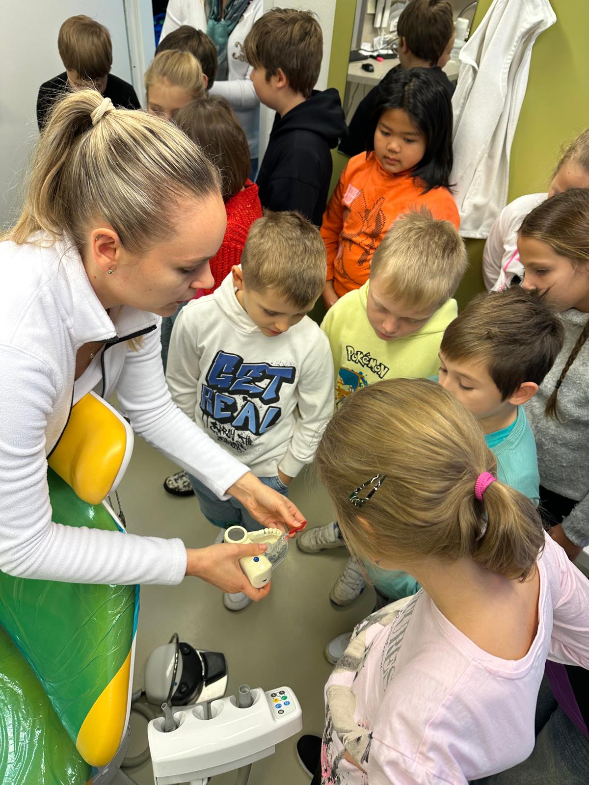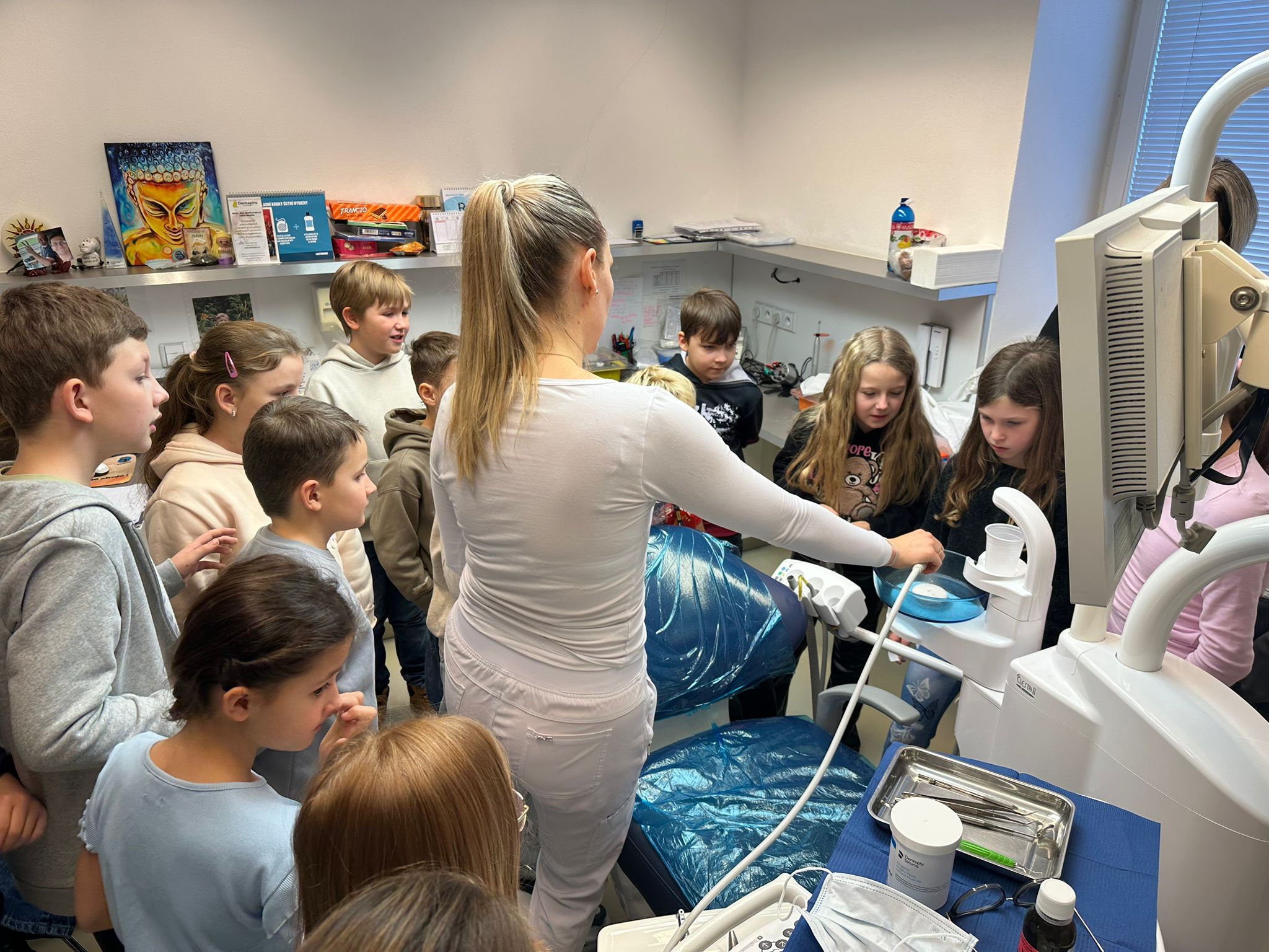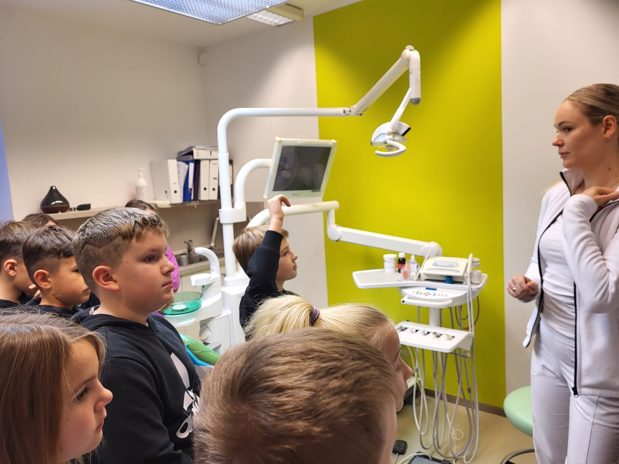 Návštěva pokračovala prohlídkou vybavení ordinace. Děti si mohly vyzkoušet, jak funguje doktorské křeslo, a paní hygienistka jim předvedla některé nástroje, kterými se vrtá zubní kaz nebo kterými zubaři zuby vytrhávají. Pro mnohé to byl vůbec první pohled na zubní nástroje zblízka.