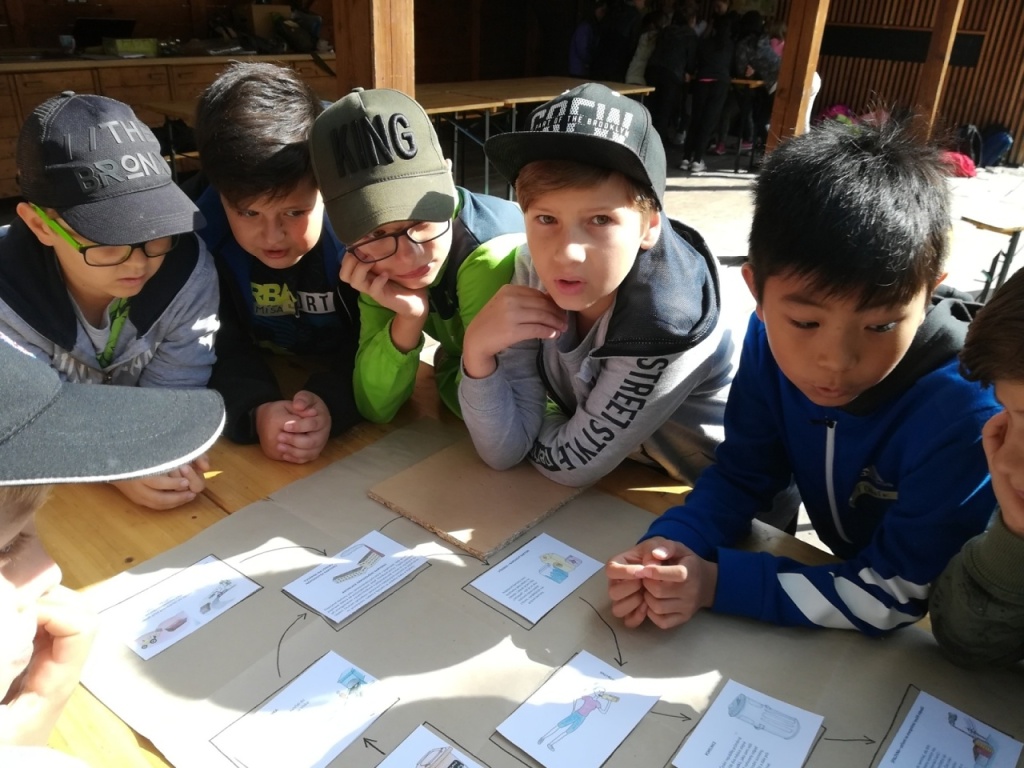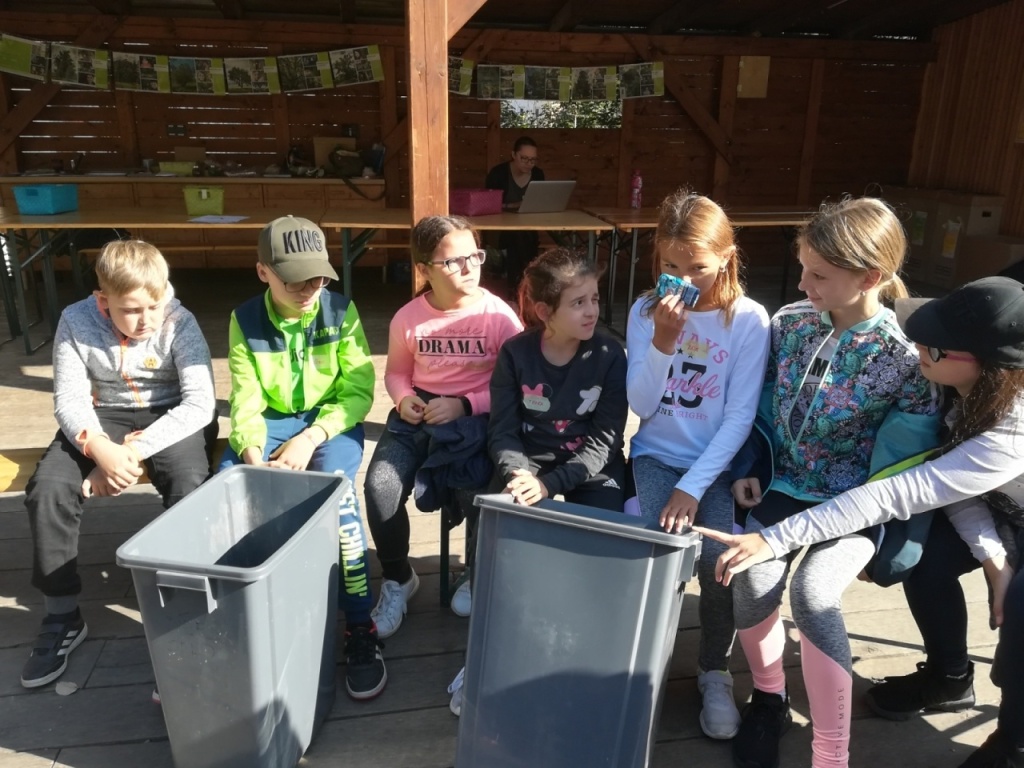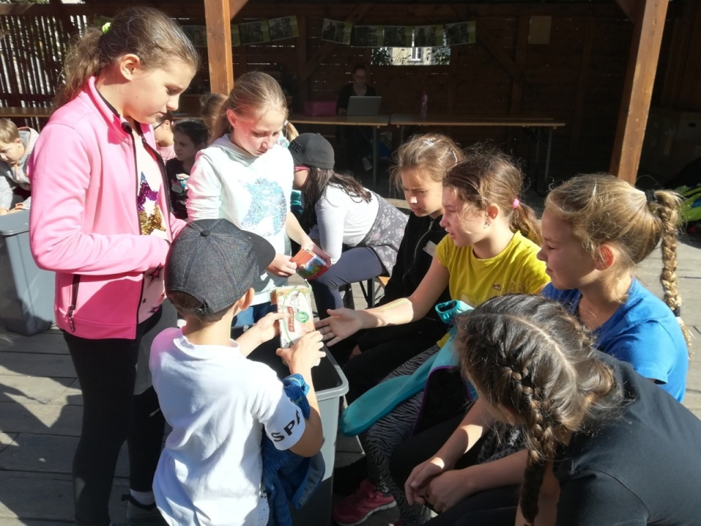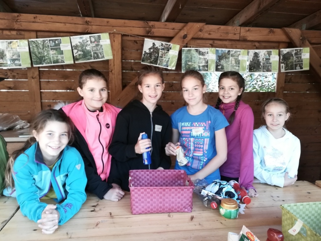 Nejprve se představily Anička a Lída, udělaly nám cedulky se jmény a rozdělily nás do skupin. Povídali jsme si o tom, jak máme třídit odpad. Sbírali jsme po zahradě odpadky a každá skupina musela podle svého odpadkového koše vypravovat, co to asi bylo za člověka. Také jsme museli jeho odpadky roztřídit. Potom jsme si povídali o koloběhu skla.