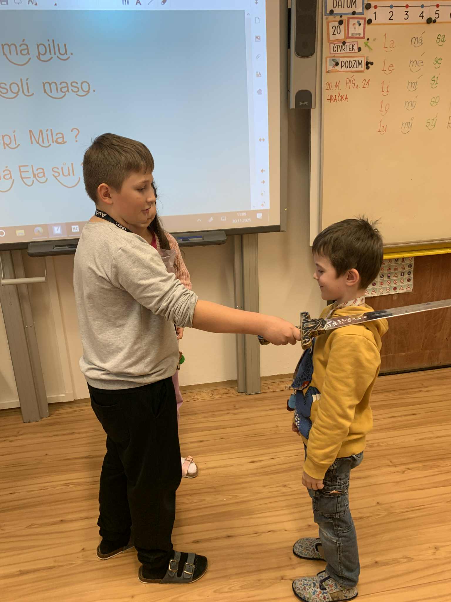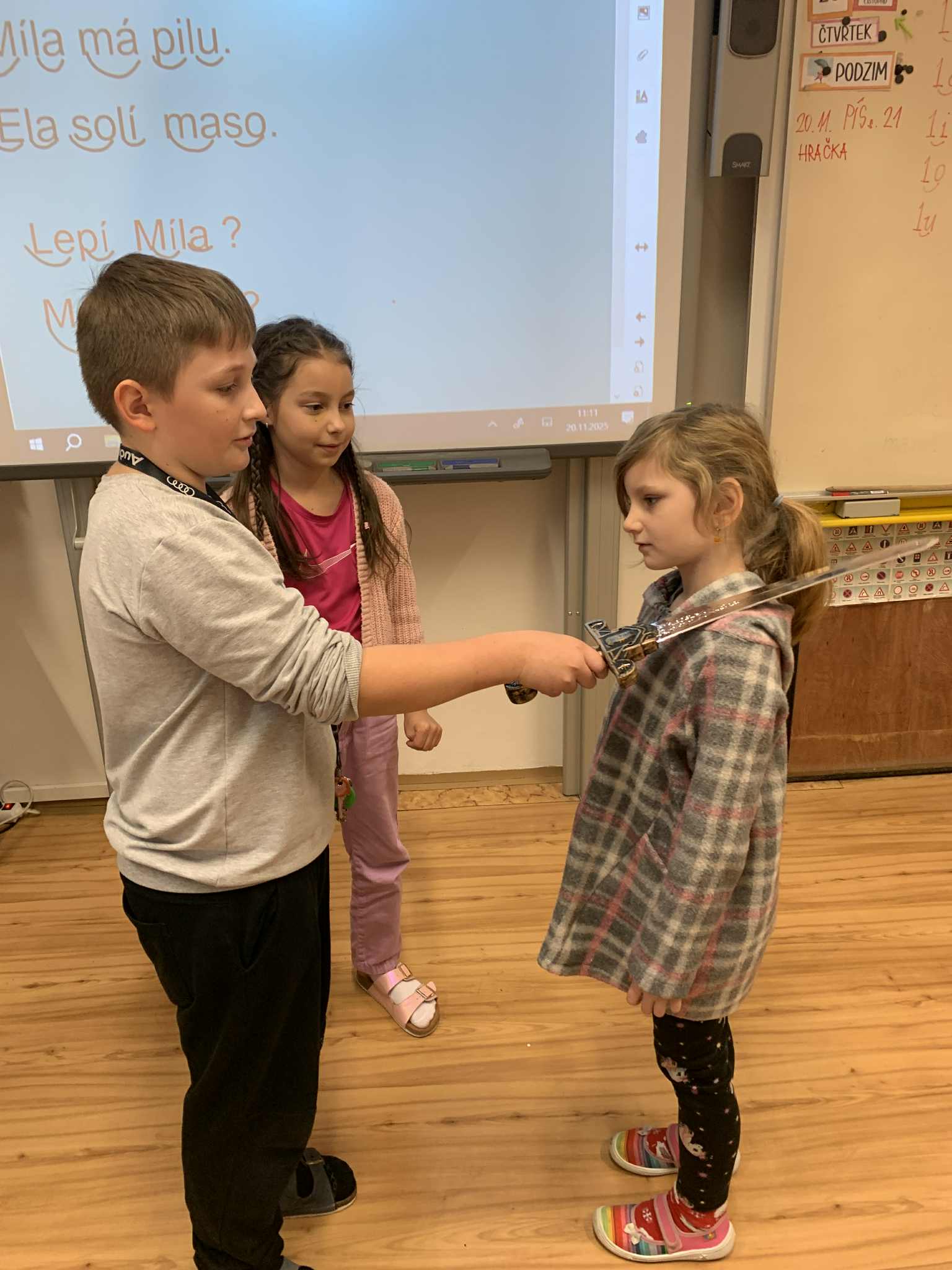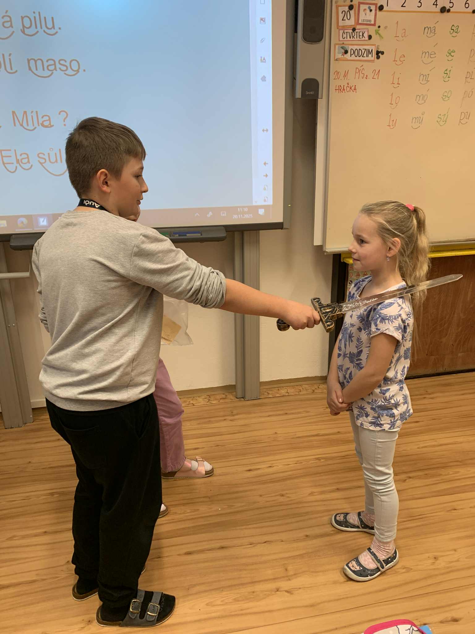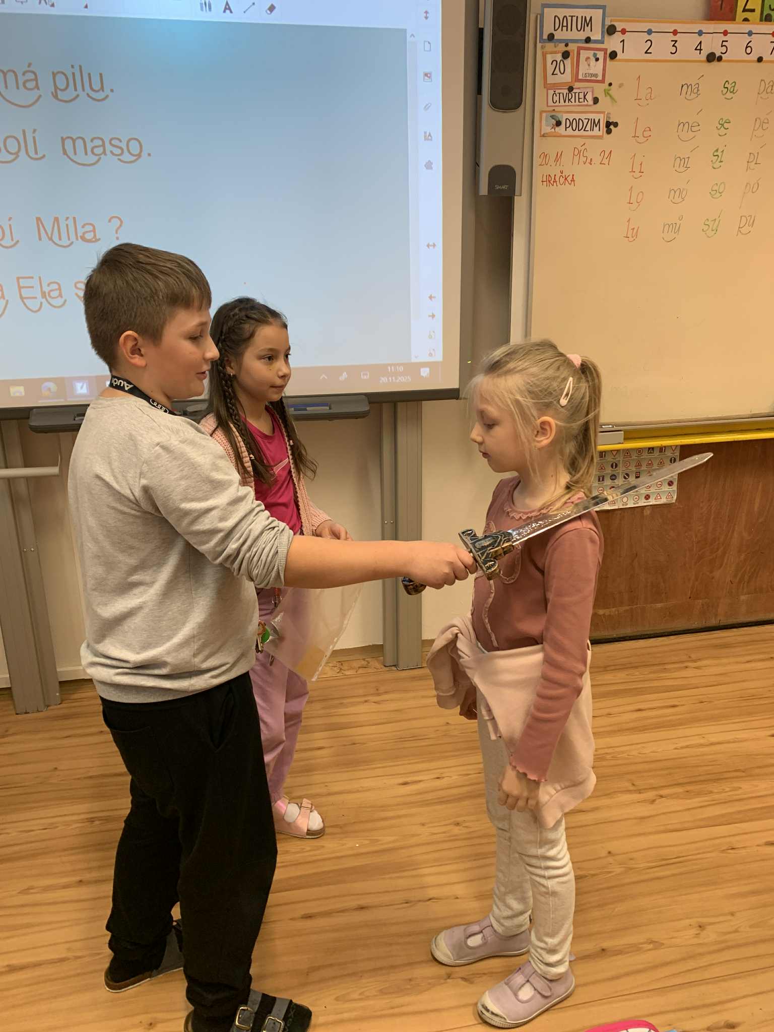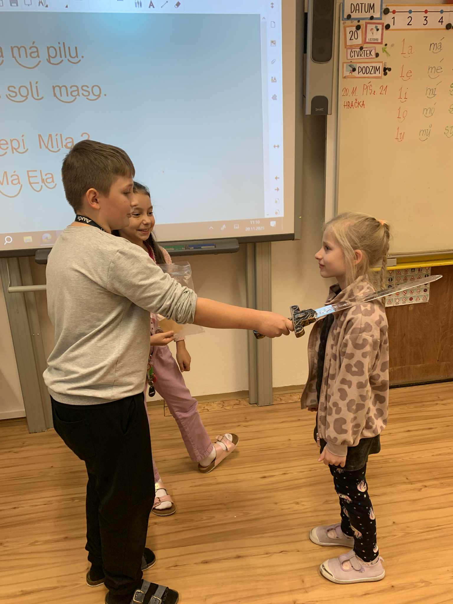 A protože už dočetly Živou abecedu, přišli jim kamarádi a kamarádky z 5.D slavnostně předat Slabikář a zároveň je pasovat na čtenáře. Tak jako rytíři musí překonávat překážky, tak i čtenáři potřebují pěstovat snahu a píli. A to naši malí čtenáři jistě budou, aby se kniha stala jejich věrným přítelem.