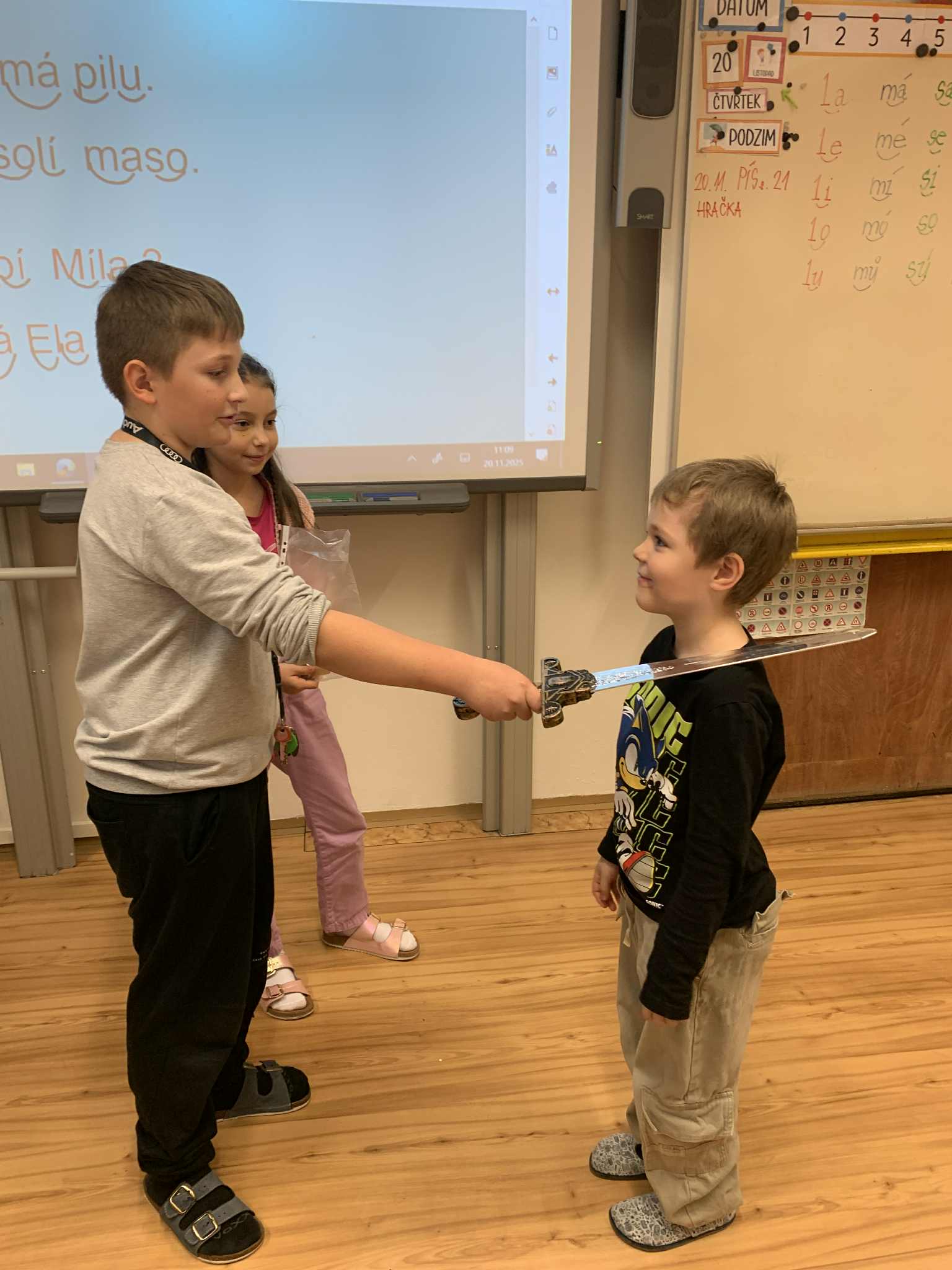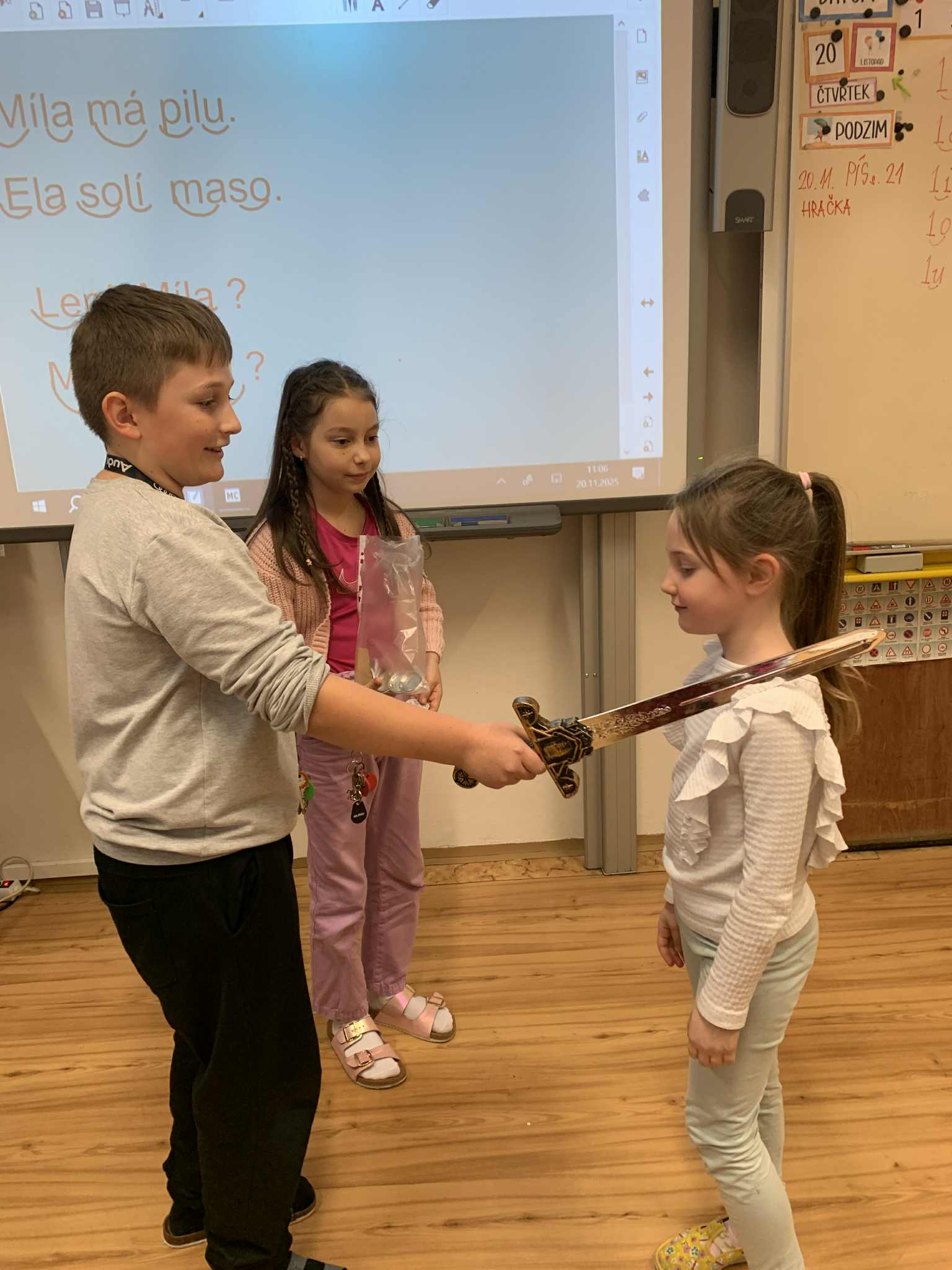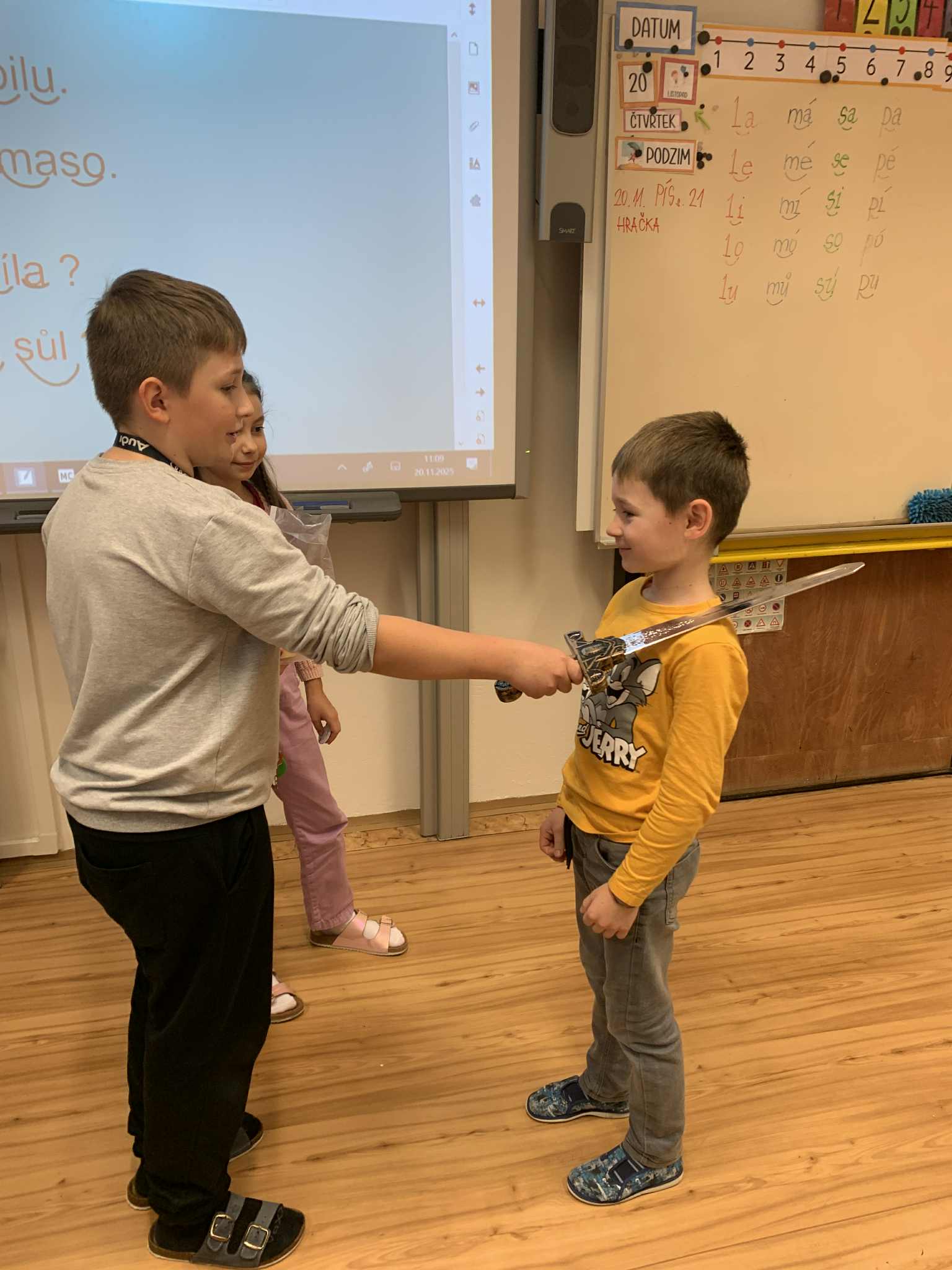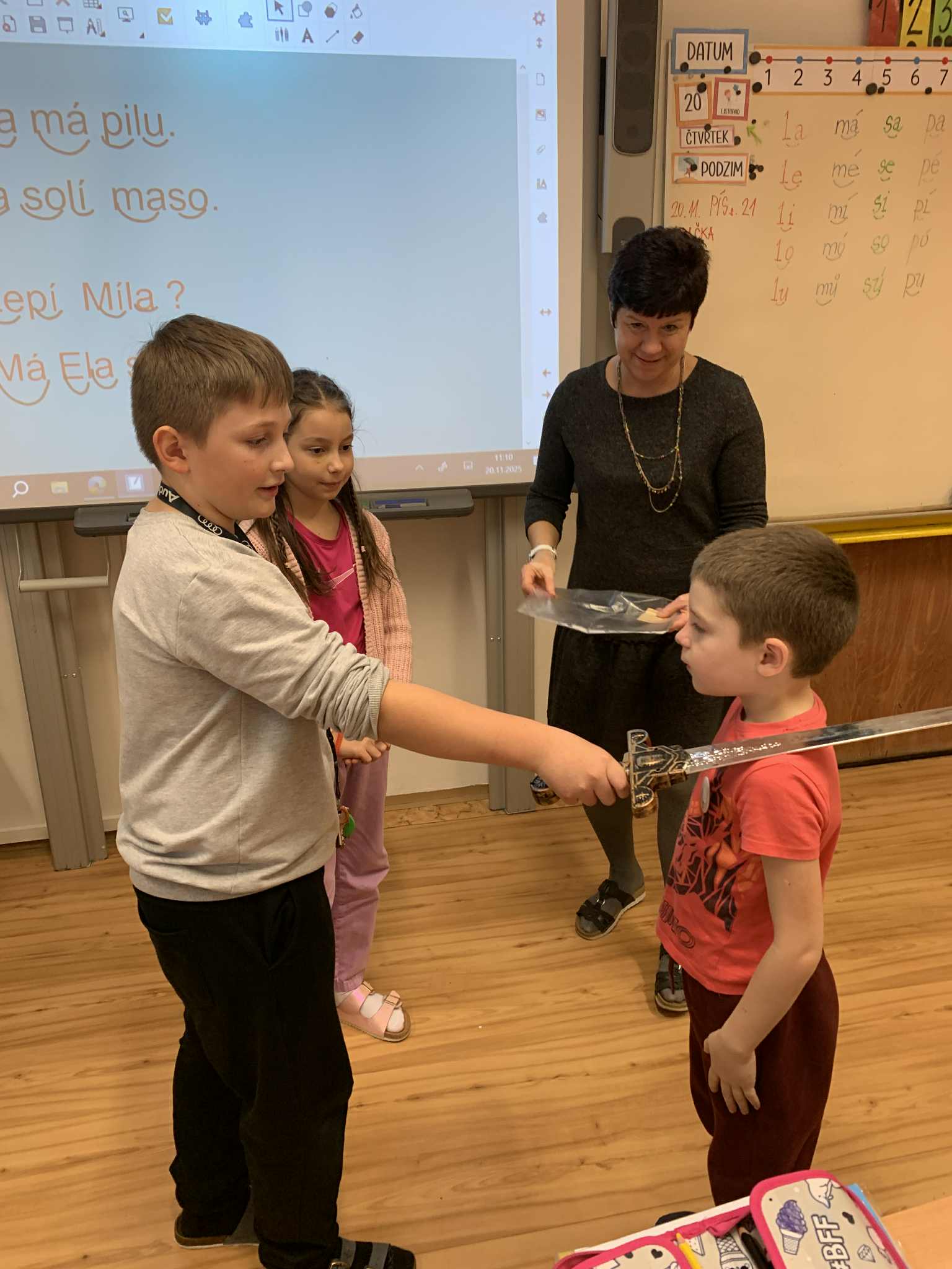 A protože už dočetly Živou abecedu, přišli jim kamarádi a kamarádky z 5.D slavnostně předat Slabikář a zároveň je pasovat na čtenáře. Tak jako rytíři musí překonávat překážky, tak i čtenáři potřebují pěstovat snahu a píli. A to naši malí čtenáři jistě budou, aby se kniha stala jejich věrným přítelem.