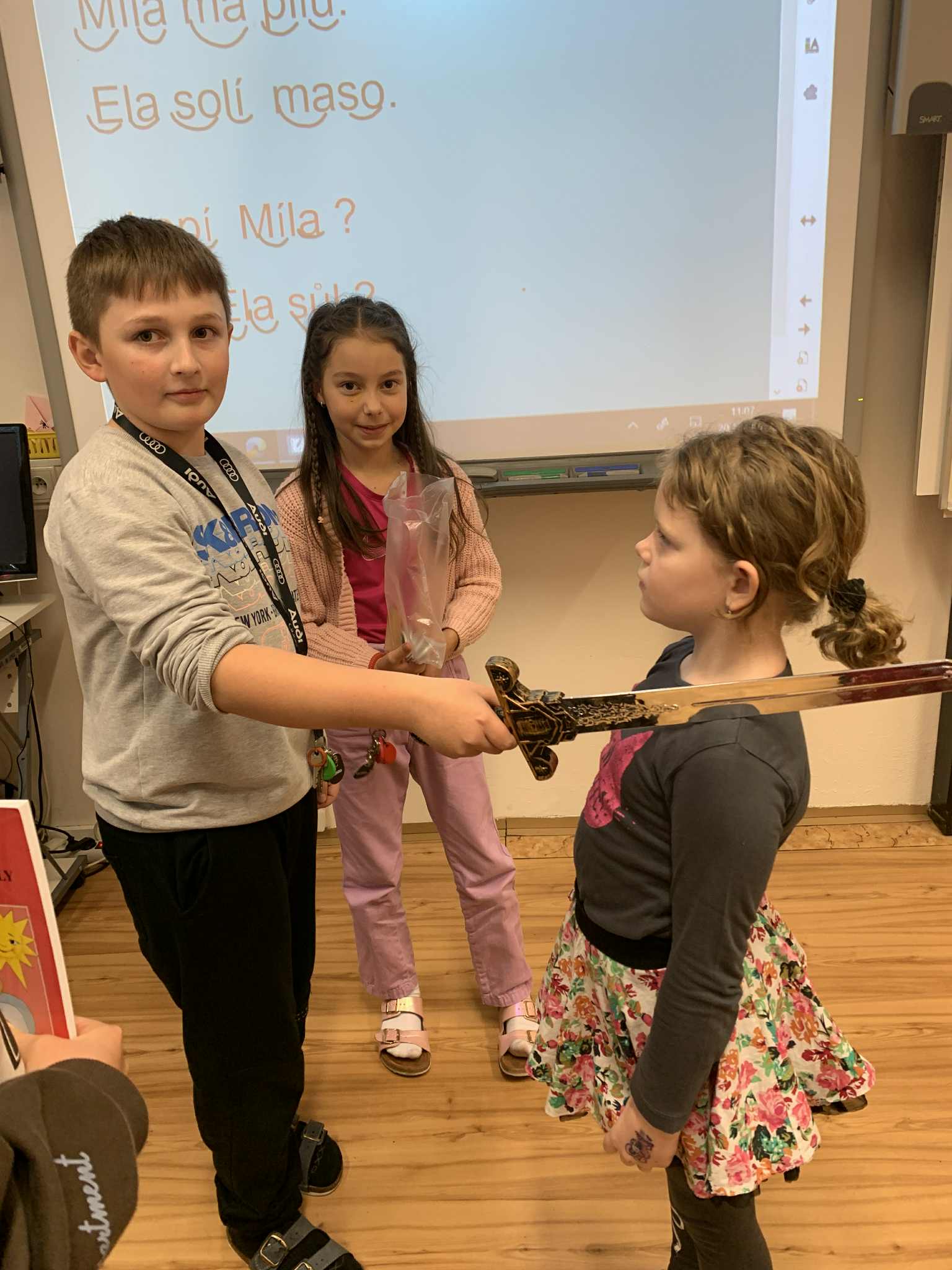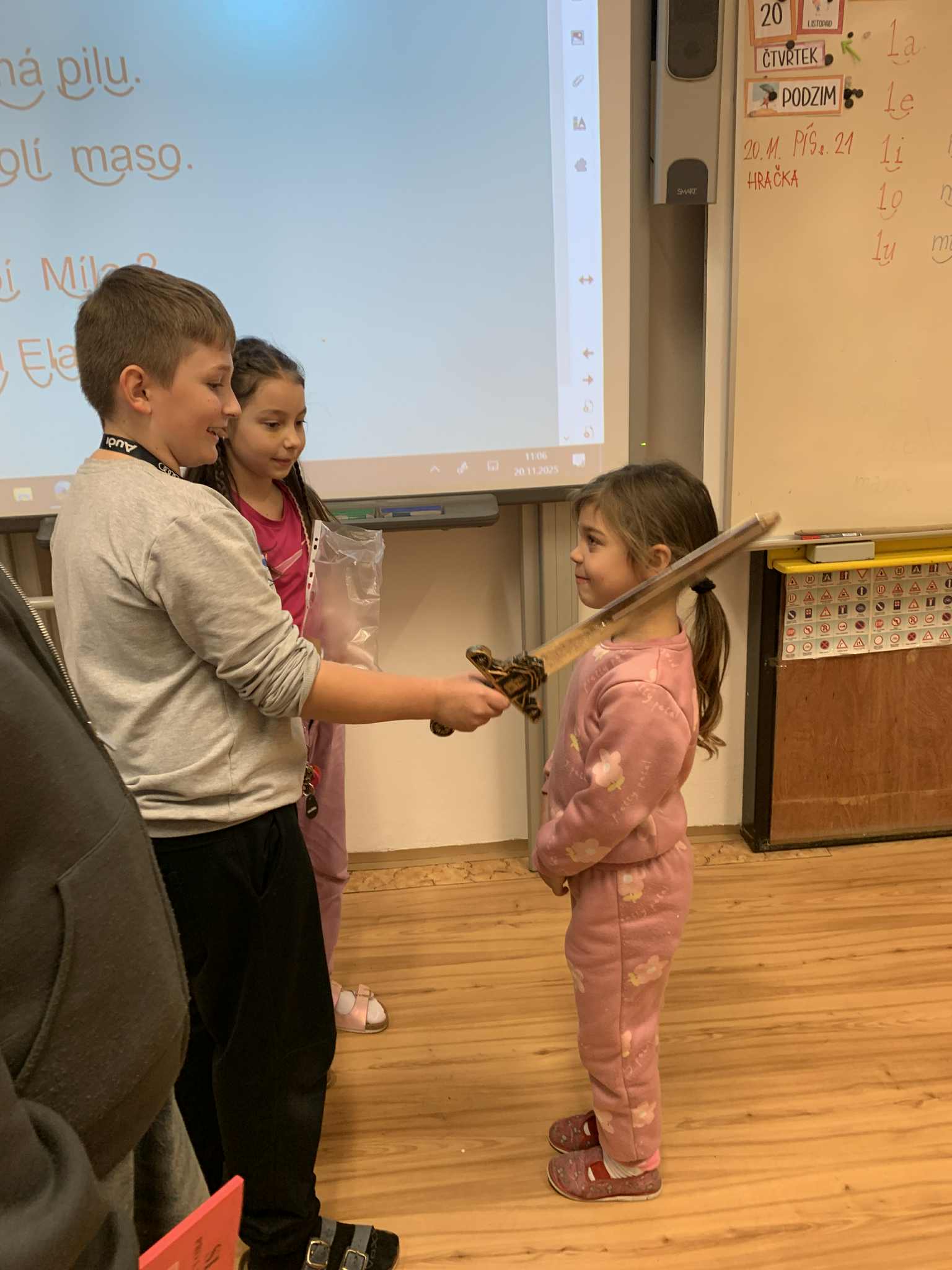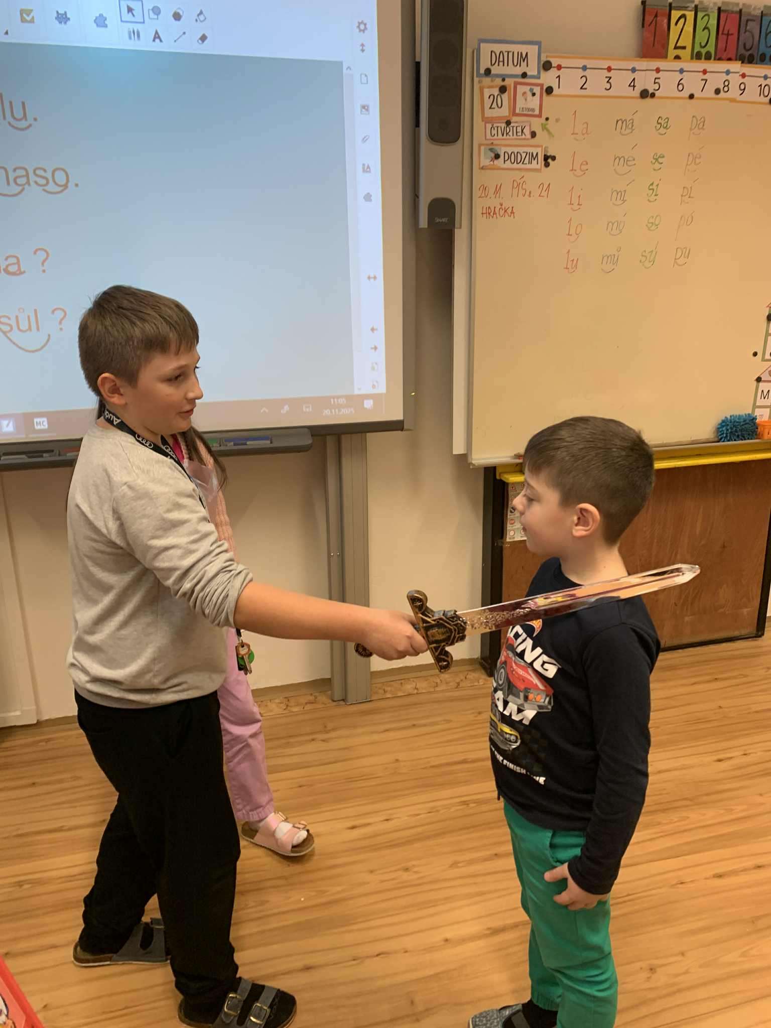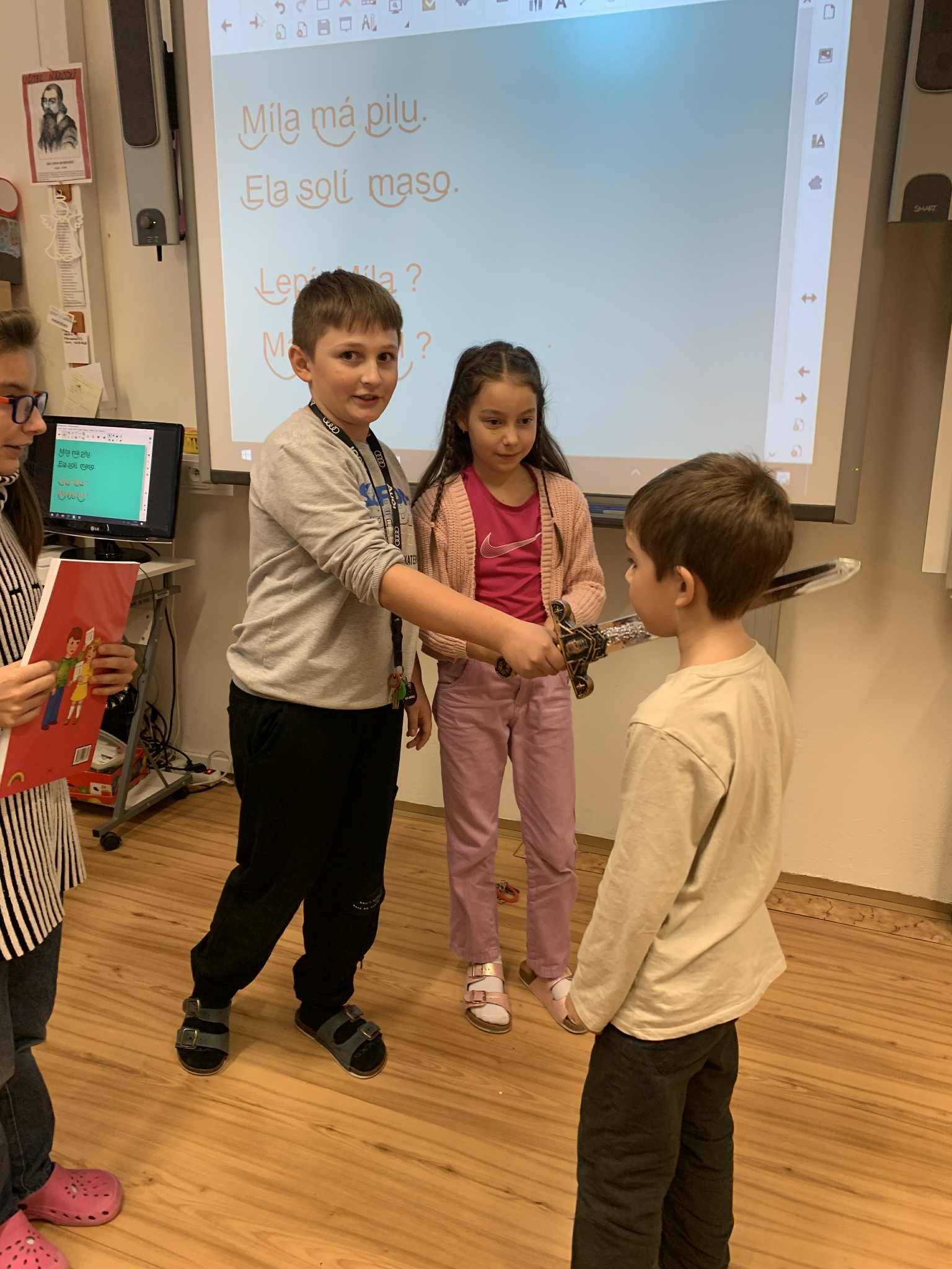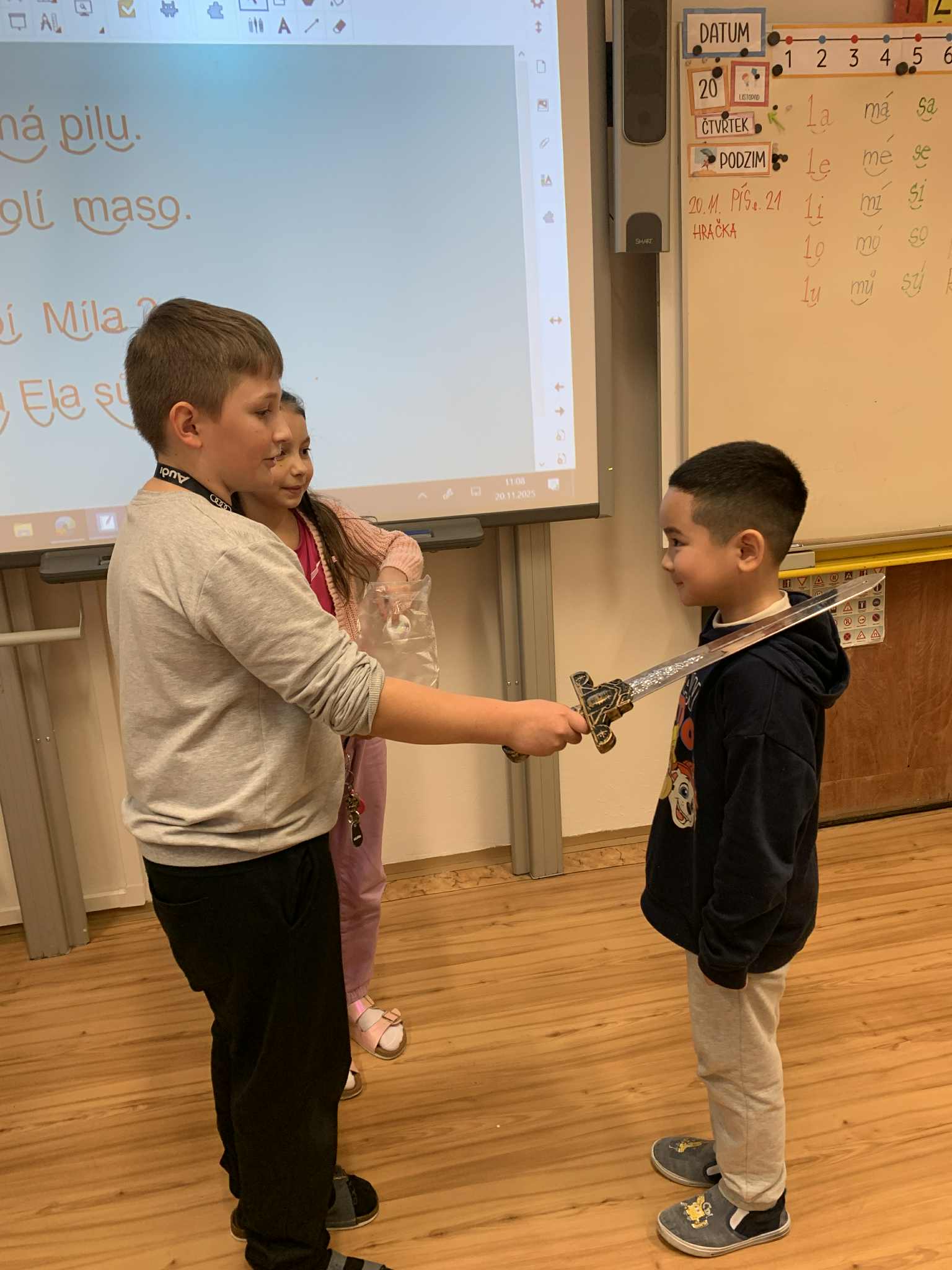 A protože už dočetly Živou abecedu, přišli jim kamarádi a kamarádky z 5.D slavnostně předat Slabikář a zároveň je pasovat na čtenáře. Tak jako rytíři musí překonávat překážky, tak i čtenáři potřebují pěstovat snahu a píli. A to naši malí čtenáři jistě budou, aby se kniha stala jejich věrným přítelem.