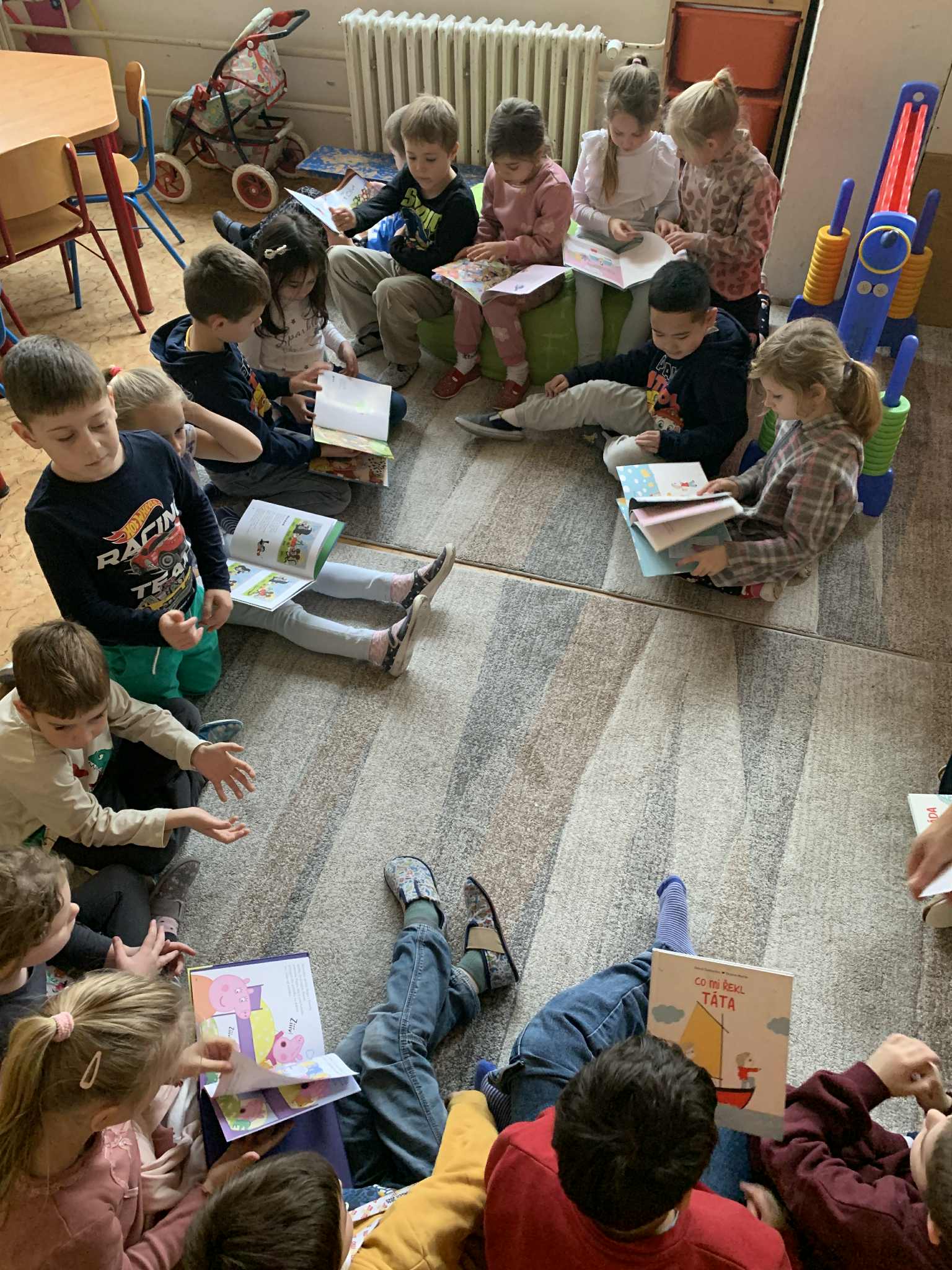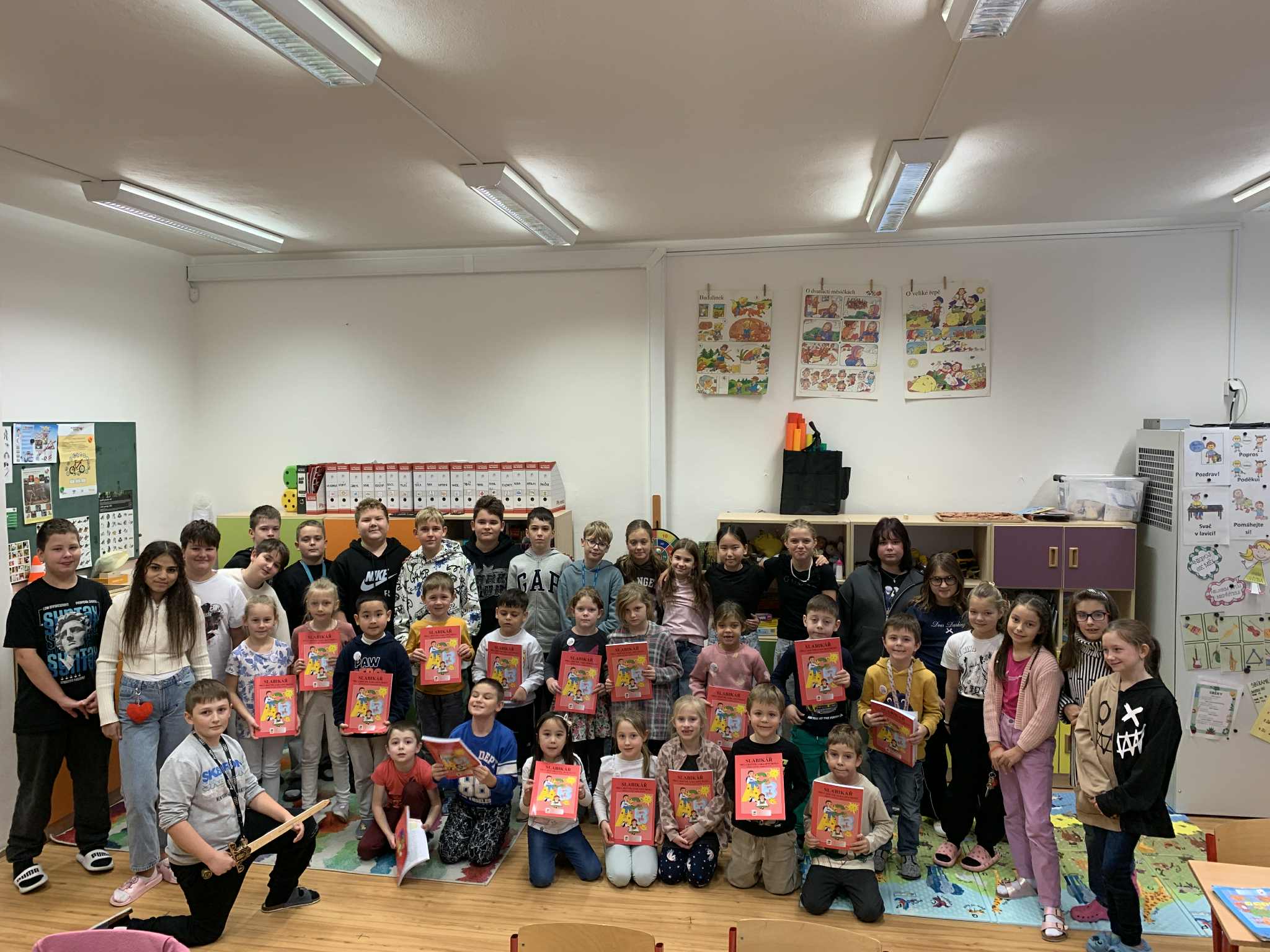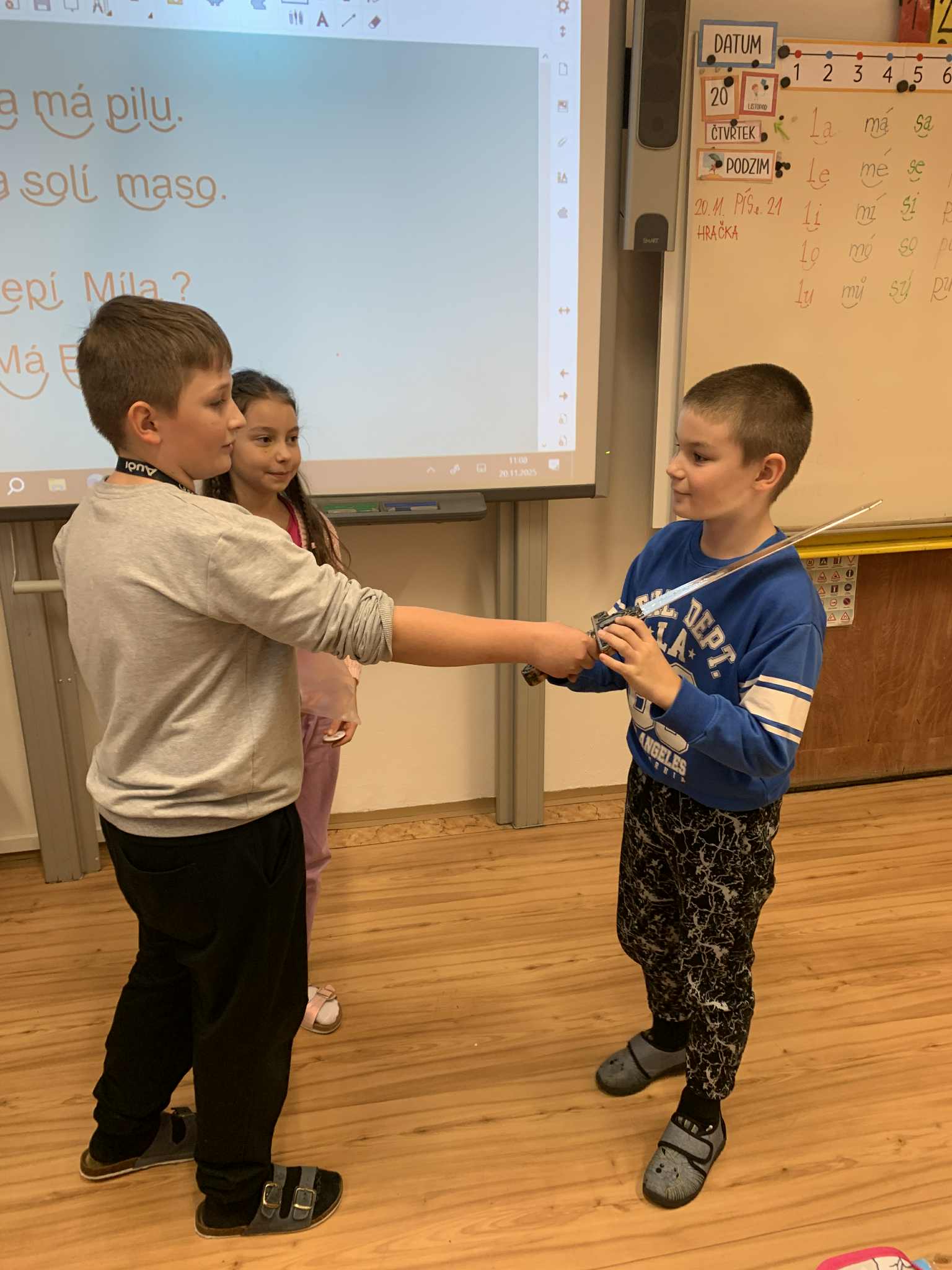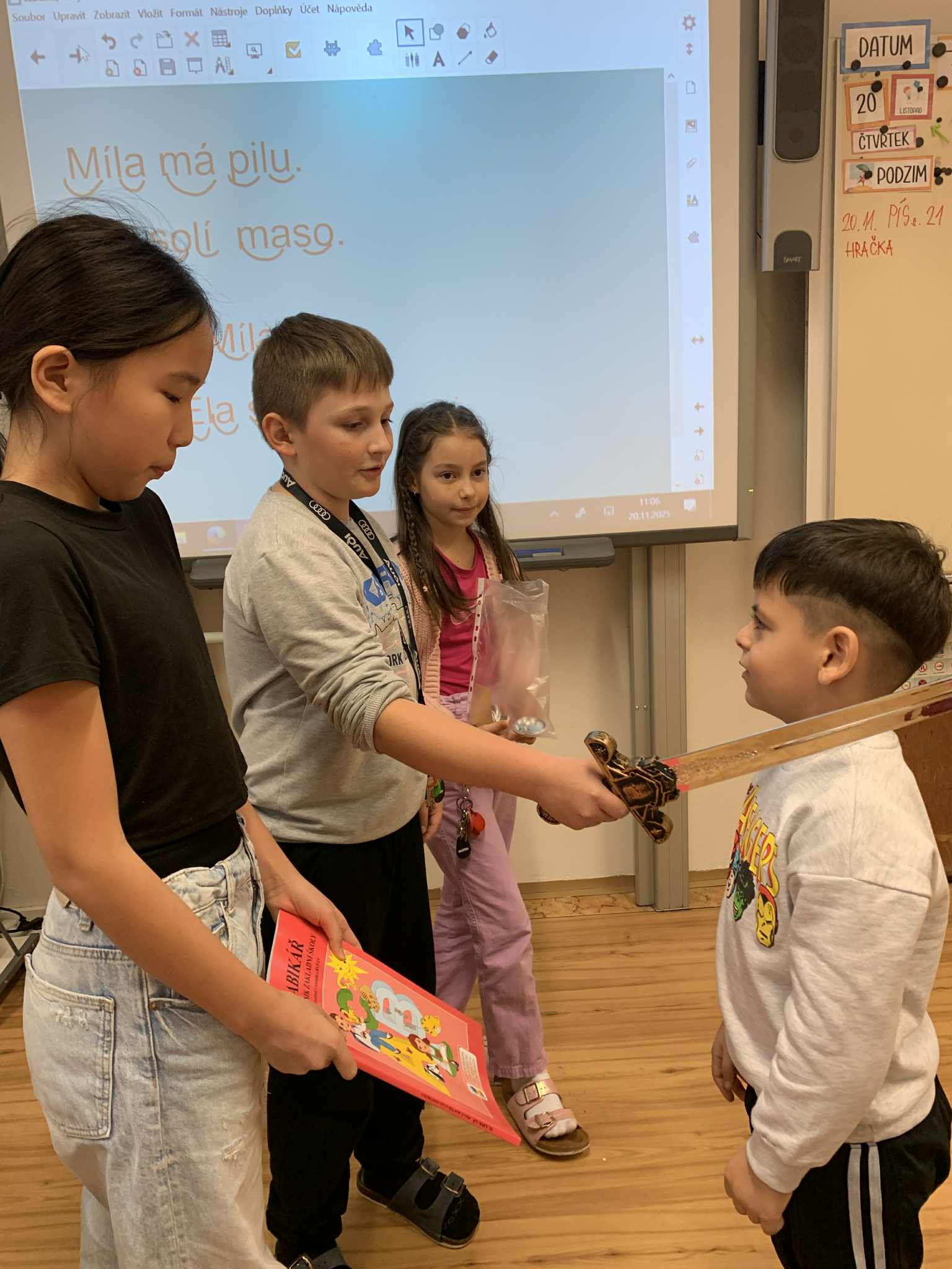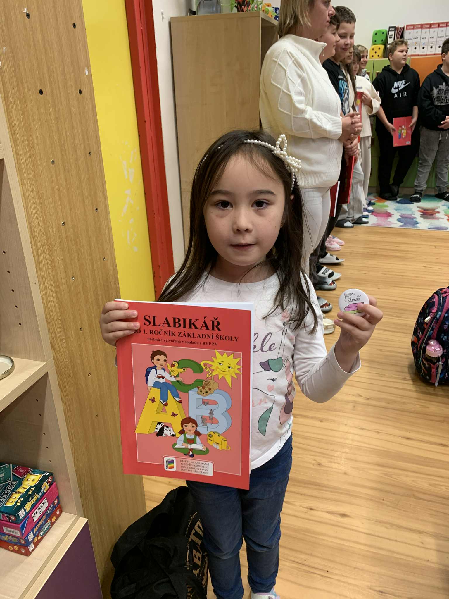 A protože už dočetly Živou abecedu, přišli jim kamarádi a kamarádky z 5.D slavnostně předat Slabikář a zároveň je pasovat na čtenáře. Tak jako rytíři musí překonávat překážky, tak i čtenáři potřebují pěstovat snahu a píli. A to naši malí čtenáři jistě budou, aby se kniha stala jejich věrným přítelem.