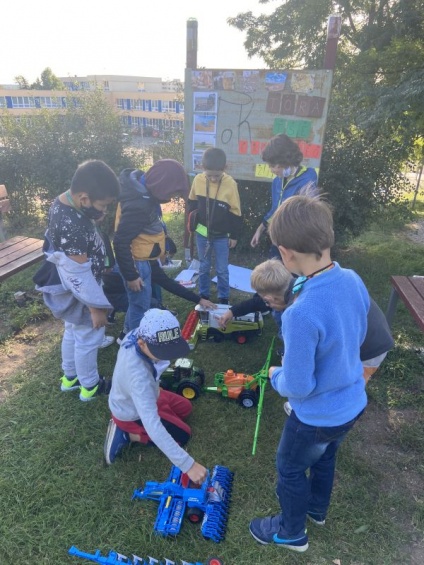 Zkoušeli manipulovat se zahradním nářadím a byli seznámeni se zemědělskými stroji jako je pluh, traktor, kombajn…