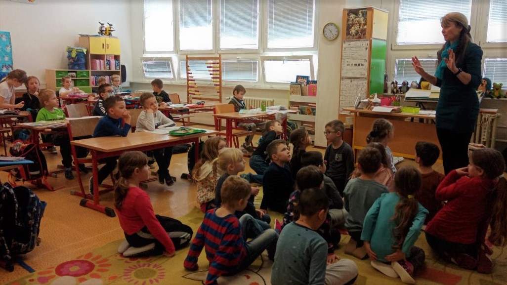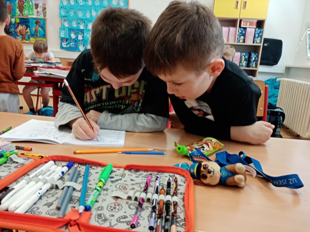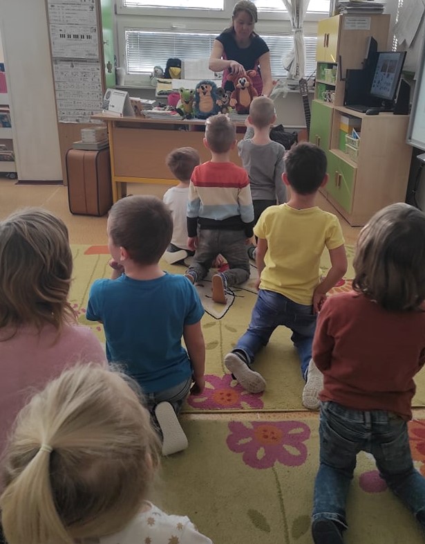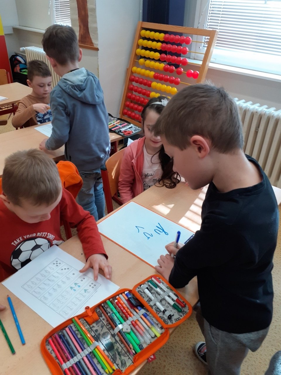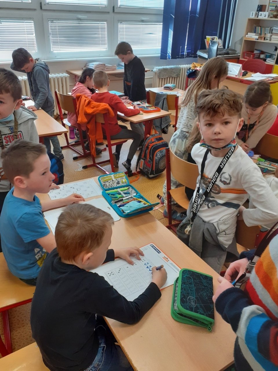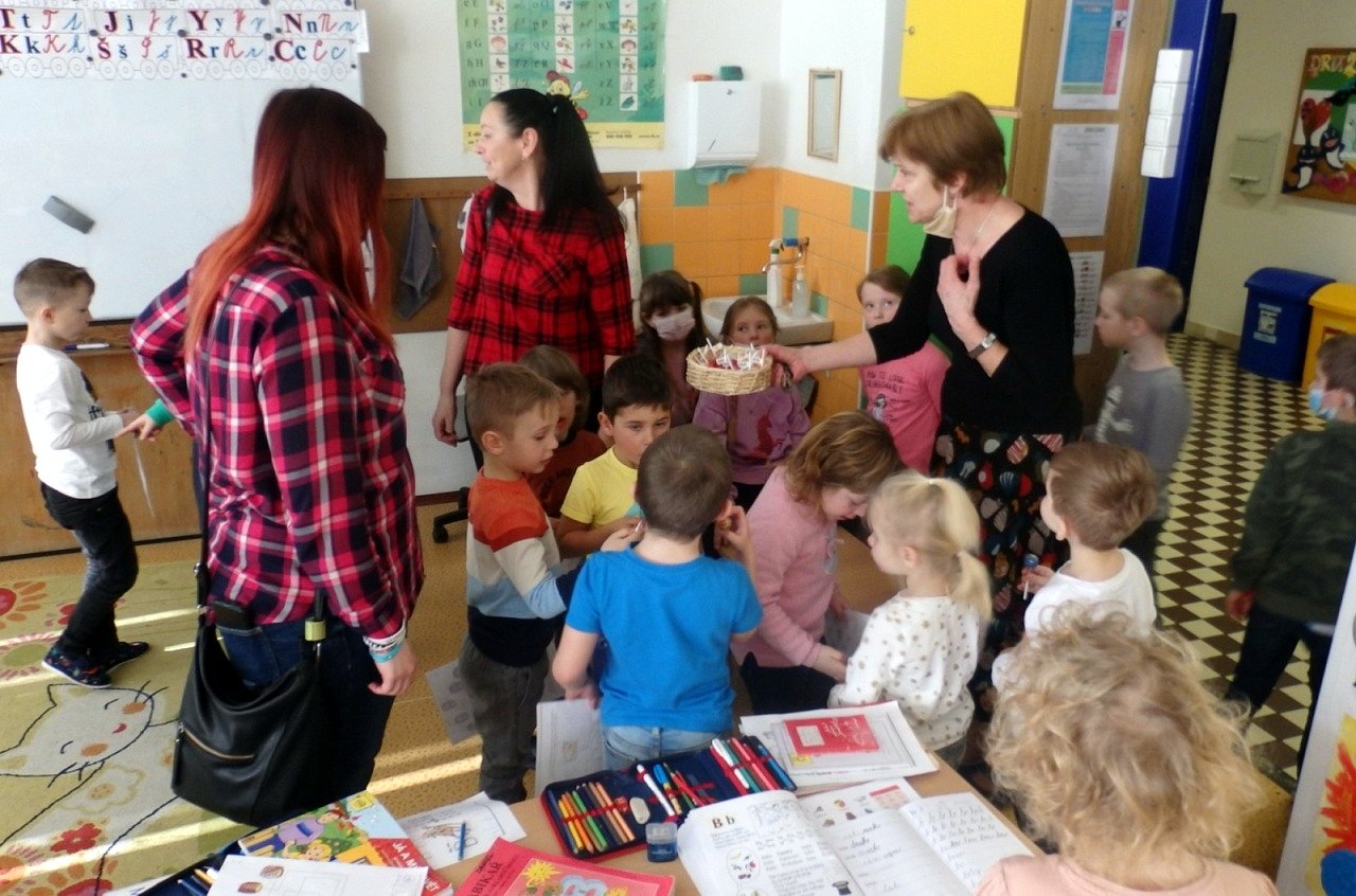 Prvňáci se tak setkali se svou bývalou paní učitelkou a mohli se pochlubit, co všechno se již naučili. Děti z MŠ si vyzkoušely, jak vypadá hodina ve školní třídě. Školáci ukázali co všechno se už zvládli naučit: číst, psát, počítat, ... Nechyběly ani písničky a taneček. Na závěr dostali všichni sladkou odměnu.