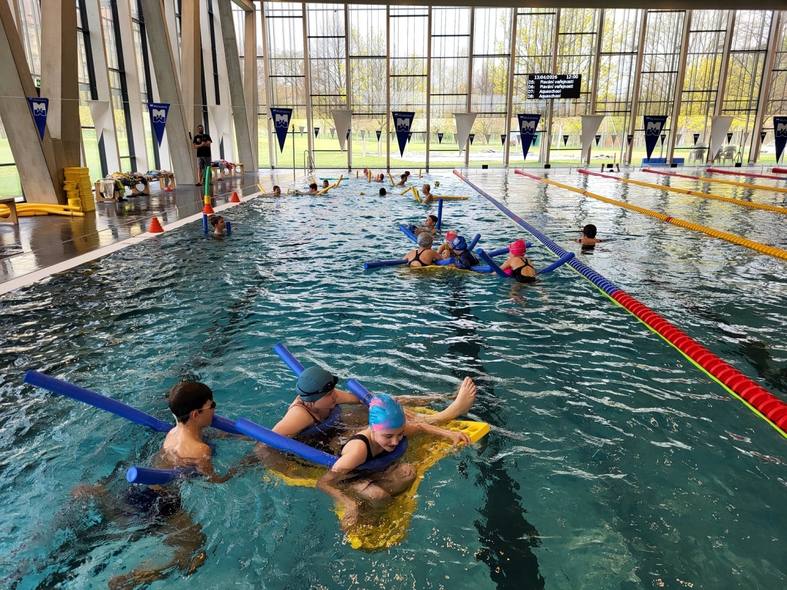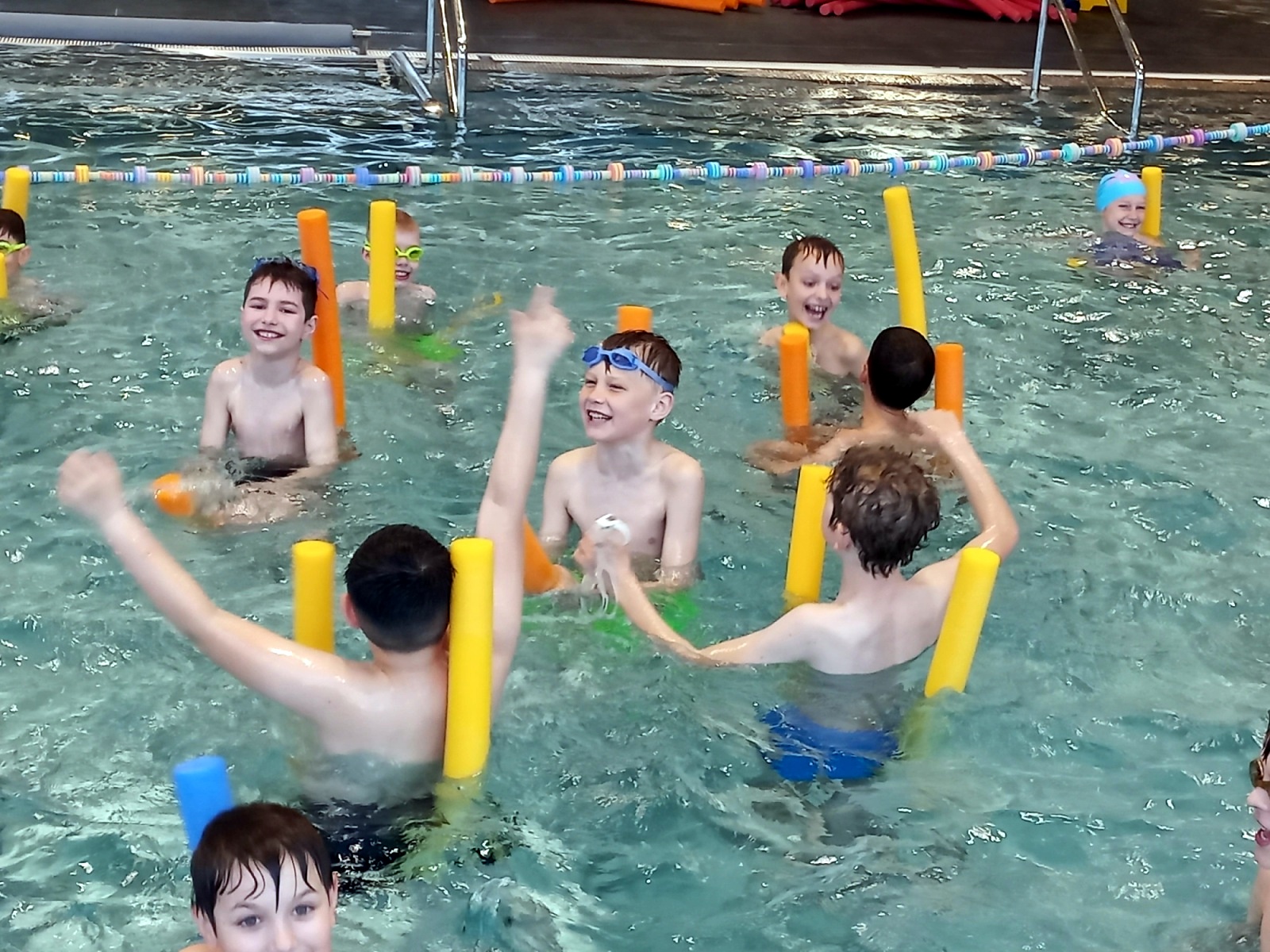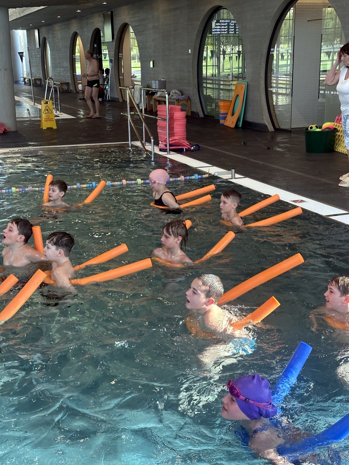 Jsou rozděleny do čtyř družstev, kde si nacvičí zábavnou formou a prostřednictvím her styly plavání. Úvodní hodina začala diskotékou, to se všem náramně líbilo a děti předvedly , co ve vodě dokáží. Je to příjemná změna tělesné výchovy. Už se těšíme na další lekci!!!