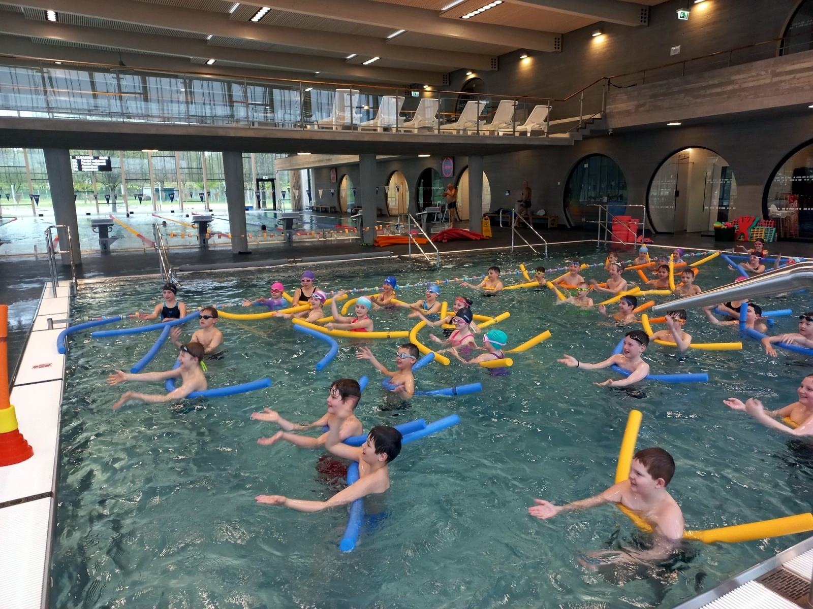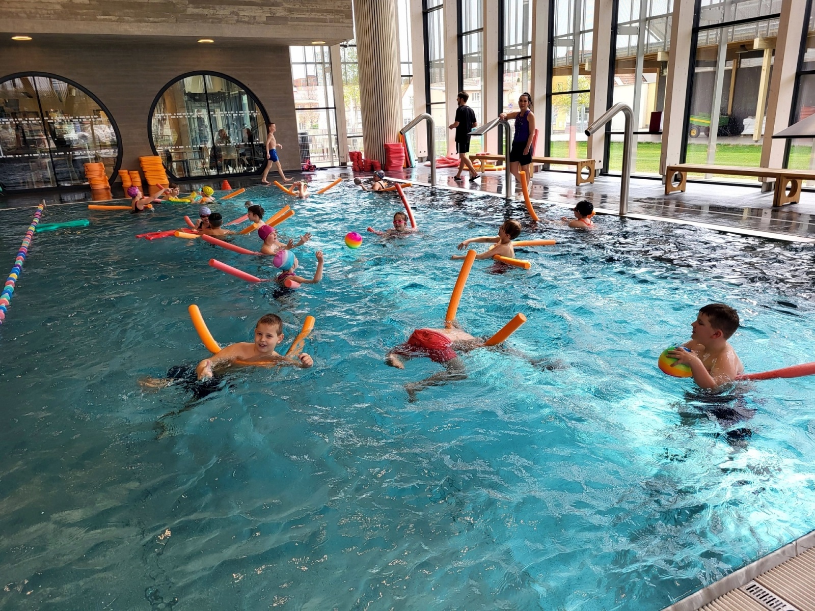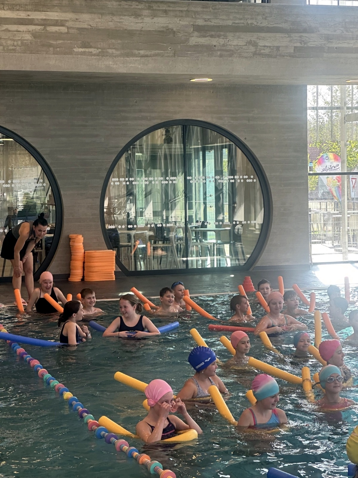Jsou rozděleny do čtyř družstev, kde si nacvičí zábavnou formou a prostřednictvím her styly plavání. Úvodní hodina začala diskotékou, to se všem náramně líbilo a děti předvedly , co ve vodě dokáží. Je to příjemná změna tělesné výchovy. Už se těšíme na další lekci!!!