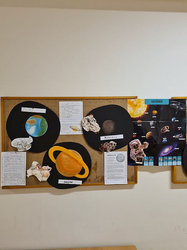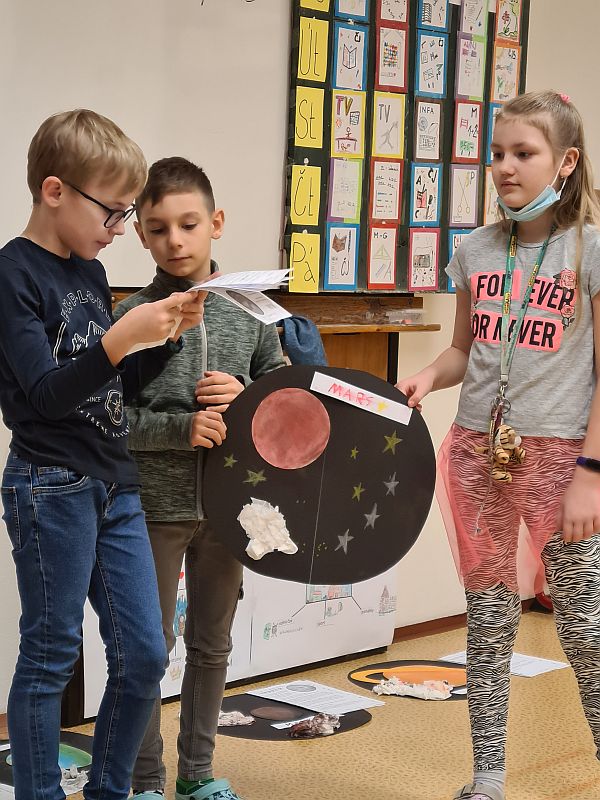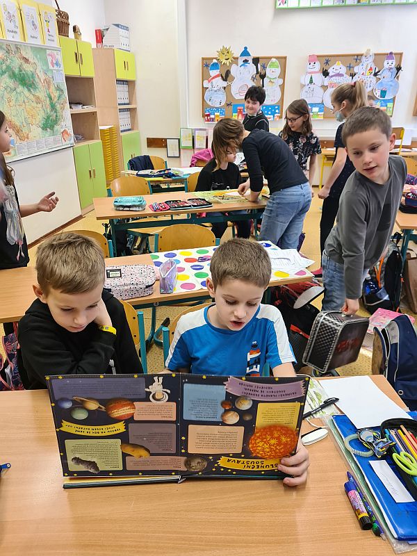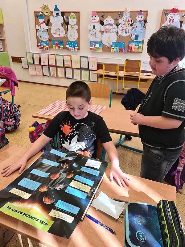 Žáci získali podrobnější informace o probíraném učivu Planety. Každá třída si připravila aktivity prolínající se různými předměty. Vesmír se objevil v ČJ, M, VV, SP, TV i informatice. Ve volných chvílích nahlíželi žáci do encyklopedií, které si sami přinesli. Toto téma je opravdu zaujalo.