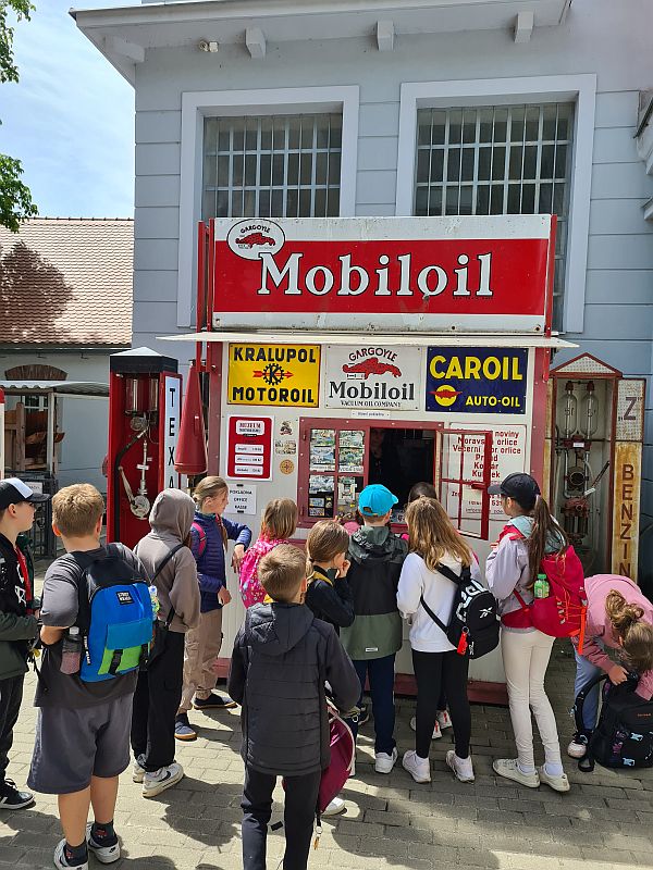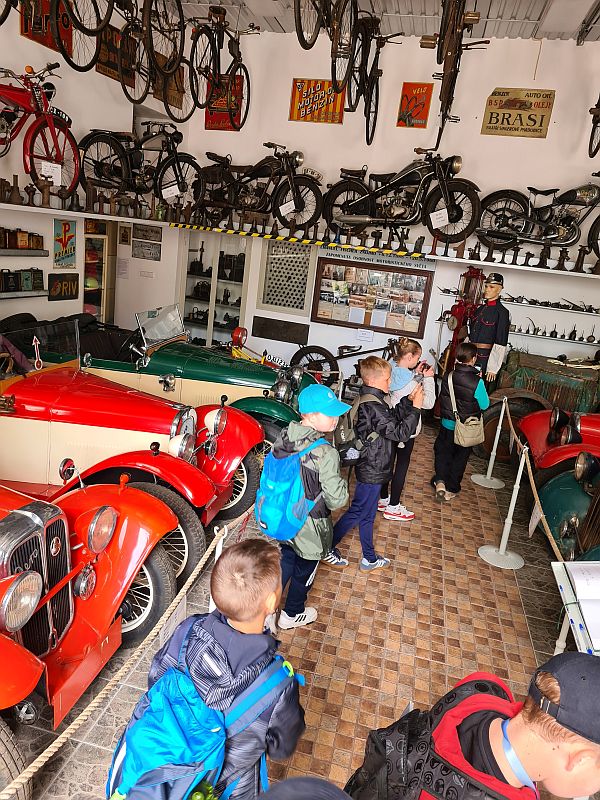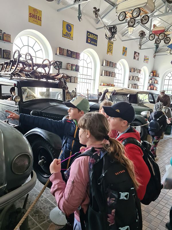 Prostory muzea byly do posledního místečka zaplněny nejen historickými automobily, koly, kočárky, traktory, motory a dalšími předměty z dob minulých, ale také žáky, kteří si vše se zájmem prohlíželi. Objevili mimo jiné historická rádia a měli možnost poslechnout si, jak z nich zněla hudba. Zážitkem byla i návštěva tajemných sklepních prostorů.