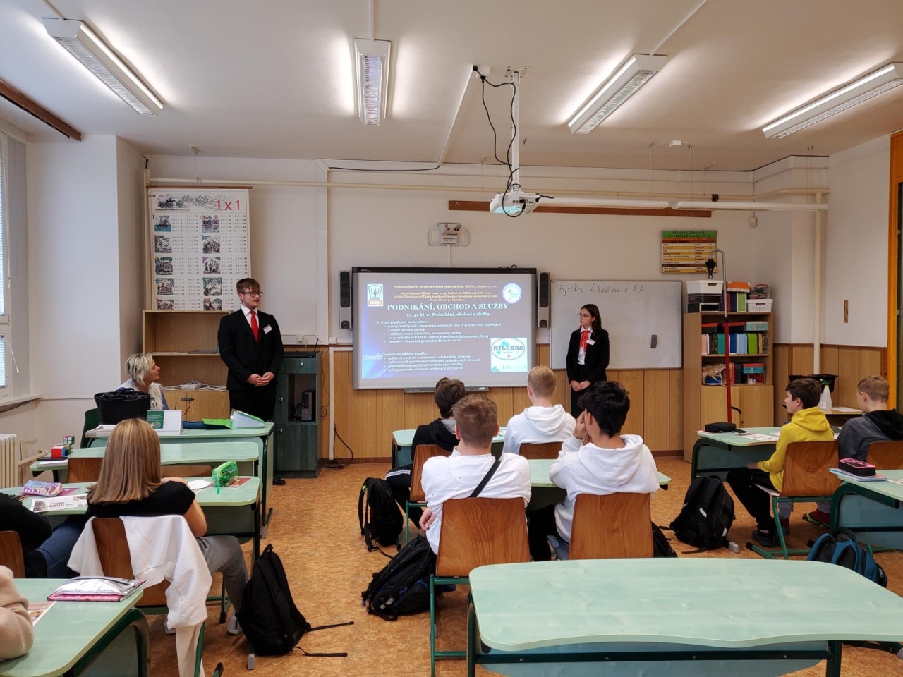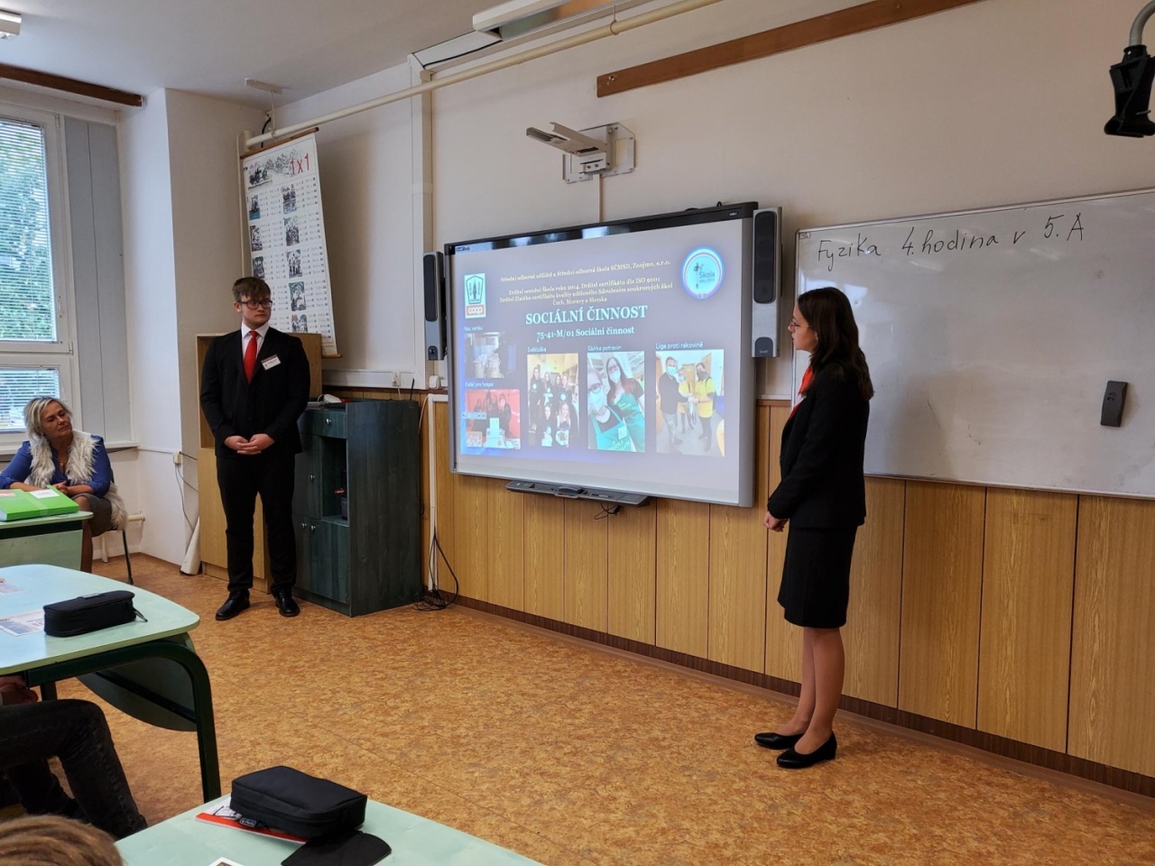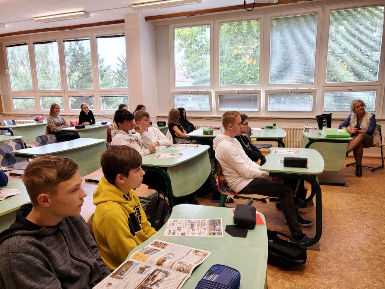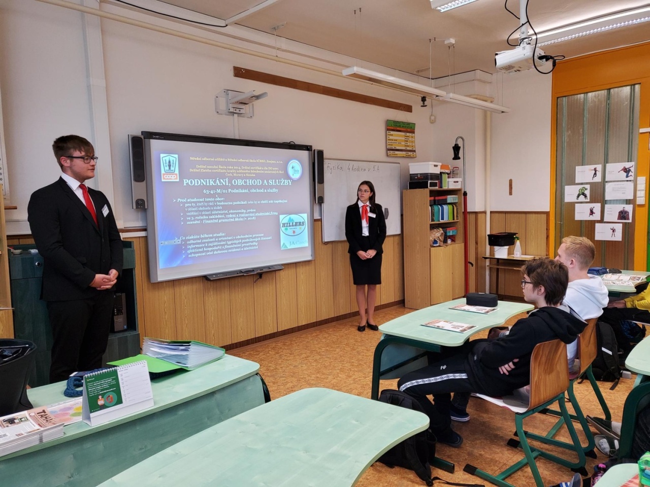15. října deváťáky navštívila výchovná poradkyně, paní magistra Karpíšková, ze SOU a SOŠ SČMSD Znojmo. Společně s ní přišli také dva studenti z oboru Cestovní ruch, kteří profesionálně představili všechny obory, na které lze v příštím školním roce na „Přímku“ nastoupit.