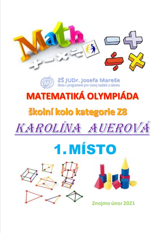 Ve školním kole matematické olympiády kategorie Z8, což jsou žáci 8. ročníků, se na 1. místě umístila žákyně 8.B - KAROLÍNA AUEROVÁ, která bude naši školu reprezentovat v okresním kole. Poměří svoje matematické dovednosti s ostatními žáky okresu.