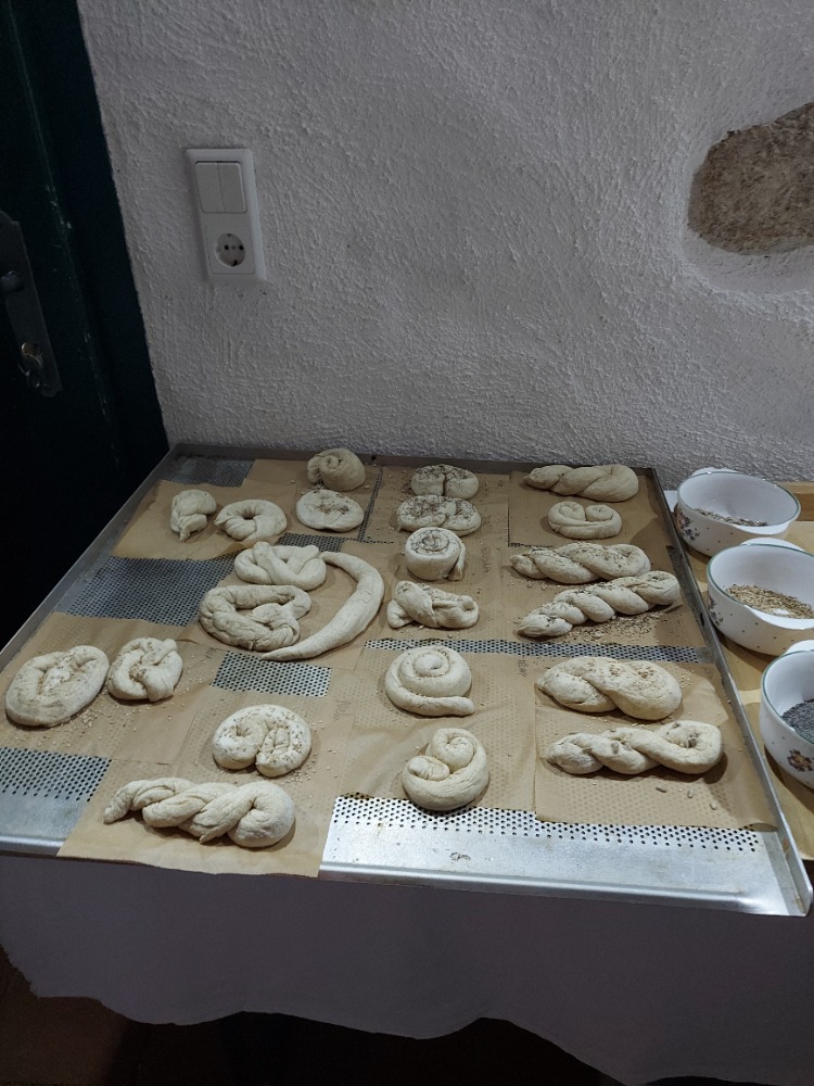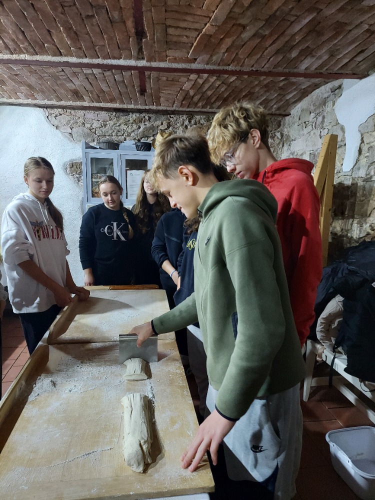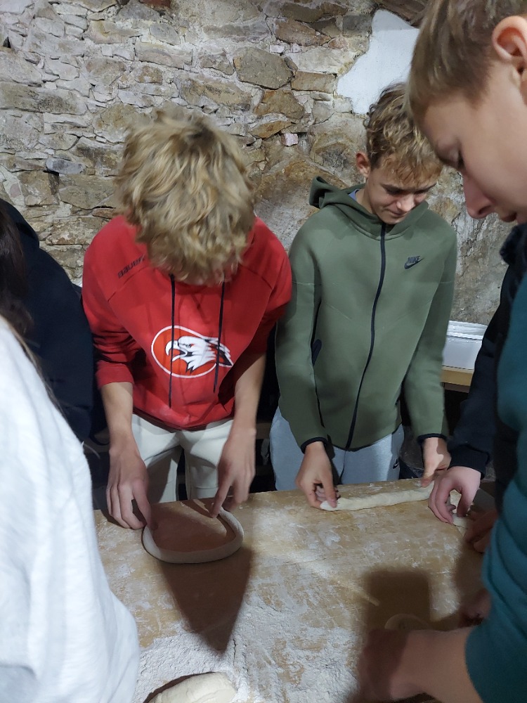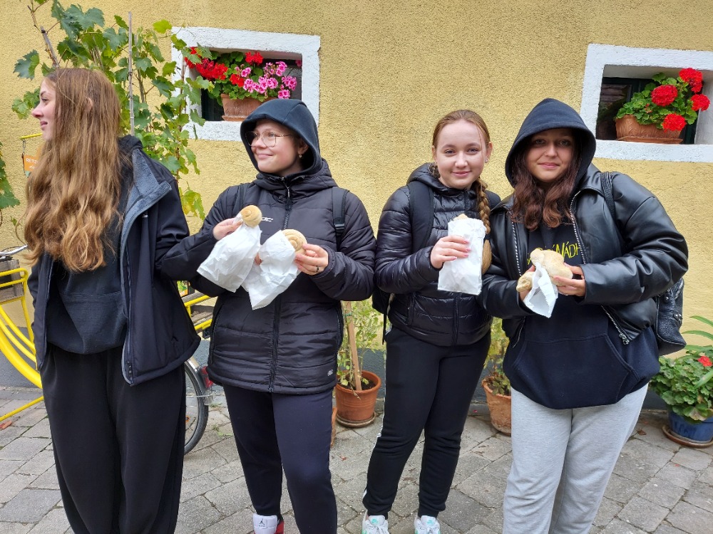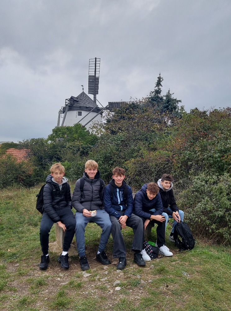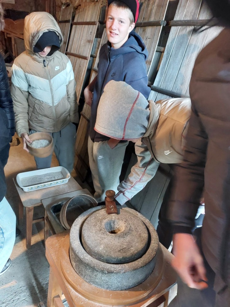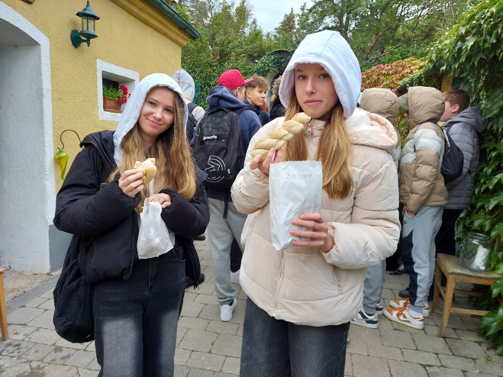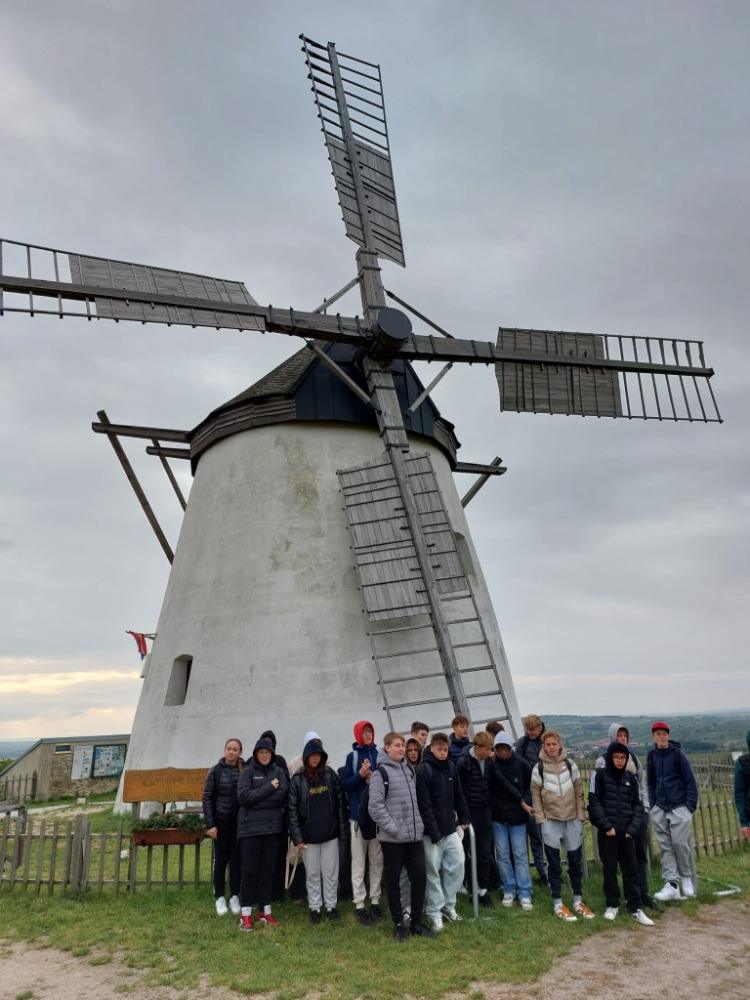 Nejprve zamířili k historickému větrnému mlýnu, který se nachází ve vinohradu nad městečkem. Je to jeden ze dvou funkčních větrných mlýnů v Rakousku. Žáci měli možnost prohlédnout si s paní průvodkyní mlýn, seznámit se s tím, jak fungoval a dozvěděli se, jak lidé získávali mouku v minulosti a jak se tuto činnost postupně snažili zjednodušit. Také si mohli vyzkoušet drcení pšeničných zrn mlýnskými kameny. V historické pekárně, která se nachází v bezprostřední blízkosti mlýna, měli možnost z připraveného těsta připravit pečivo různých tvarů, které si po upečení odnesli a mnozí hned snědli.
