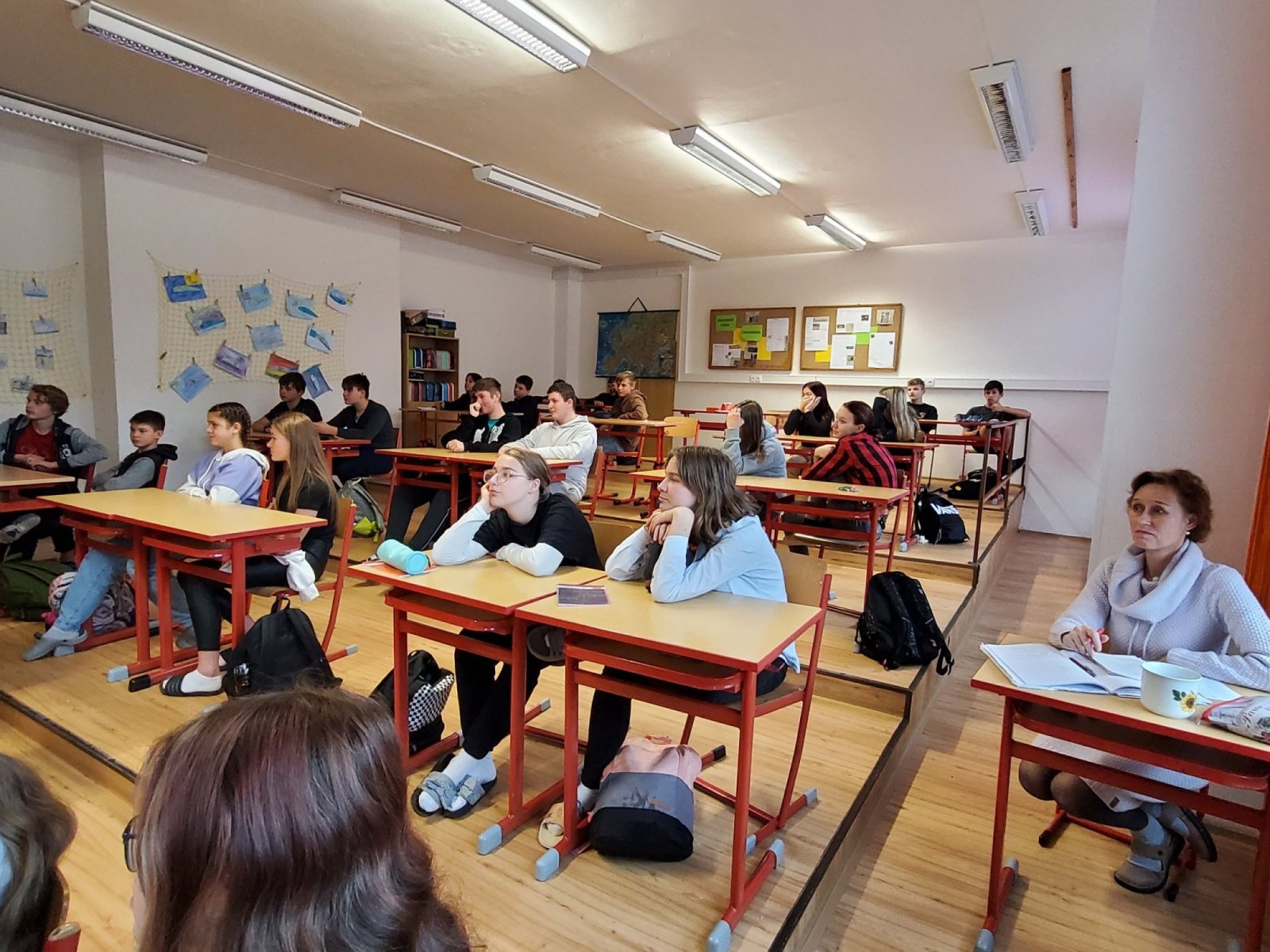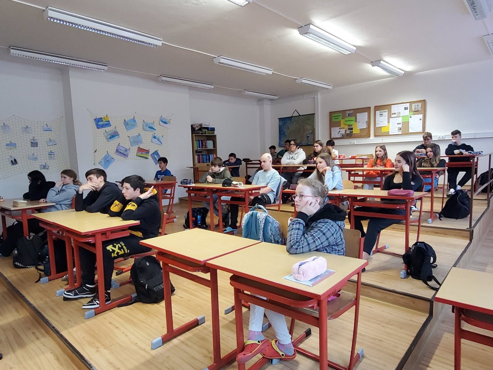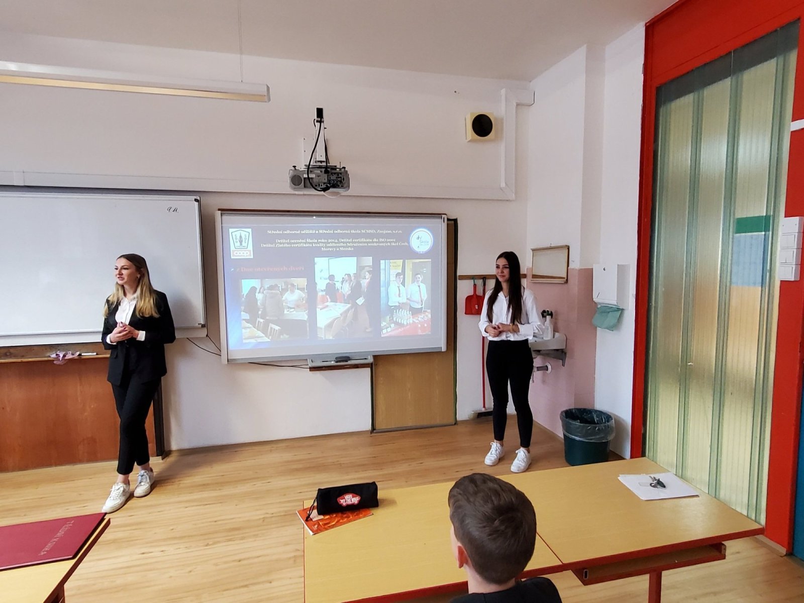 Sympatické studentky, Julie Fialová a Daniela Šimečková, s paní učitelkou Ludmilou Karpíškovou zajímavě představily hlavní učební a studijní obory školy. Žáci našich osmých tříd se tak dozvěděli o obsahu a náplni studijních oborů cestovní ruch, hotelový management, kosmetička, grafický design a podnikání a sociální činnost. Dále získali informace o učňovských oborech kuchař - číšník, truhlář, automechanik a prodavač.