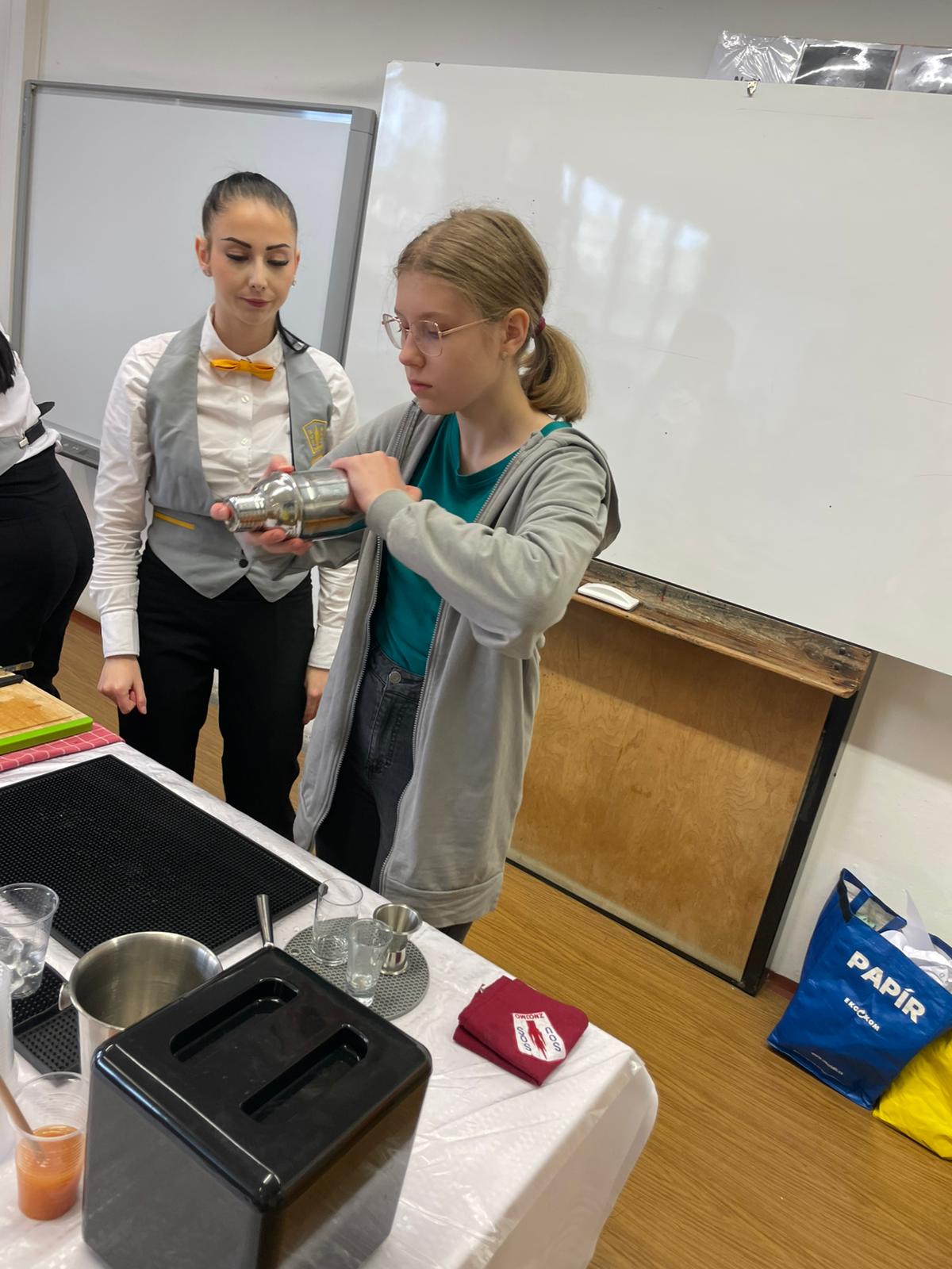První hodinu jsme měli přednášku od kadeřnic a kosmetiček, mohli jsme si vyzkoušet masáž a peeling rukou a holky si mohly nechat natočit vlasy nebo udělat copánky. Druhou hodinu jsme si zkusili udělat dezert zvaný Sladké pokušení, pomáhali nám studenti z oboru Kuchař-číšník. Třetí hodinu nám názorně ukazoval obor Barman, jak se připravuje drink v baru, poté jsme si mohli připravit svůj vlastní. Čtvrtou (poslední) hodinu jsme se naučili rozpoznávat druhy dřeva stromů rostoucích v Česku. Dozvěděli jsme se spoustu nových věcí a líbilo se mi, jak jsme si mohli všechno vyzkoušet.