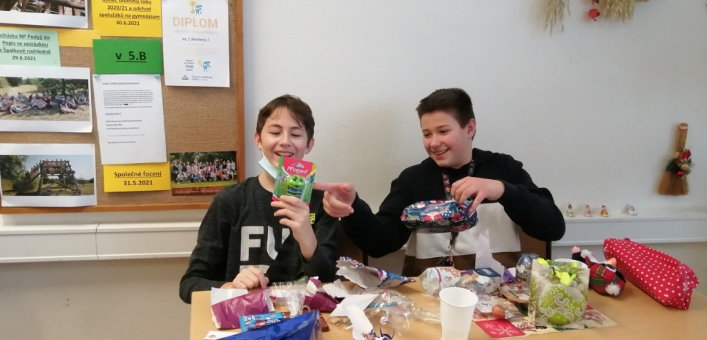 Každý člen třídy si připravil pro své spolužáky dva dárky, které pečlivě zabalil a opatřil jmenovkou. Tomu ale předcházelo náhodné losování, kdo koho obdaruje. Samozřejmě bylo možné udělat dárkem radost i nevylosovaným spolužákům, tedy těm, ke kterým má každý ze třídy blízko.