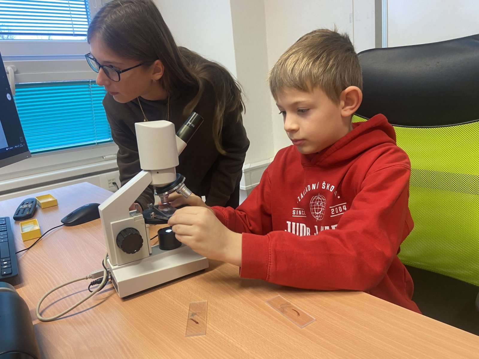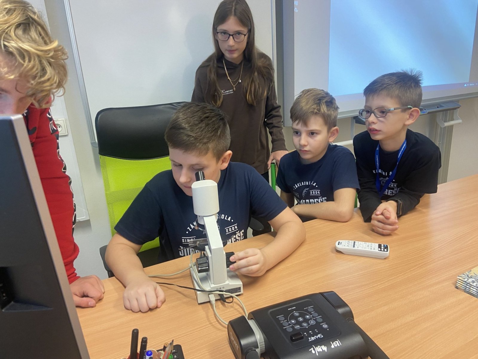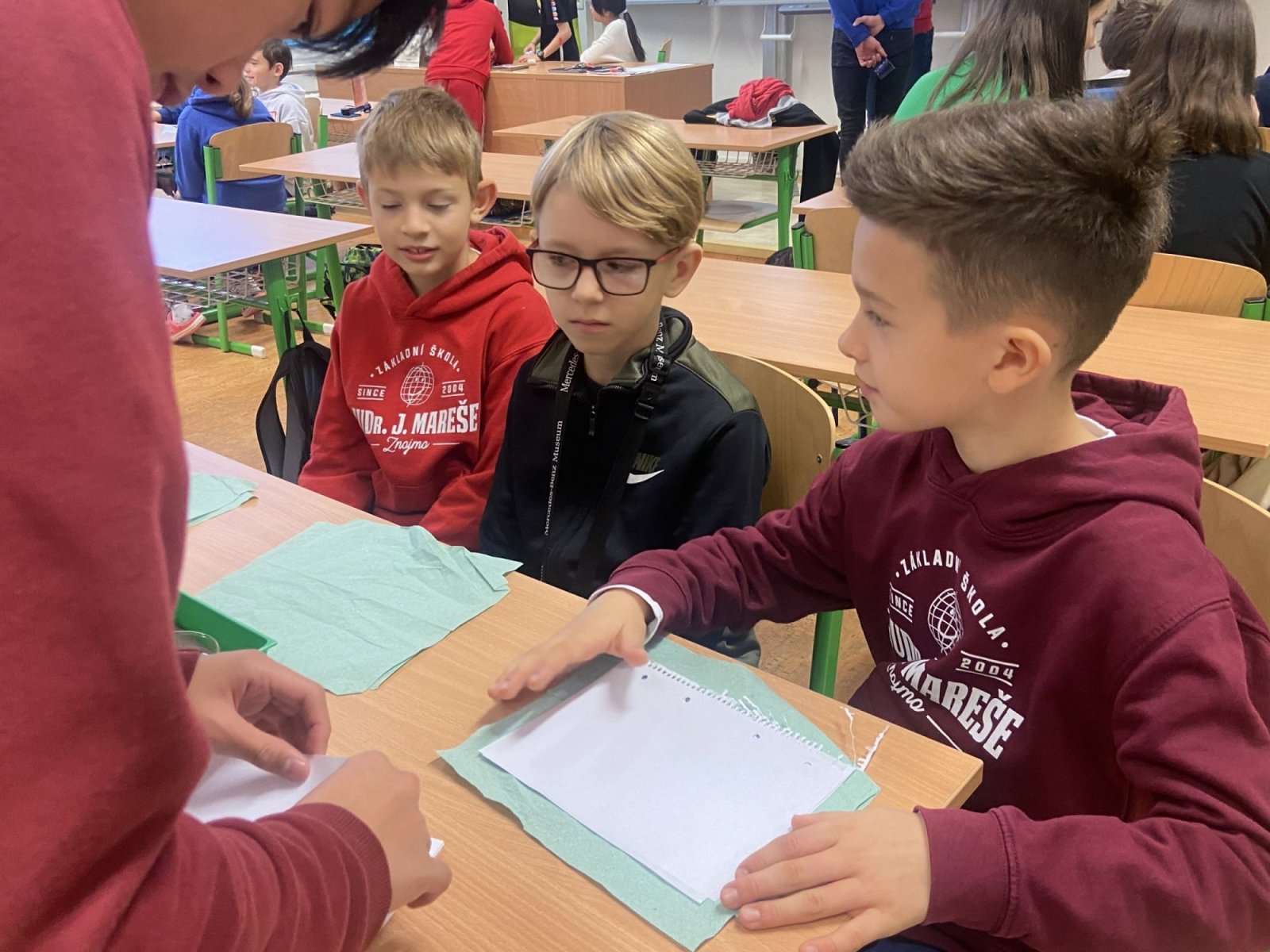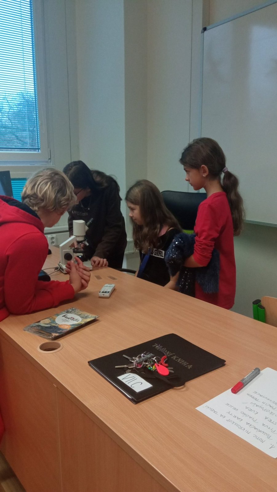 Nejoblíbenější stanoviště bylo mikroskopování. Na předposledním stanovišti se zkusili žáci podepsat ptačím perem a na posledním stanovišti museli poznat předložené ptáky v prezentaci.