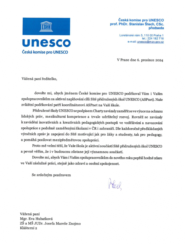 S radostí také oznamujeme, že naše dlouhodobá aktivita v rámci Sítě přidružených škol UNESCO byla oceněna děkovným dopisem od předsedy České komise pro UNESCO, prof. PhDr. Stanislava Štecha, CSc. Toto ocenění je pro nás významným uznáním a motivací k dalšímu rozvíjení projektů a aktivit, které přispívají ke globálnímu vzdělávacímu poslání UNESCO.