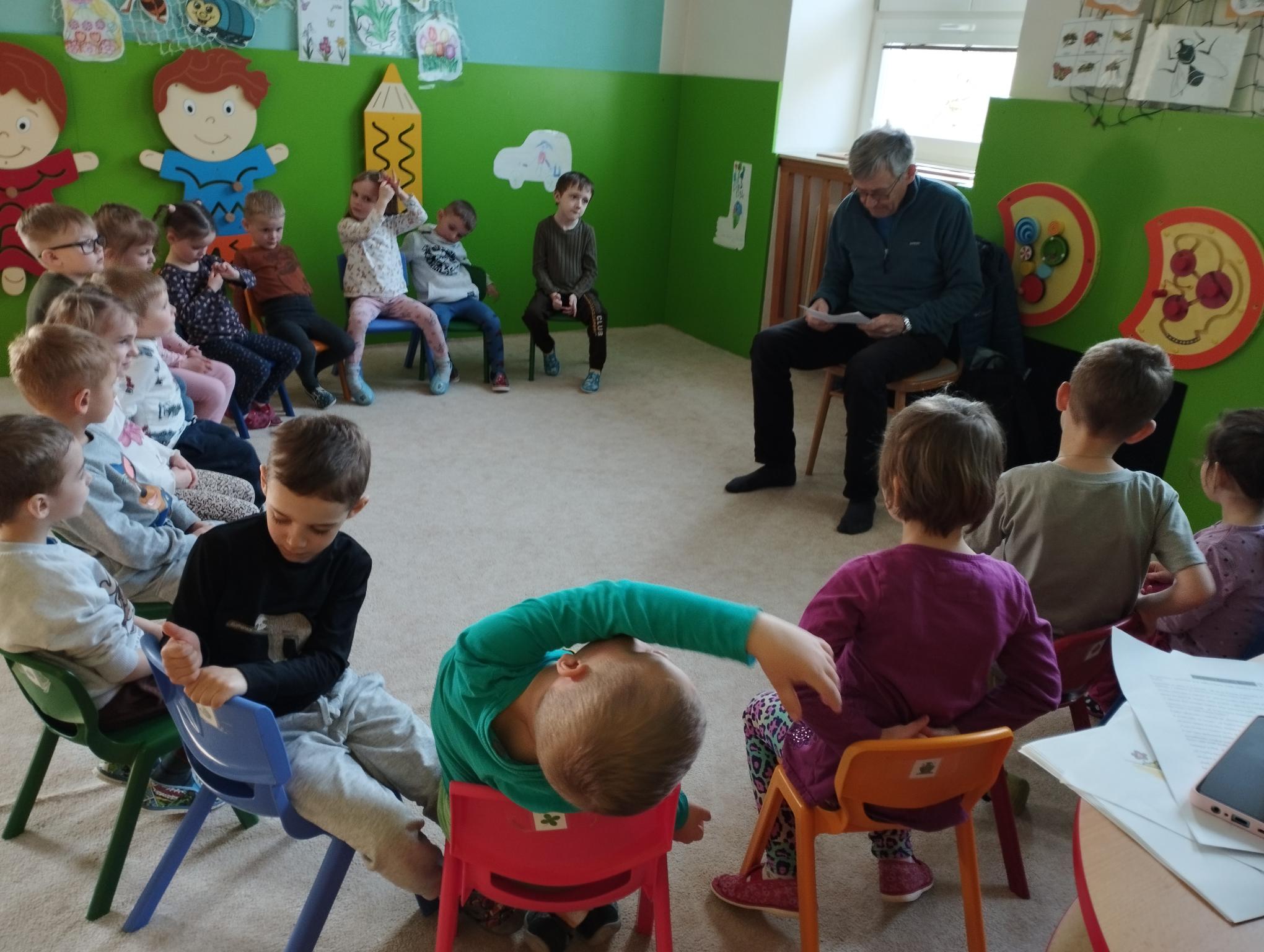 Děti naslouchaly pohádce a moc se jim líbila. Dědeček si pro děti připravil i občerstvení. Poté si vykreslily omalovánku s dějem této pohádky. Panu Pokornému moc děkujeme za návštěvu a přečtení pohádky.