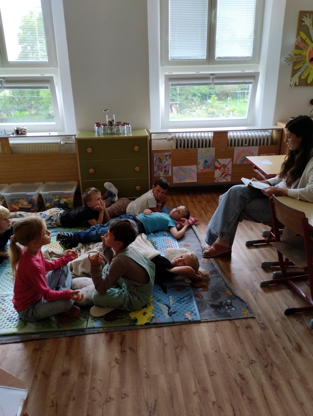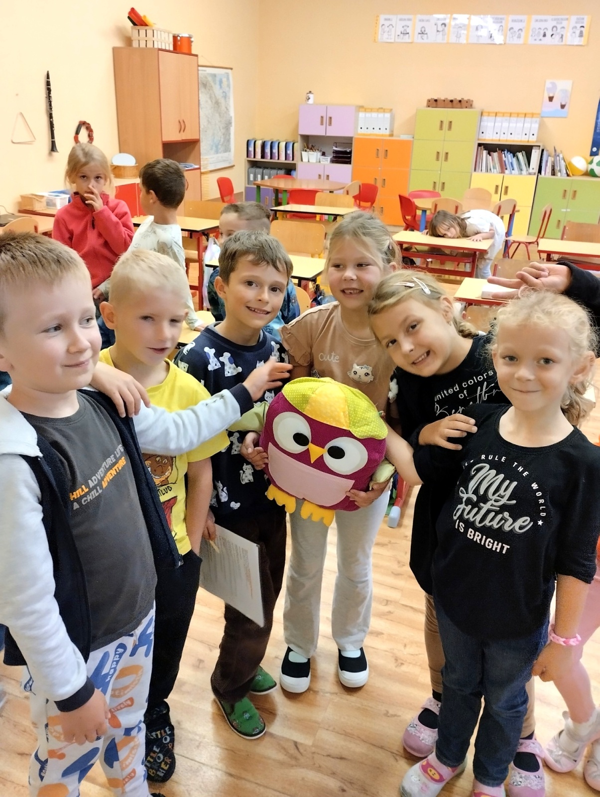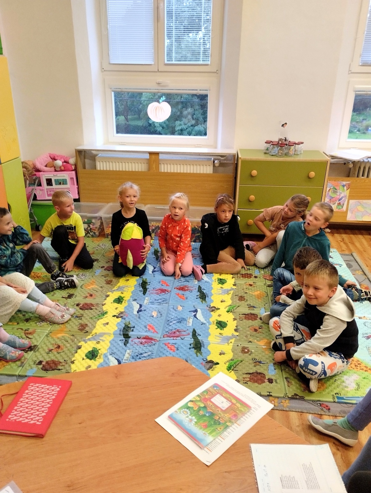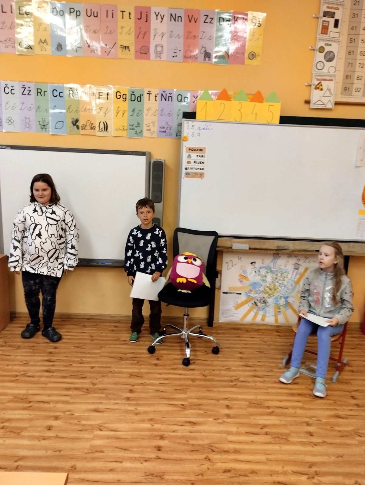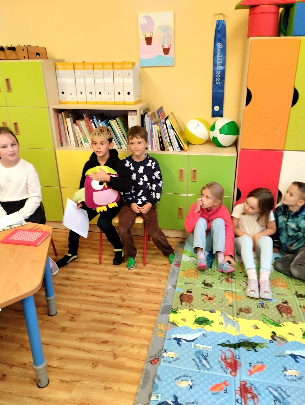 Kromě předčítání se děti denně věnují krátkým textům, kde si procvičují čtenářské strategie a chystají se navštívit i místní knihovnu. Vrcholem naší práce je příprava divadelního představení, které pro rodiče a přátele připravujeme ke Dni laskavosti. Naše společné čtenářské aktivity jsme s nadšením ukázali i samotnému Sovíkovi.