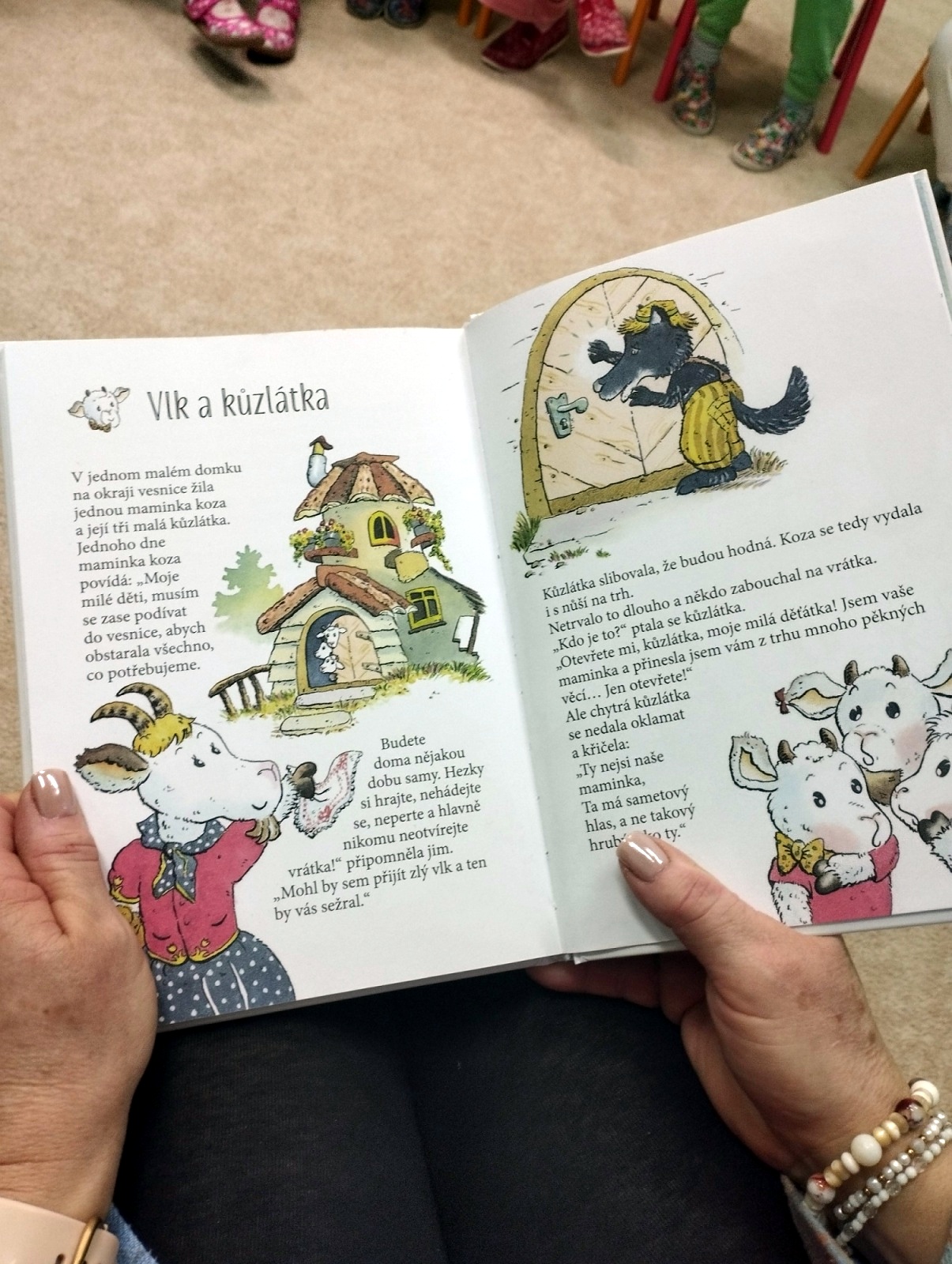 Všechny děti pozorně poslouchaly, aby věděly jak to s kůzlaty dopadlo. Babička si s dětmi ještě povídala o poučení z příběhu. Za odměnu si vybraly barevný drahokam. Babičce moc děkujeme.