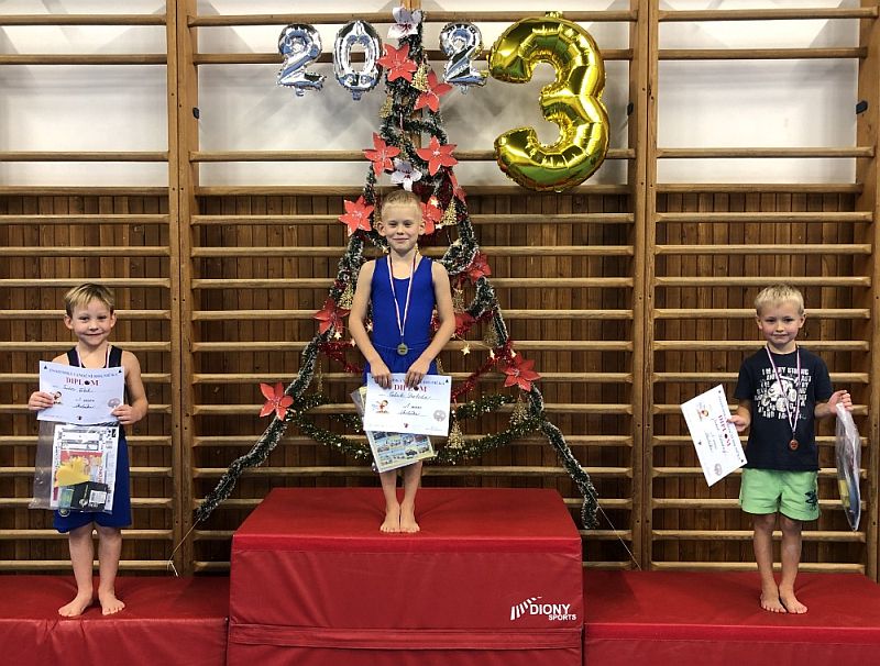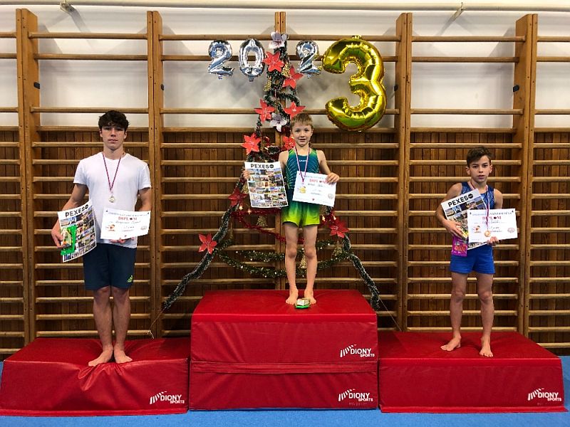 Chlapci předvedli své svaly v kategorii přípravky, kde zvítězil Patrik Svoboda před 2. Teodorem Vítkem a 3. Jakubem Závodným. Závodníci nechtěli zůstat pozadu a také si střihli své sestavy na prostných, kde nejčistěji zacvičil Robert Vala před Benjaminem Čuportem a Tobiasem Fučíkem. I chlapcům velmi gratulujeme k předvedeným výkonům a přejeme do další sezóny hodně úspěchů nejen sportovních. Všem rodičům a stejně tak i všem našim příznivcům: městu Znojmu, JM kraji, OS ČUS Znojmo, NSA, MŠMT, SVČ Znojmo, ZŠ JUDr. J. Mareše Znojmo a MŠ děkujeme za celoroční podporu a všem přejeme prožití klidných a pohodových Vánoc.