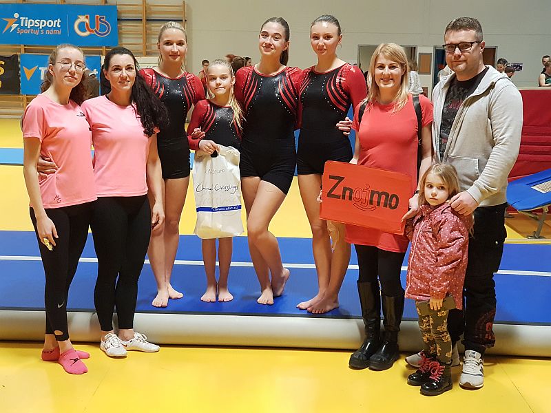 "Nové" sportovní disciplíně se v našem klubu rozhodla věnovat paní trenérka Helena Vítoňová spolu se svou dcerou Karolínou Vítoňovou a asistentkou Zuzanou Plačkovou, které se v rámci hodin kondiční gymnastiky věnují nácviku akrobacie a přeskoku jak z malé trampolínky, tak i přes přeskokový stůl, kdy závodnice plynule jeden za druhým po určený časový limit předvádí všechny gymnastické kousky, které umí. Podobně jako můžete vidět i na našich vystoupeních např. na Louce plné dětí na našem nafukovacím Air Tracku. Akrobacie a přeskok bývá ještě doplněn pódiovou skladbou, ale tu pro tento závod ještě naše děvčata připravovat nemusela. Soutěže v gymnastickém centru JOJO GYM Dobřichovice se zúčastnily závodnice Sofie Němcová, Klára Valachová, Karolína Frűhaufová a Hana Chlubná, které předvedly sérii akrobatických řad na Air Tracku, kde se bohužel nevyvarovaly pádu. Naštěstí se vše obešlo bez zranění a děvčata mohla dále pokračovat přeskoku a malé trampolínce, kde předvedla několik sérií toporných salt vpřed i s obraty. Děvčata jsou do gymnastiky zapálená a je to na nich na první pohled vidět. Navíc mají velkou podporu i u svých rodičů, kteří fandili přímo ve sportovní hale i doma při přímém přenosu u svých notebooků. Děvčata svůj první křest v silné konkurenci zakončila velmi pěkným 9. místem. Odměnou jim pak byl i nedělní trénink v nejmodernější gymnastické hale, který si všichni náramně užili. Cenné jsou především nové zkušenosti jak pro závodnice, tak i pro trenérky, které jistě zúročí na dalším sportovním klání.