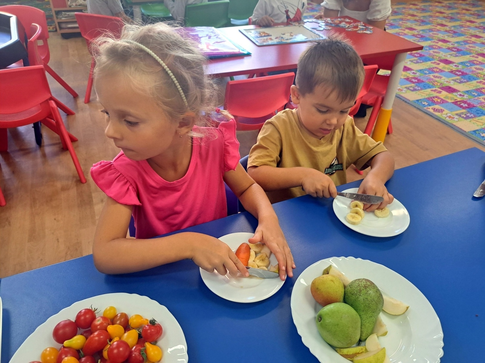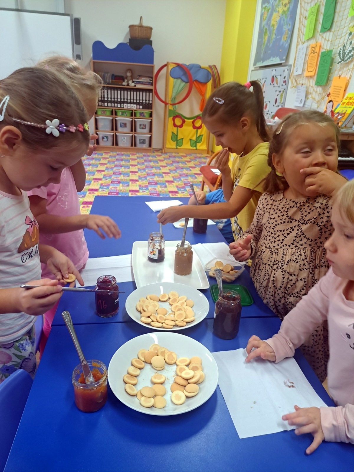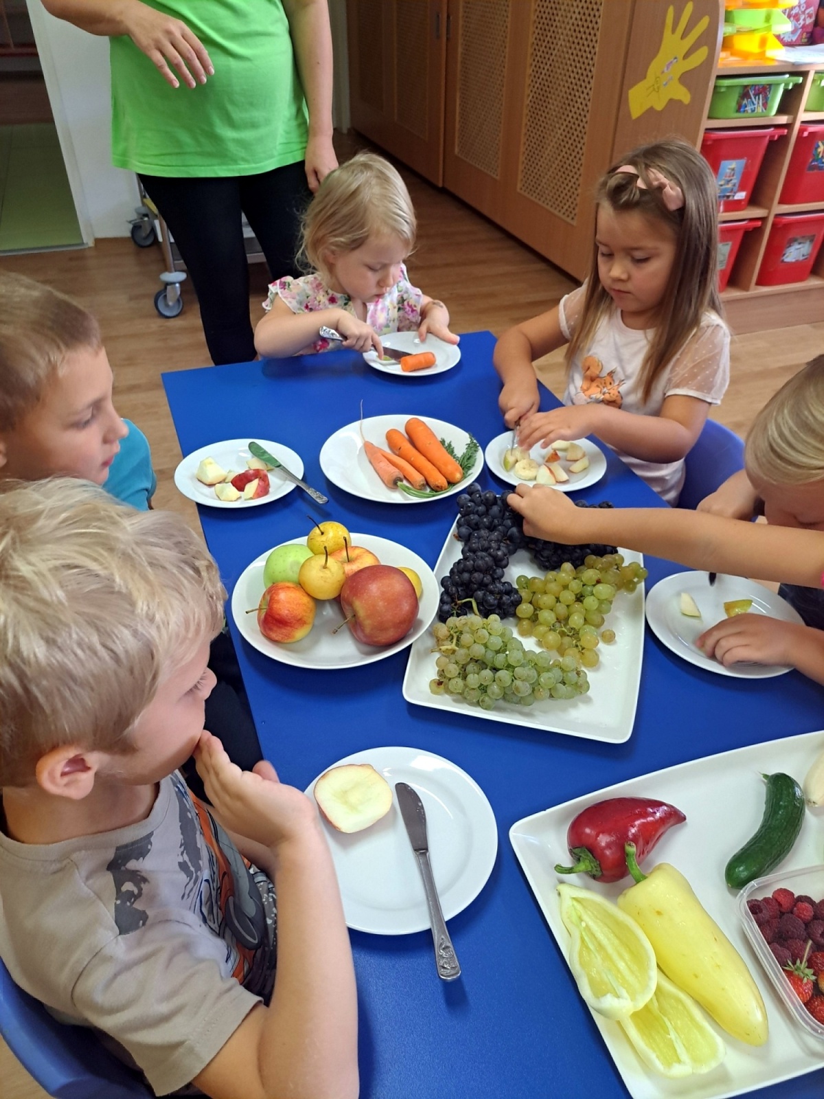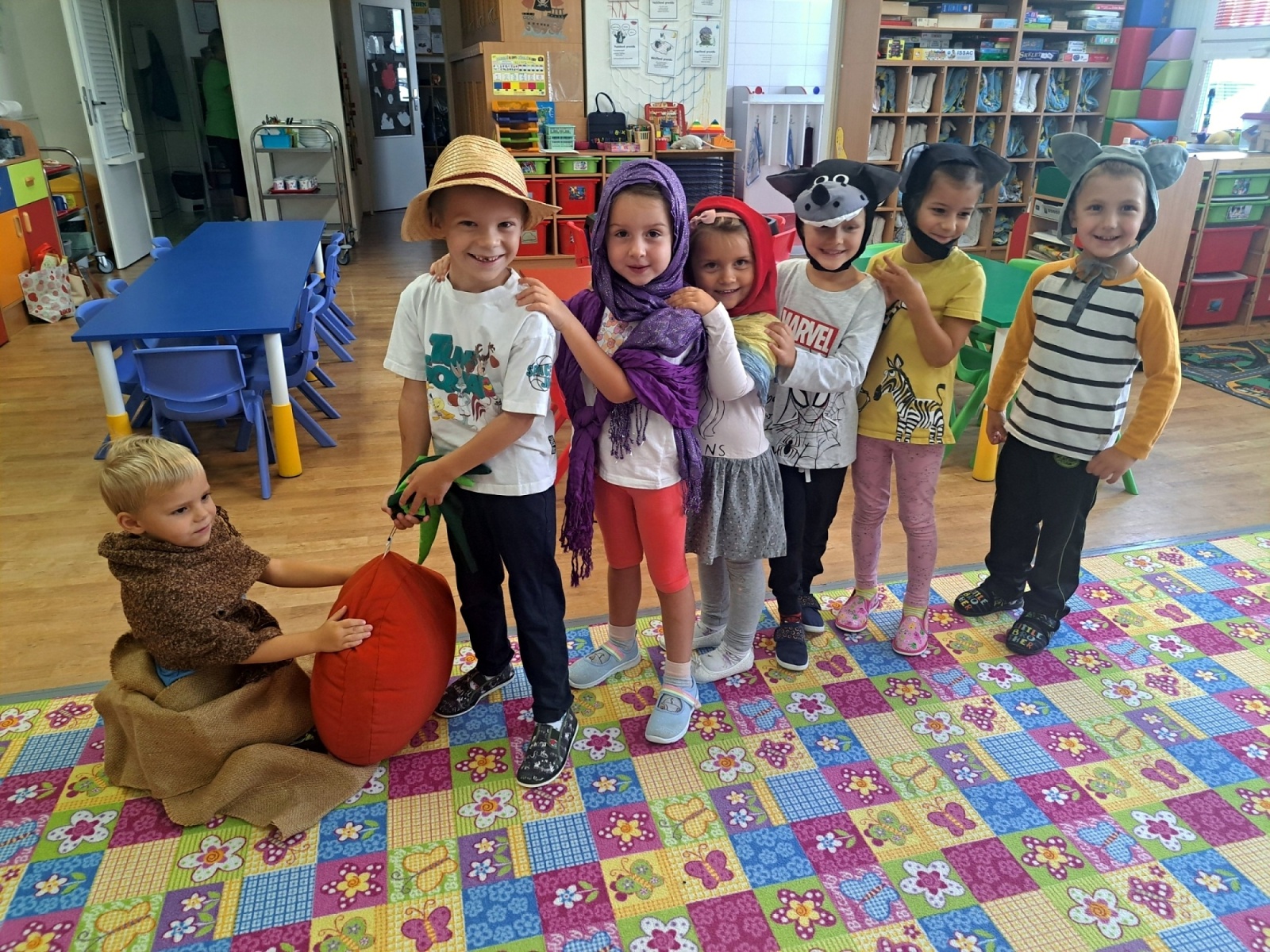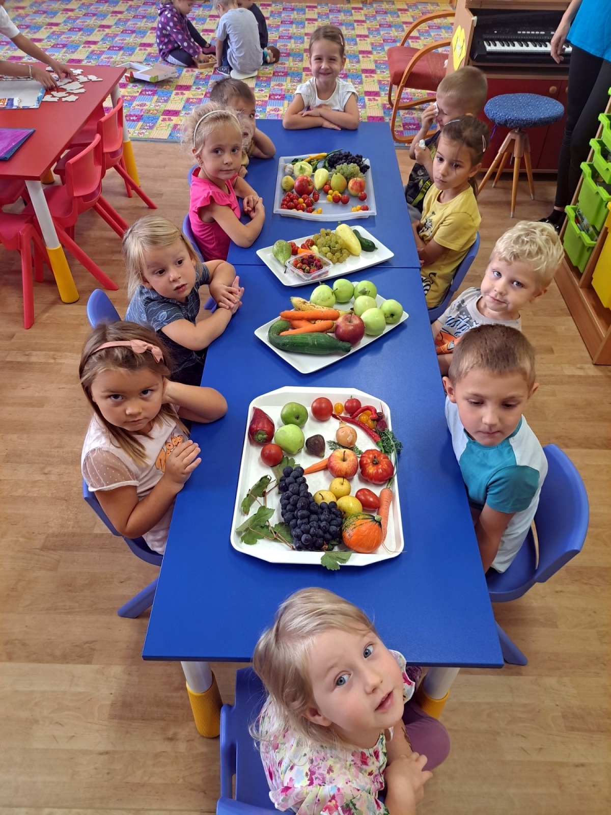 Poznávali jsme ovoce a zeleninu, ochutnávali jsme různé druhy marmelád a společně krájeli ovoce na ovocný salát. Děti přinesly své výpěstky ze zahrádek, ze kterých jsme si udělali výstavku. Společně jsme si zahráli i dramatizaci pohádky O červené řepě.