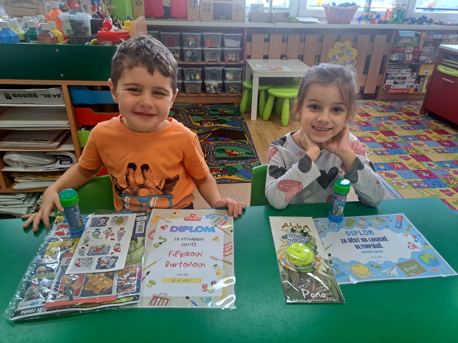Simonka Ziková se zúčastnila Logické olympiády, kde úspěšně reprezentovala naši mateřskou školu. Filípek Bartoň získal 2. místo ve výtvarné soutěži, což je krásný úspěch a velká radost pro nás všechny. Oběma dětem srdečně gratulujeme a děkujeme za skvělou reprezentaci naší školky!