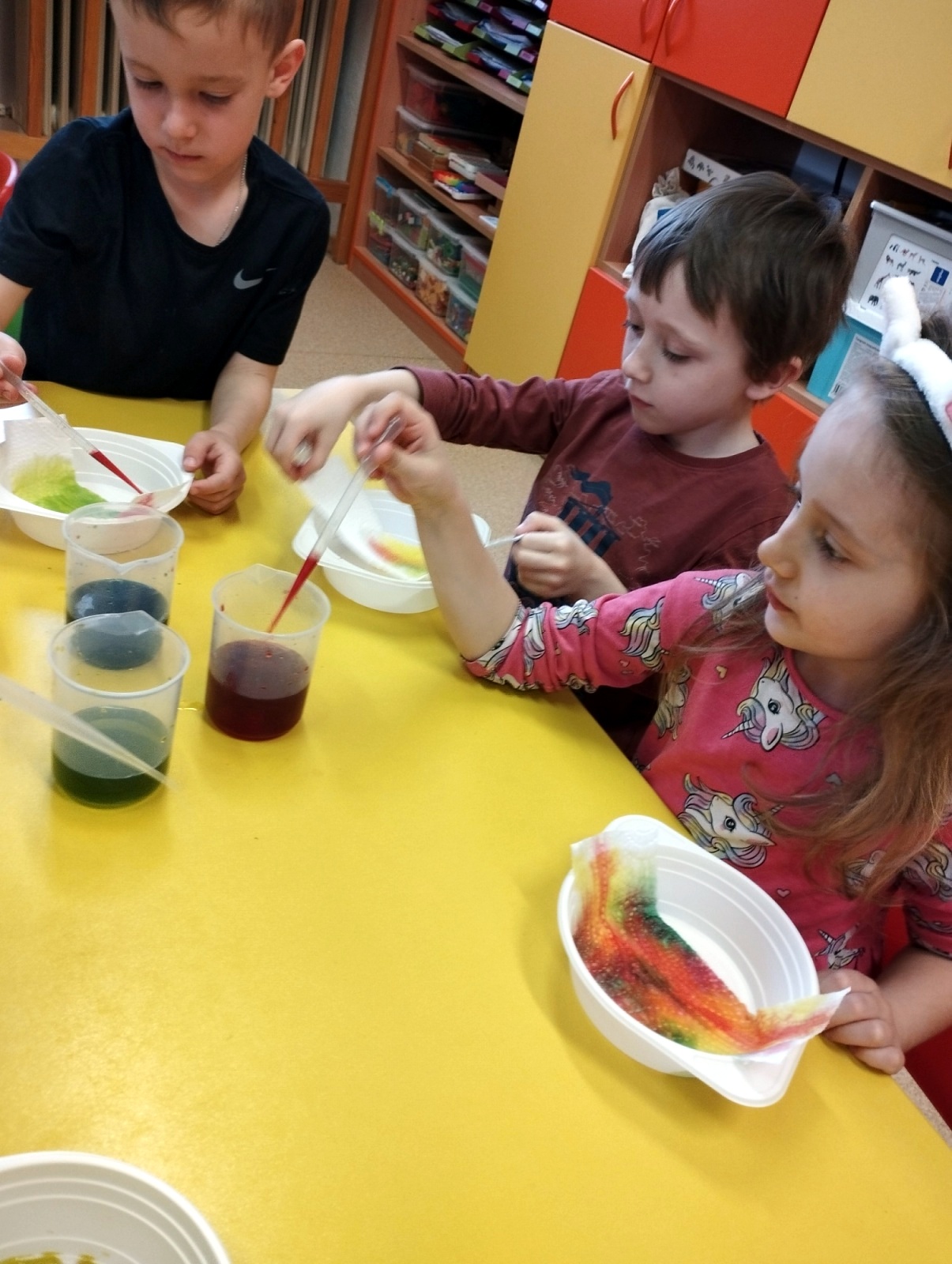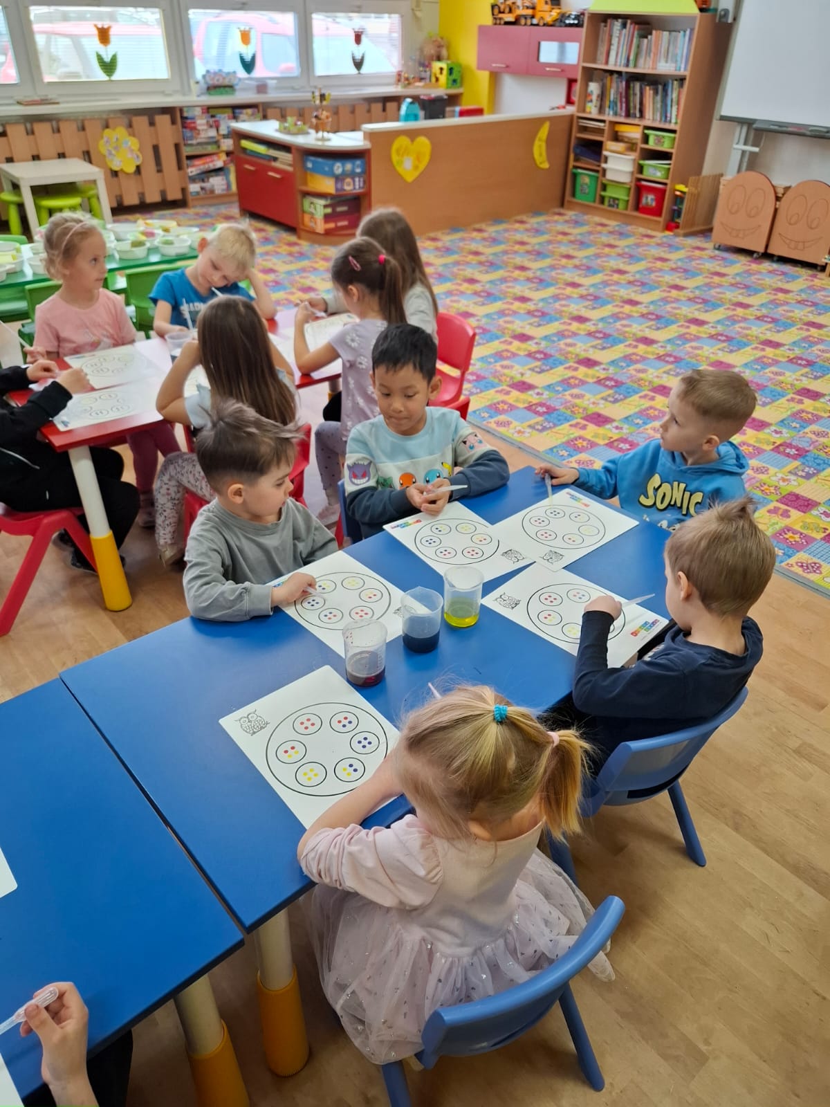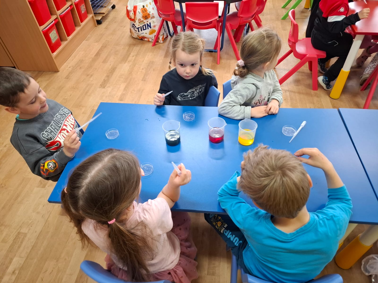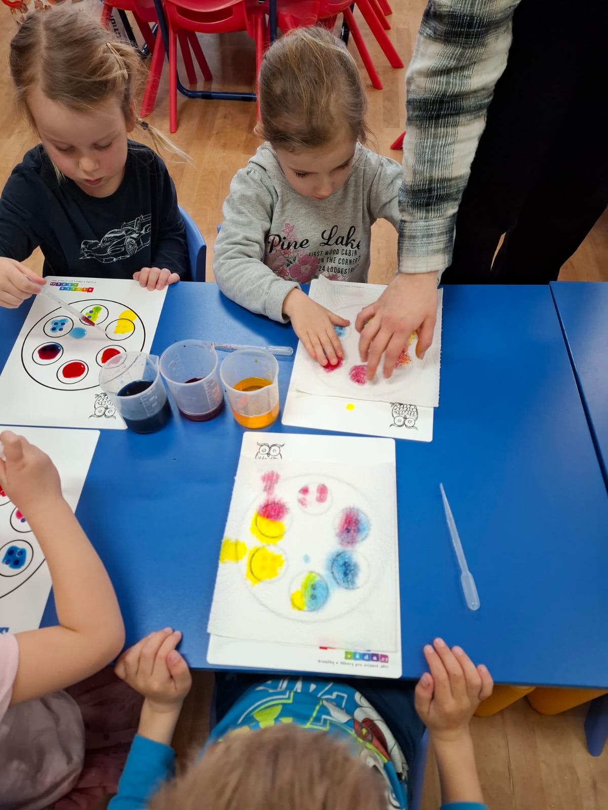 Badatelské pokusy se týkaly míchání, vzniku a rozkladu barev. Děti zkoumaly, jak vznikají nové barvy kombinací základních barev, jak se barvy oddělují nebo mísí. Při pokusech si procvičily manipulaci s pipetou a zkumavkou. Všechny děti měly možnost proměnit se v badatele a vyzkoušet si fascinující jev – míchání barev.