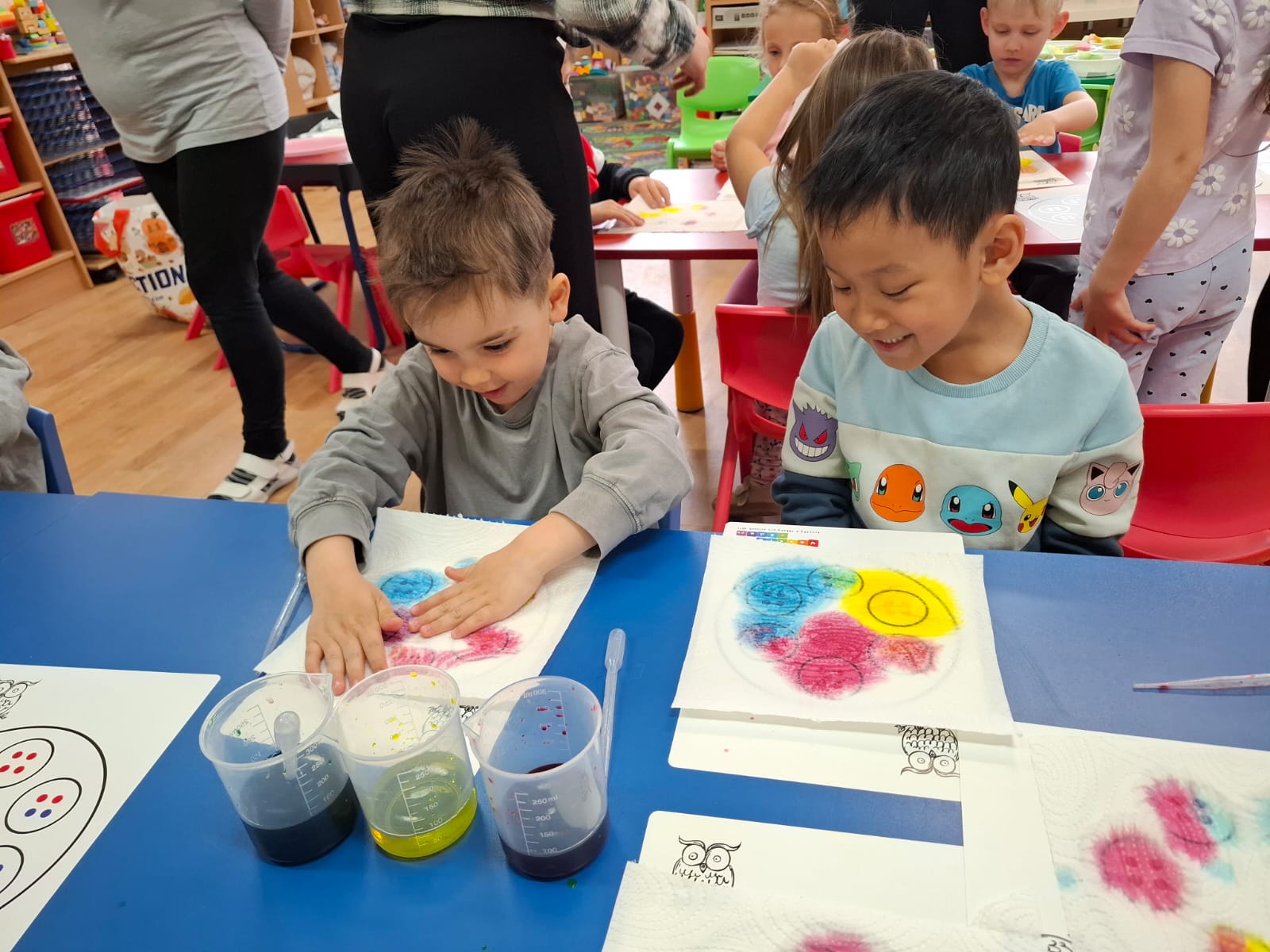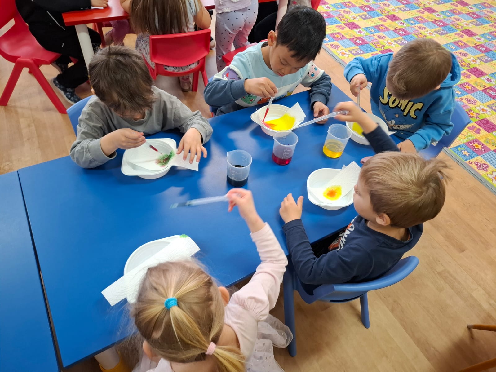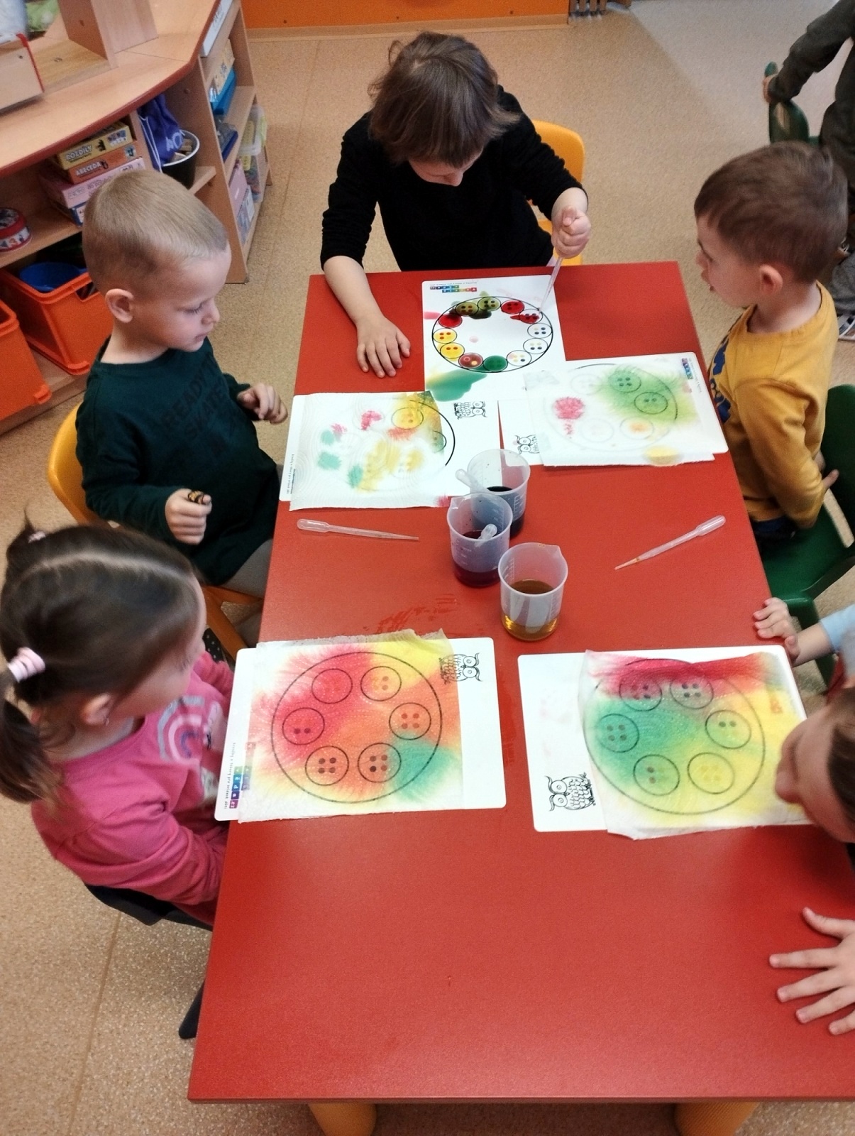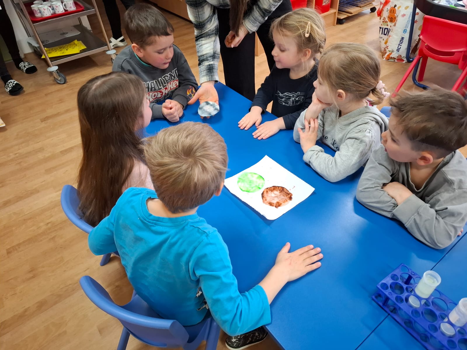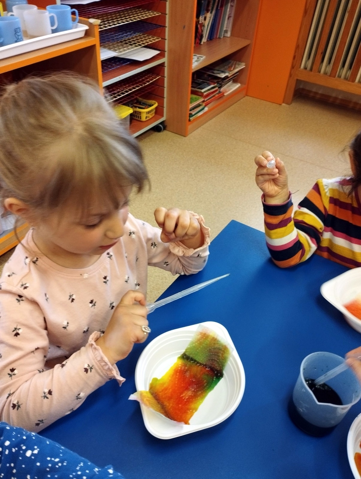 Badatelské pokusy se týkaly míchání, vzniku a rozkladu barev. Děti zkoumaly, jak vznikají nové barvy kombinací základních barev, jak se barvy oddělují nebo mísí. Při pokusech si procvičily manipulaci s pipetou a zkumavkou. Všechny děti měly možnost proměnit se v badatele a vyzkoušet si fascinující jev – míchání barev.