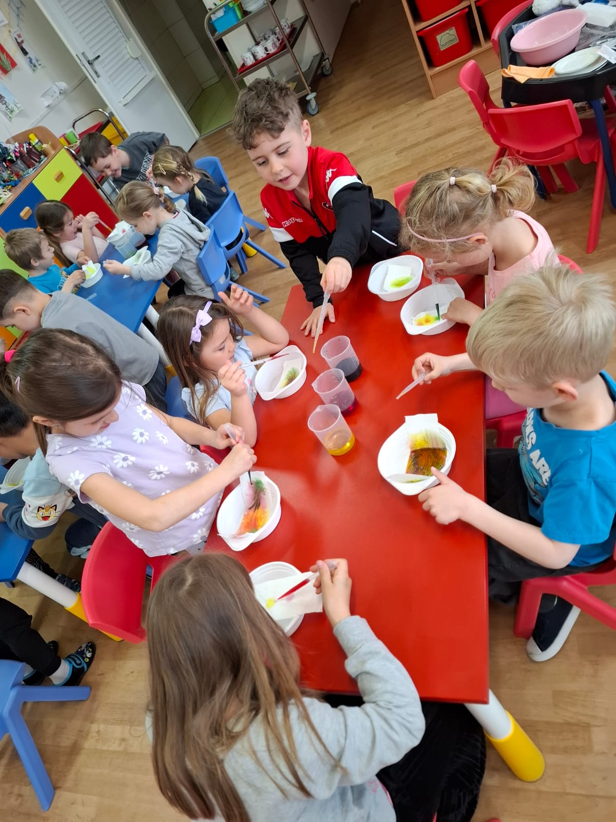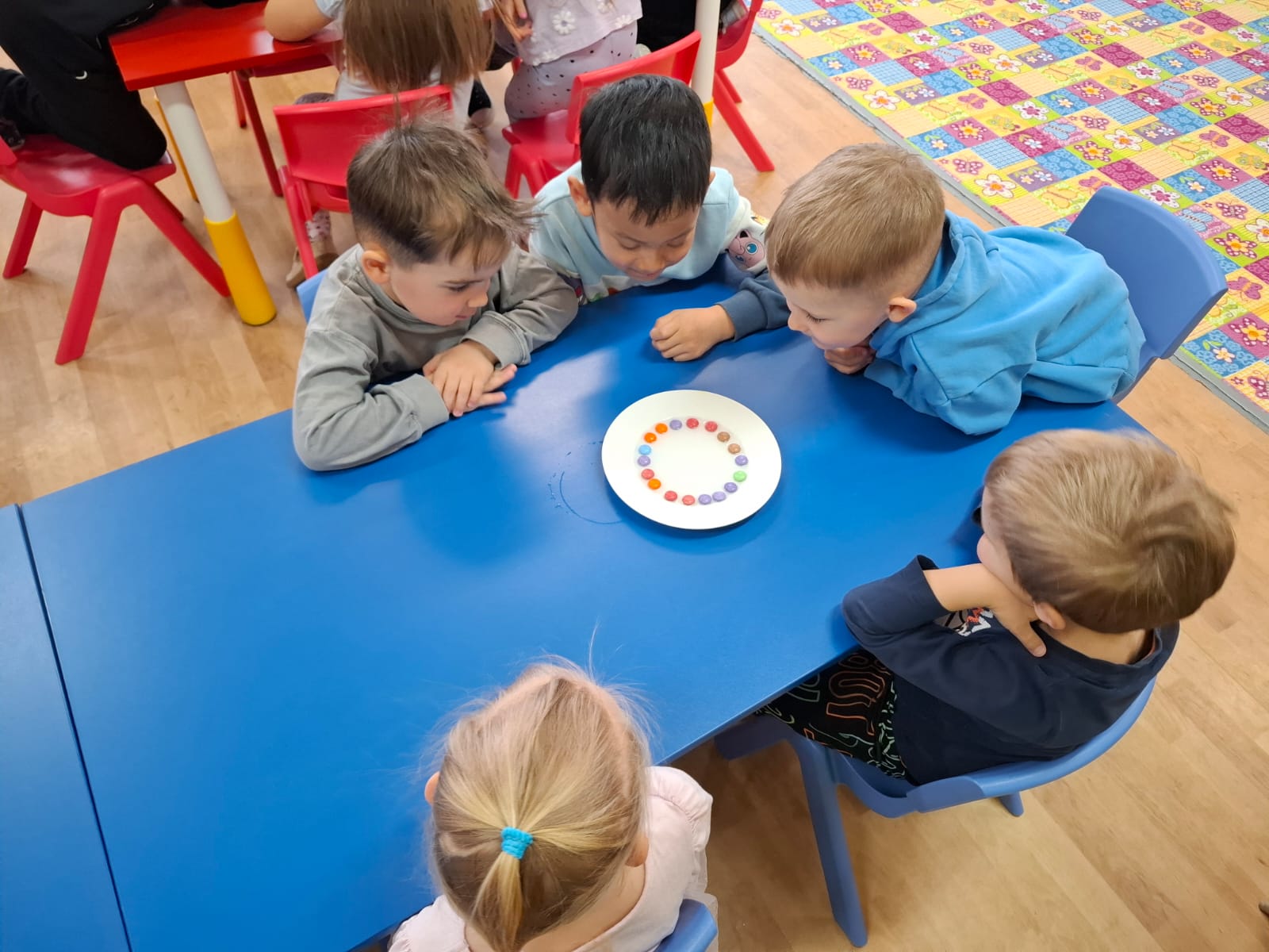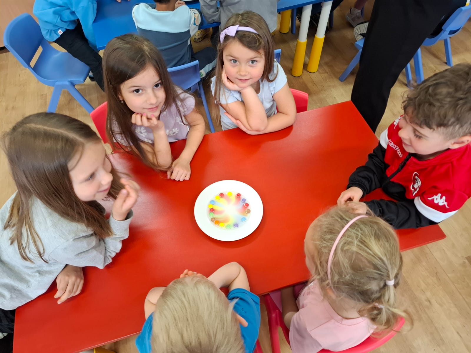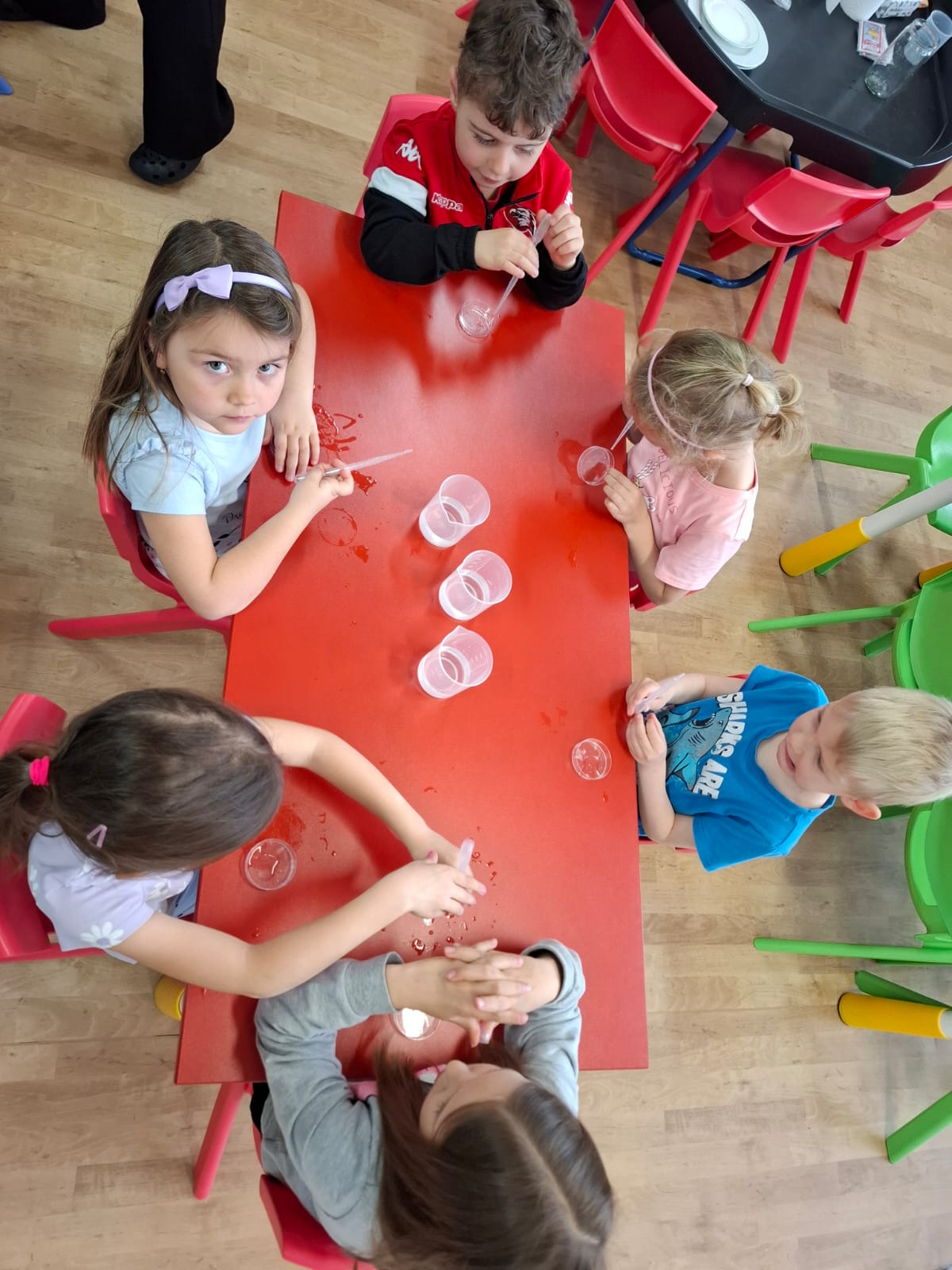 Badatelské pokusy se týkaly míchání, vzniku a rozkladu barev. Děti zkoumaly, jak vznikají nové barvy kombinací základních barev, jak se barvy oddělují nebo mísí. Při pokusech si procvičily manipulaci s pipetou a zkumavkou. Všechny děti měly možnost proměnit se v badatele a vyzkoušet si fascinující jev – míchání barev.