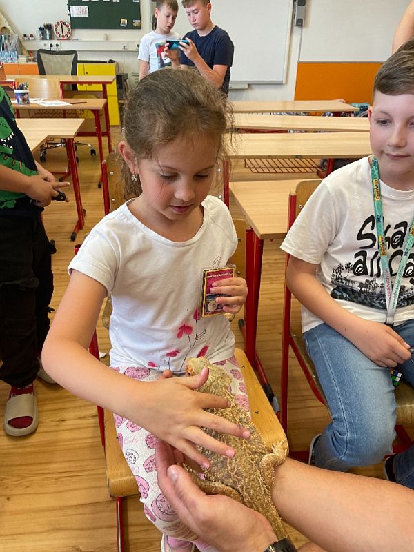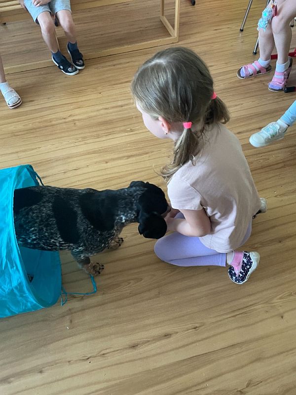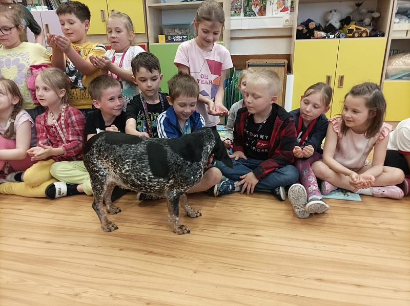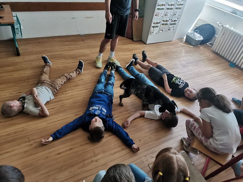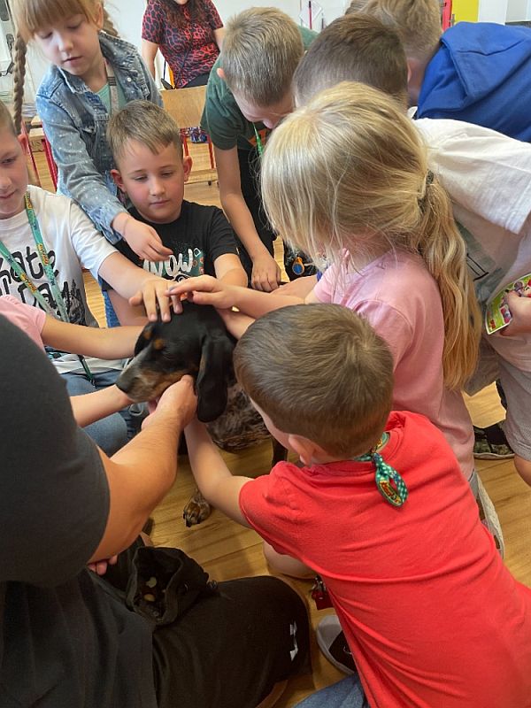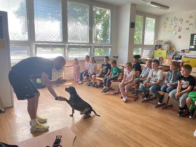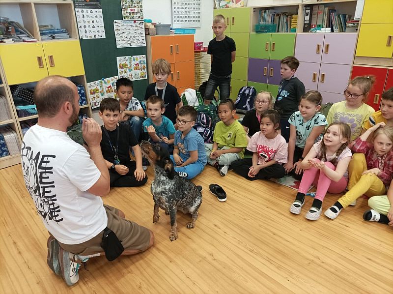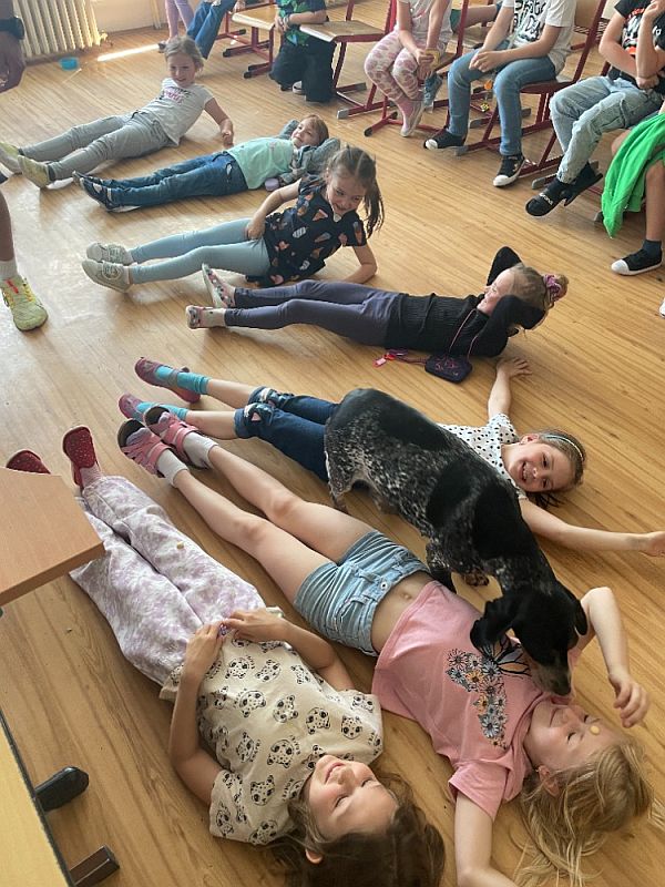 Oddělení školní družiny navštívil pan Petr Malačka se svou vycvičenou fenkou Kat. Dětem vysvětlil, jak canisterapie funguje a společně s Kat nám předvedli různé povely. Dětem se tento neobvyklý zážitek moc líbil. Kat byla opravdu šikovná a od dětí dostala spoustu pamlsků.