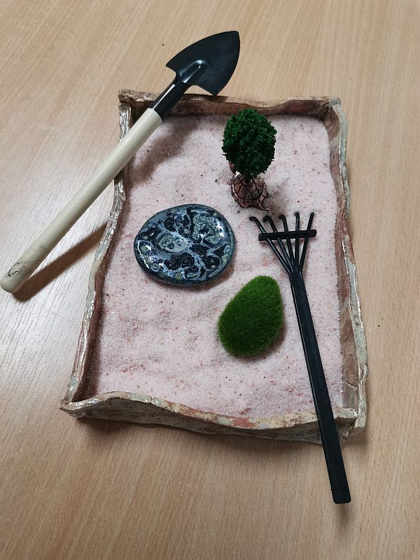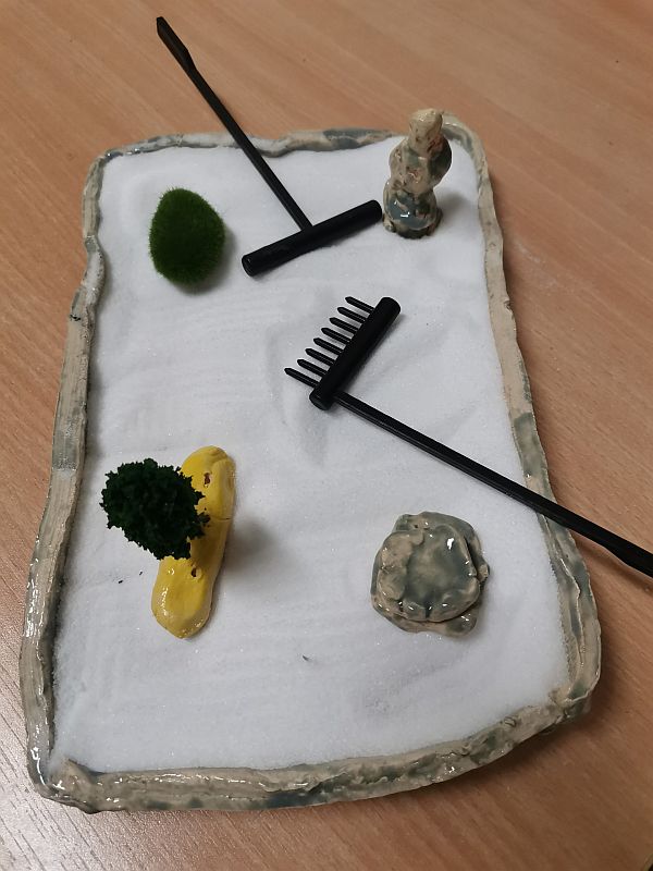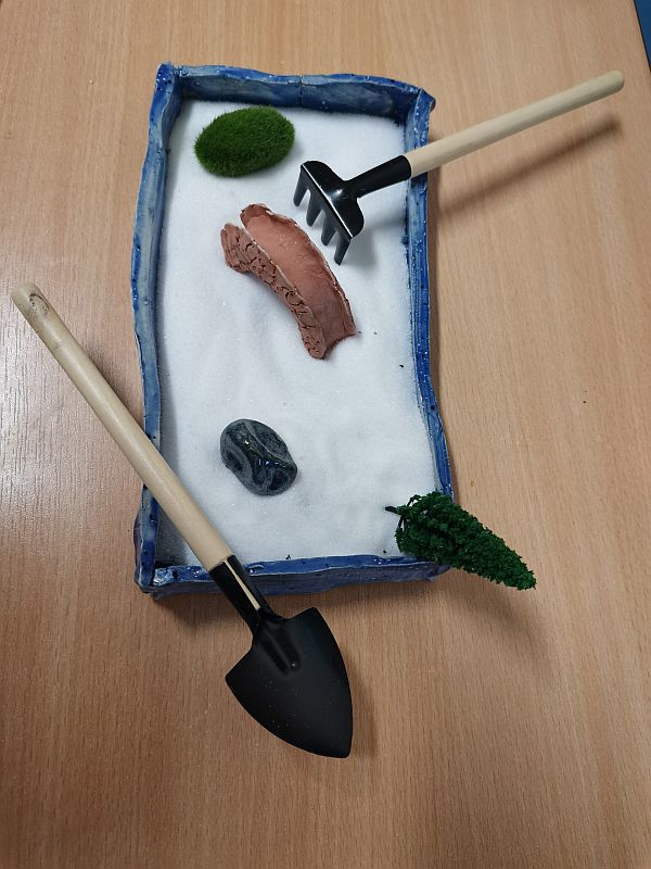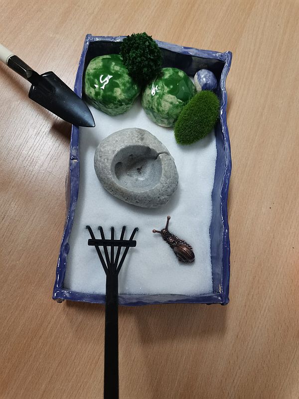 Tento školní rok jsme si naplánovali projekt “zenová zahrádka” a všichni jsme na něm pilně pracovali. Zjistili jsme, jak se tvoří čtvercové a obdélníkové tácky (což byl ten nejtěžší úkol). Naučili jsme se vytvořit kamínky do zahrádek. Každý si naplánoval a vytvořil přesně to, co pro svoji zenovou zahrádku potřeboval. Vznikly nám kreativní předměty jako: sedící Budha, různé altánky a mostky, stojánky na vonné tyčinky, svícínky, či plující drak. Zahrádky jsme si naplnili jemným pískem, ozdobili všemi našimi dalšími výtvory, dozdobili malými stromečky, svíčkami nebo mechovými kamínky a pomocí speciálního náčiní v podobě různých lopatiček, hrabítek a uhlazovátek, si s nimi budeme ve volných chvílích hrát a hezky se u toho zrelaxujeme. Výrobu zenových zahrádek jsme si moc užili a už přemýšlíme nad dalším projektem v novém školním roce. Jak se říká: “Fantazii se meze nekladou”, takže další projekt může být opět velká výzva.