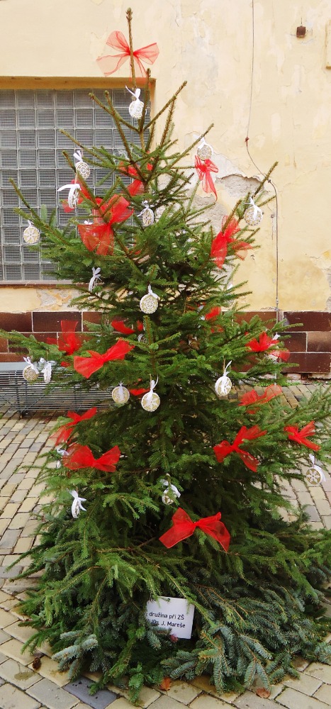 Letos nově jsou stromečky umístěny nejen na ulici Obrokova – zde je zdobí mateřské školky, ale i na ulici Hradní – a právě tady najdete svátečně ustrojený stromeček naší školní družiny.